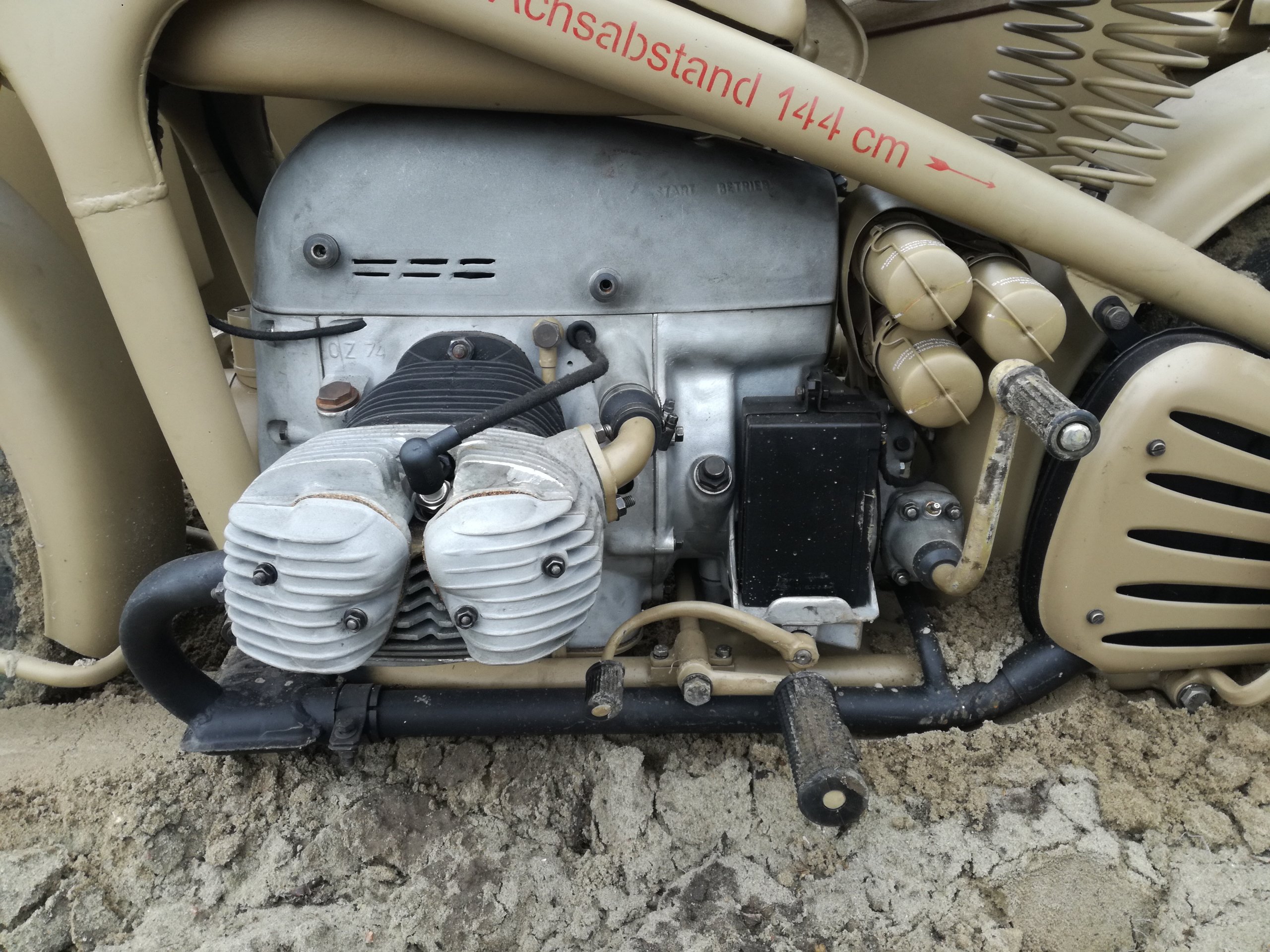 Le moteur est un bicylindre en V boxer de 751cm3 (alésage 75mm, course 85mm), avec chambres de combustion hémisphériques et un taux de compression de 1:6,2. Les cylindres sont relevés de 5° (c'est donc un moteur à 170°) pour obtenir une garde au sol accrue sous les cylindres. Le moteur n'a pas été conçu pour développer une puissance élevée avec 26ch à 4'000tr/mn. Le couple maximal de 52Nm est atteint à 2'650tr/mn. La culasse en aluminium est fortement ailetée (elle possède une grande surface), de sorte que le refroidissement est suffisant, même à basse vitesse. Les 3 paliers de vilebrequin sont sur roulements pour avoir une durée de vie plus longue avec une résistance au frottement diminuée. L'arbre à cames et la pompe à huile à piston entraînés par des engrenages reçoivent le mouvement du vilebrequin. L'embrayage est de type double disque à sec. Le carburateur est un Solex BFR de 30mm de diamètre, l'allumage fait appel à une magnéto, soit Noris ZG 2, soit Bosch FJ 2R 134.