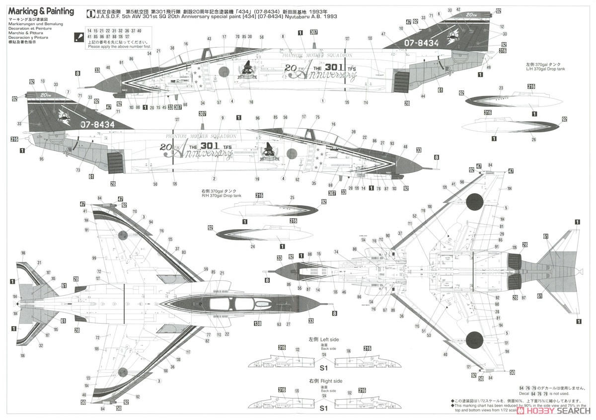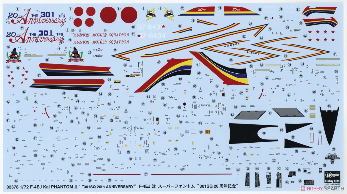 La maquette mesure environ 27cm de longueur et 16cm de largeur une fois assemblé. Elle comporte 117 pièces. La marquage commémoratif est pour le 20e anniversaire de l'unité qui a été dévoilée en 1993. Le kit contient le décal : Air Self-Defense Force 5th Air Corps 301st Squadron 20th Anniversary Painting Machine "434" (Nittahara Base 1993)