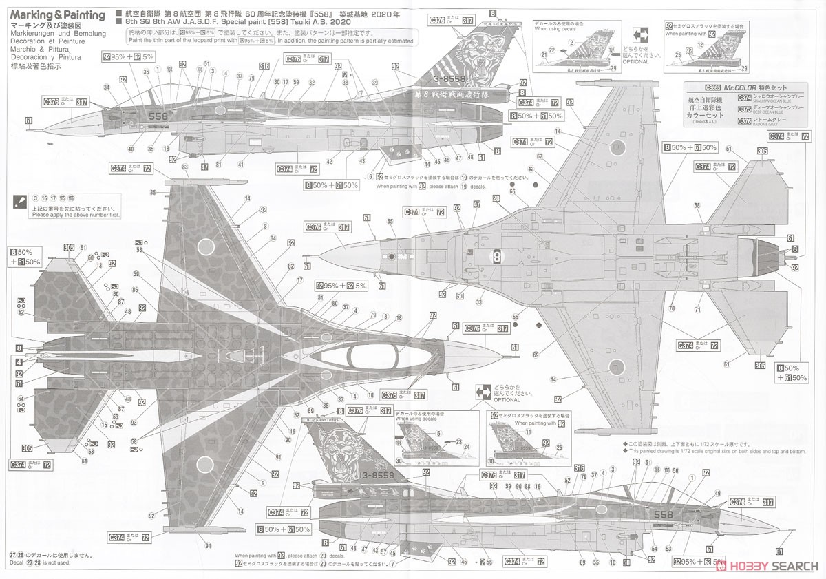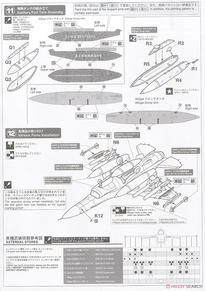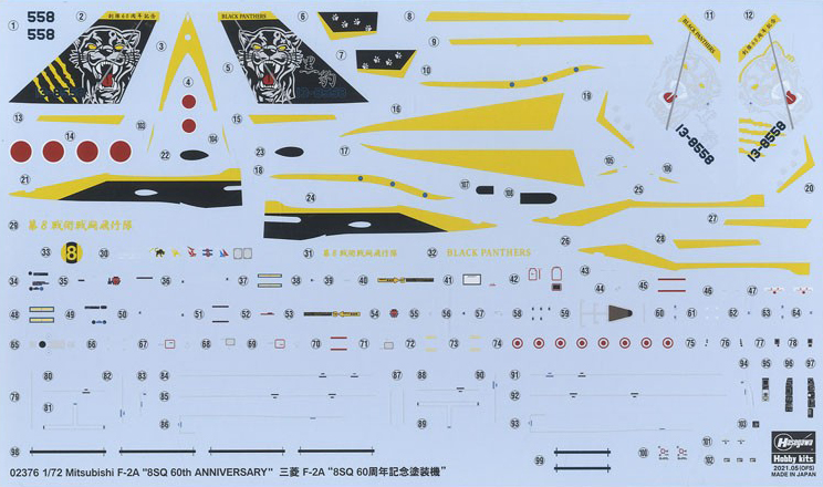 Ce kit limité de Hasegawa comprend de tout nouveaux décalcomanies ! Confirmée à la fin de l'année dernière, la version peinture spéciale du Mitsubishi F-2A piloté par le 8th Squadron Black Panthers est désormais disponible en kit. Les marquages successifs des unités se trouvent sous le côté droit du stabilisateur vertical. La maquette assemblée mesure 209mm de long et 156mm de large. Le kit comporte 128 pièces.