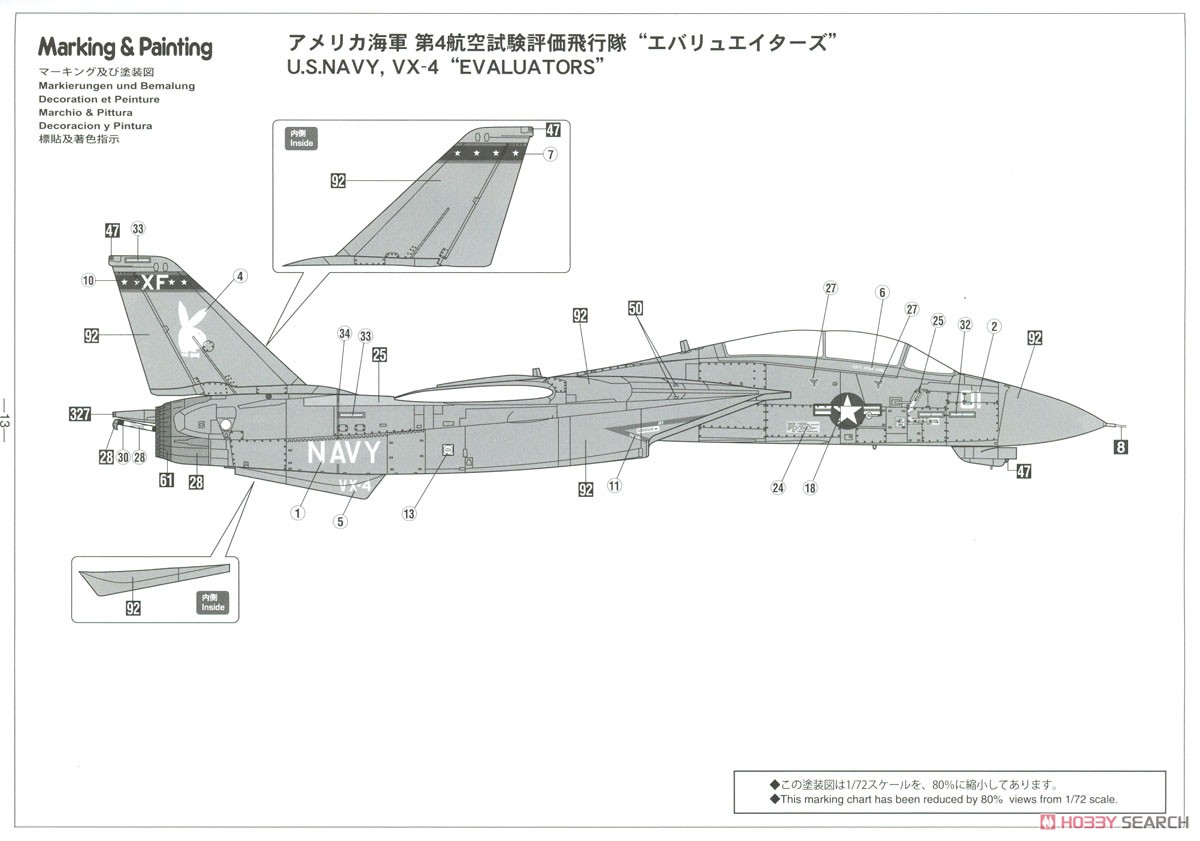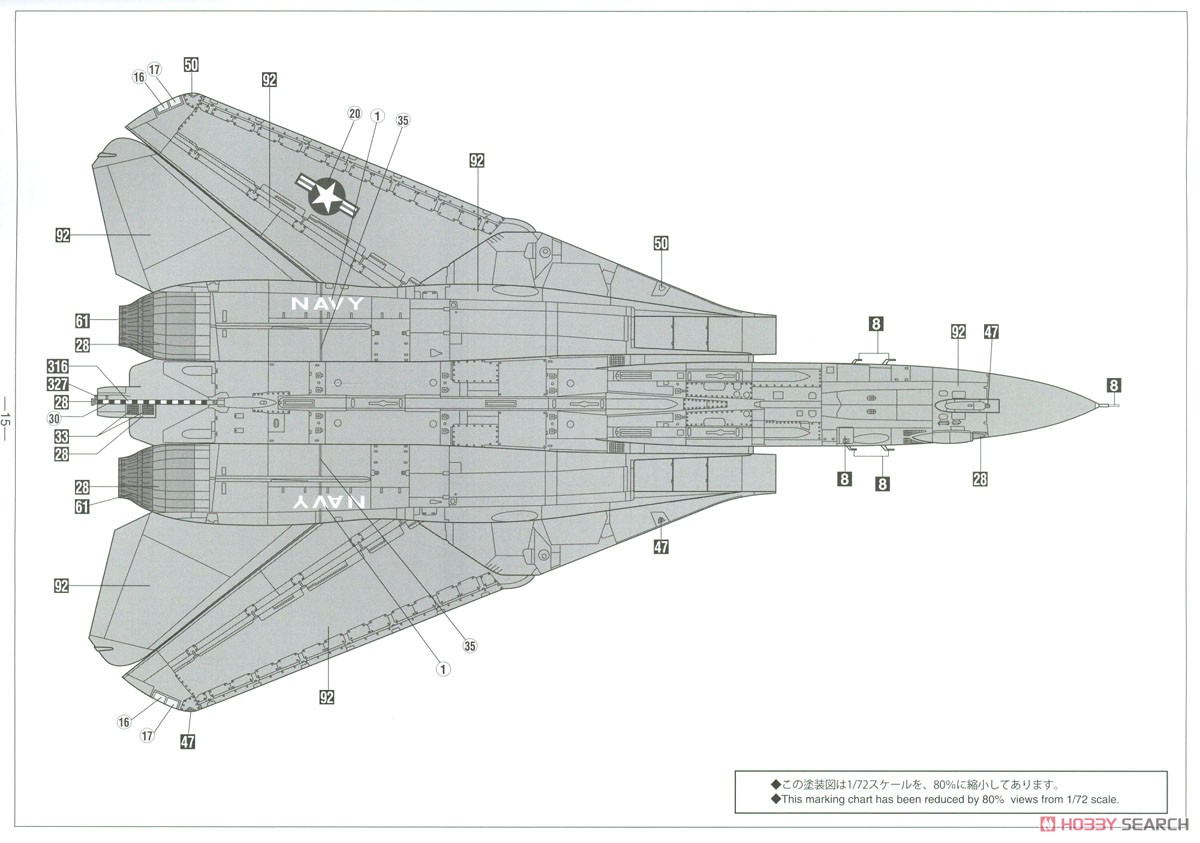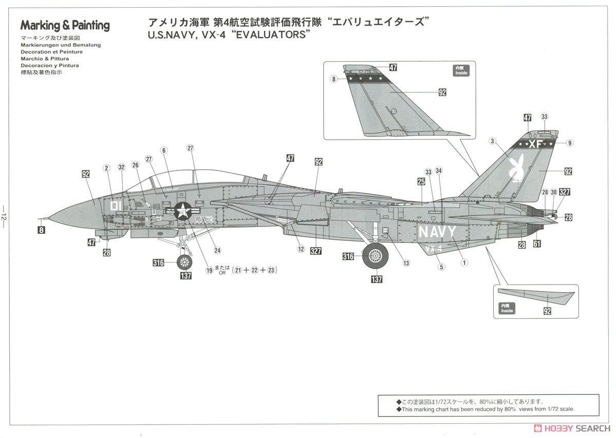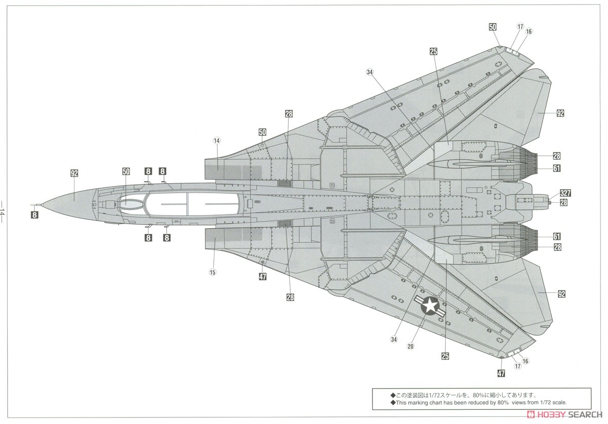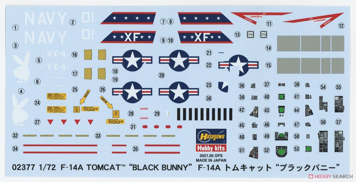 Hasegawa nous apporte un kit du F-14A Tomcat 'Black Bunny' de l'escadron 'Evaluators' de l'U.S. Navy VX-4. Les grappes sont de couleur noire. La maquette assemblée mesure 266mm de long et 271mm de large. Le kit comporte 209 pièces. M. Kato est en charge de l'illustration de l'emballage.