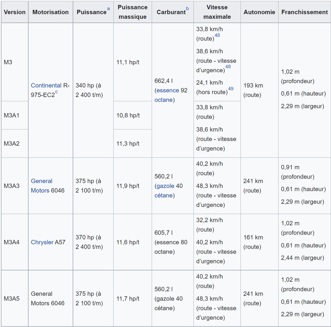 Les M3, M3A1 et M3A2 disposent d’un moteur en étoile à 9 cylindres Continental R-975-EC1 ou EC231. L’emploi de ce moteur était toutefois problématique, dans le sens où il était également utilisé par l’aviation, conduisant à des pénuries fréquentes. Un premier essai pour le remplacer par un moteur Diesel est réalisé sur le M3A1, mais la tentative est abandonnée après seulement 28 véhicules, le moteur Guiberson T-14090-2 se révélant peu fiable. Un autre essai, cette fois couronné de succès, a lieu en mars 1942, le moteur choisi étant cette fois un General Motors Model 6046, constitué de 2 moteurs de bus assemblés. Cette disposition donne naissance à 2 versions : le M3A3, lorsque ce moteur est installé sur une caisse soudée, et M3A5 lorsqu’il est installé sur une caisse rivetée. De son côté, le M3A4, entré en production en juin 1942 est doté d’un moteur Chrysler A57, constitué de 5 moteurs de bus assemblés en étoile et développant 425hp.