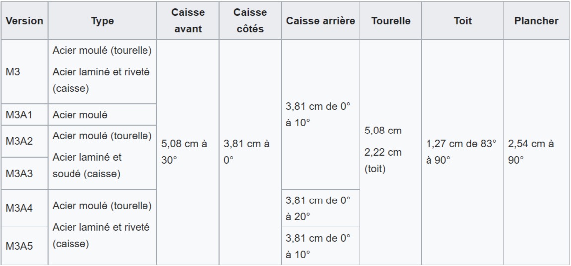 En dehors de ce défaut, le blindage était correct en comparaison avec la plupart des blindés rencontrés au début de la campagne d’Afrique du Nord ou dans le Pacifique. Malgré un blindage latéral assez faible, l’avant était bien protégé, l’épaisseur étant équivalente à 11,11cm en prenant en compte l’inclinaison du glacis, suffisant pour protéger des petits canons antichars allemands. La faiblesse majeure du M3 venait de sa propension à prendre feu et à exploser lorsqu’il était pénétré par un projectile. Cette vulnérabilité était liée à l’abondance de munitions stockées sans protection particulière partout dans le compartiment de combat, ainsi qu’à la minceur du blindage supposé protéger le moteur et les réservoirs de carburant.