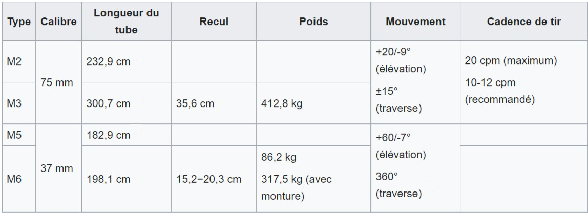 Initialement dépourvu de stabilisateur, le M2 en reçoit un permettant la stabilisation sur un axe à partir de novembre 1941. Ce dispositif requiert cependant l’installation d’un contrepoids à l’extrémité du canon pour mieux équilibrer l’arme. Le M3 est stabilisé dès l’origine et n’a pas besoin de contrepoids du fait de la longueur plus importante du tube déportant le point d’équilibre vers l’avant. La monture est la même pour les 2 versions et permet une élévation de +20°, une dépression de -9° et une traverse de 15° de chaque côté de l’axe.