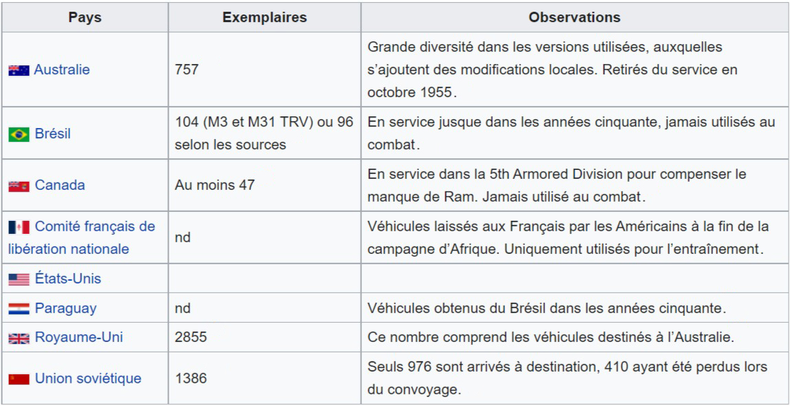 Conçu pour l’armée américaine, le M3 est également fourni en grandes quantités au Royaume-Uni, dont l’armée a perdu la majeure partie de son matériel en France et est confrontée à une grave pénurie de véhicules blindés. Les Britanniques obtiennent notamment des États-Unis la création d’une variante spéciale pour leur usage, dotée d’une tourelle différente, qu’ils appellent General Grant, par opposition au General Lee, le M3 avec sa tourelle d’origine.