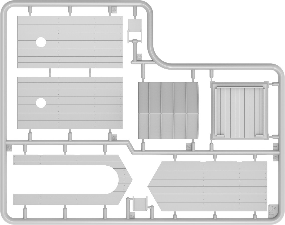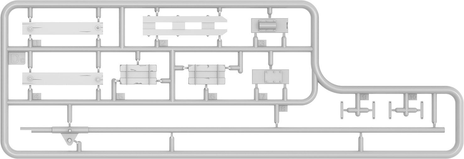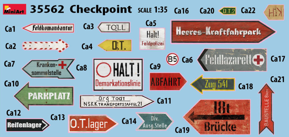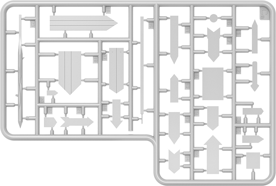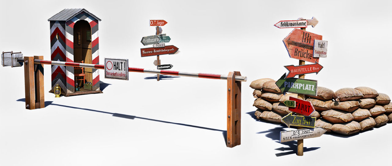 Il s'agit d'un kit de montage de maquettes en plastique à l'échelle 1/35. Le kit contient des modèles de barrière, panneaux de signalisation, guérite et sacs de jute.