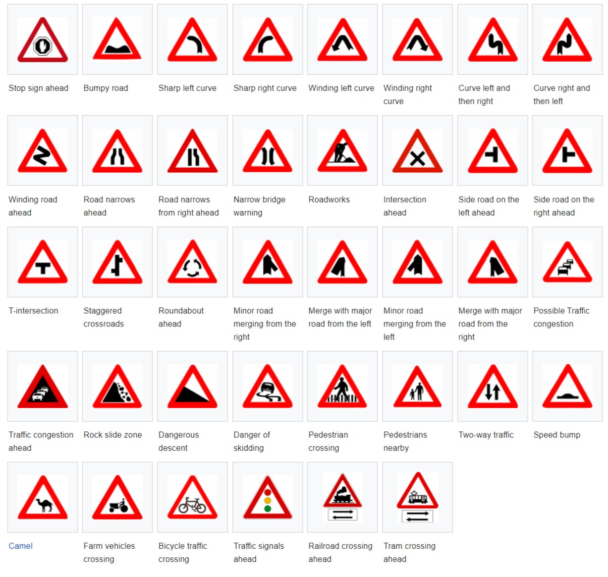Les panneaux avertissant des conditions dangereuses ou des situations dangereuses (par exemple, « Intersection » ou « Une forte pente en avant » portent un symbole noir sur blanc à l'intérieur d'un triangle bordé de rouge (point le plus haut).