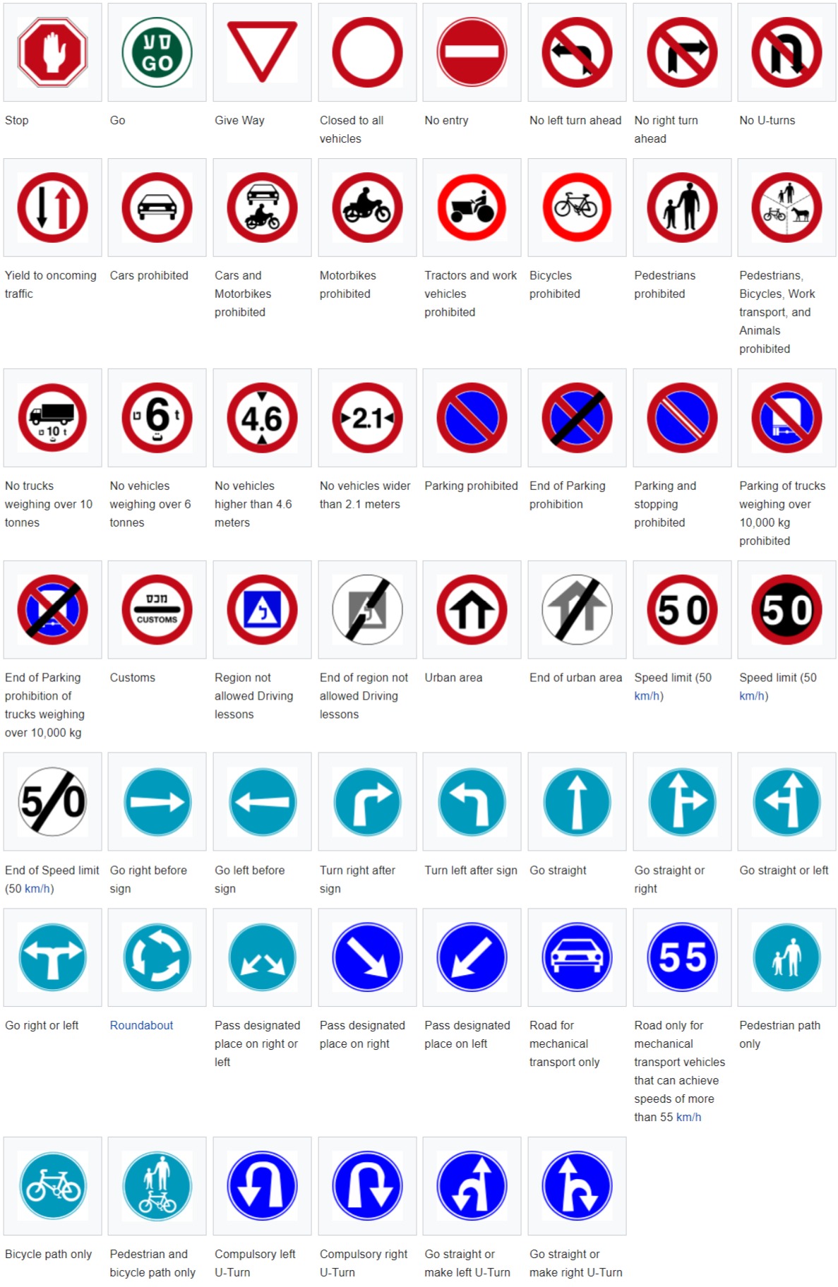 Les panneaux utilisent généralement le même modèle de couleurs, de formes et de symboles que ceux utilisés dans la plupart des pays d'Europe et du Moyen-Orient et définis dans la Convention de Vienne sur la signalisation routière.