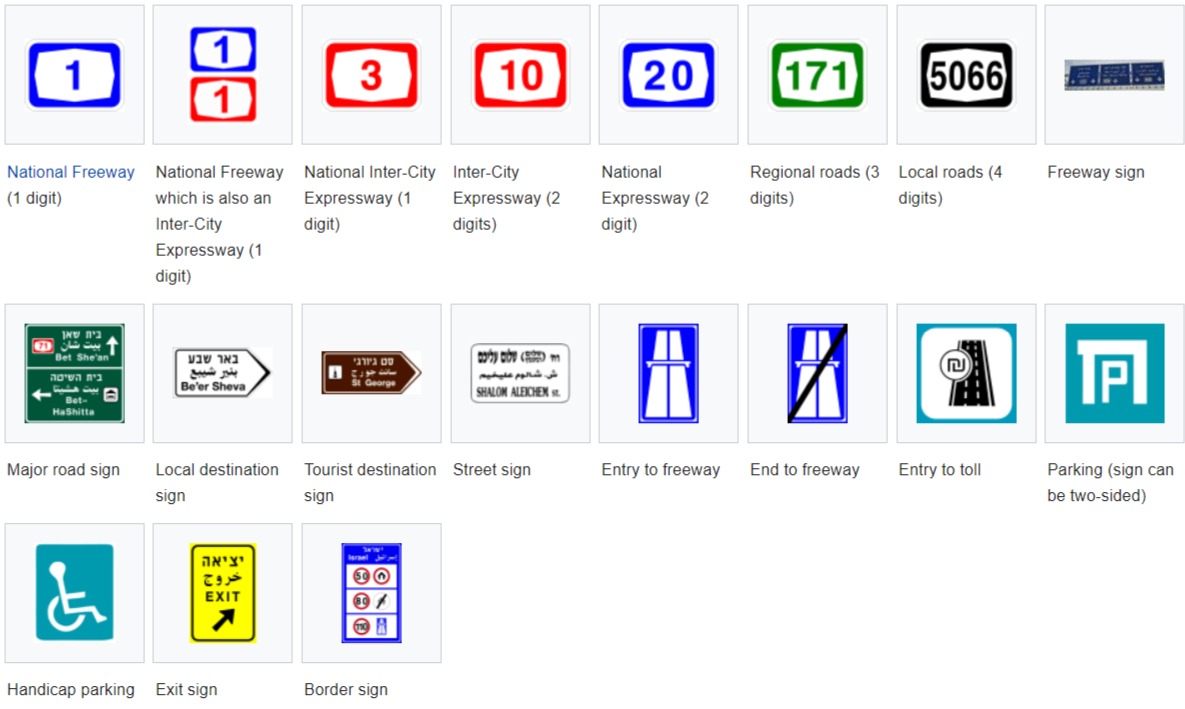 Les panneaux emploient 3 écritures - hébreu, arabe et latin - et sont écrits en hébreu et en arabe, les 2 langues officielles du pays, et en anglais.