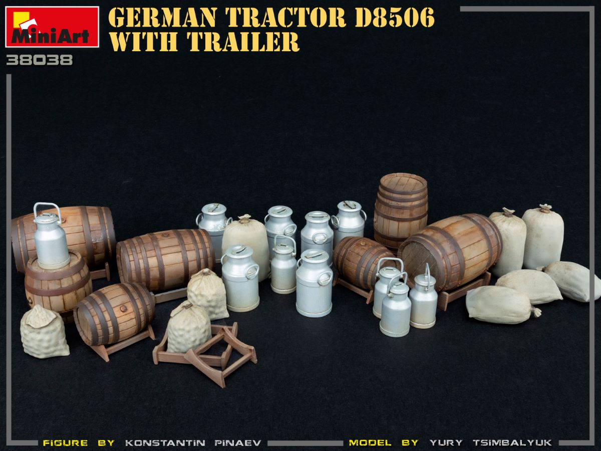 Il s'agit d'un kit de montage de maquette en plastique à l'échelle 1/35. Le kit contient 1 tracteur, 1 remorque, 12 fûts de lait, 7 barils en bois, 9 sacs et 1 figurine.