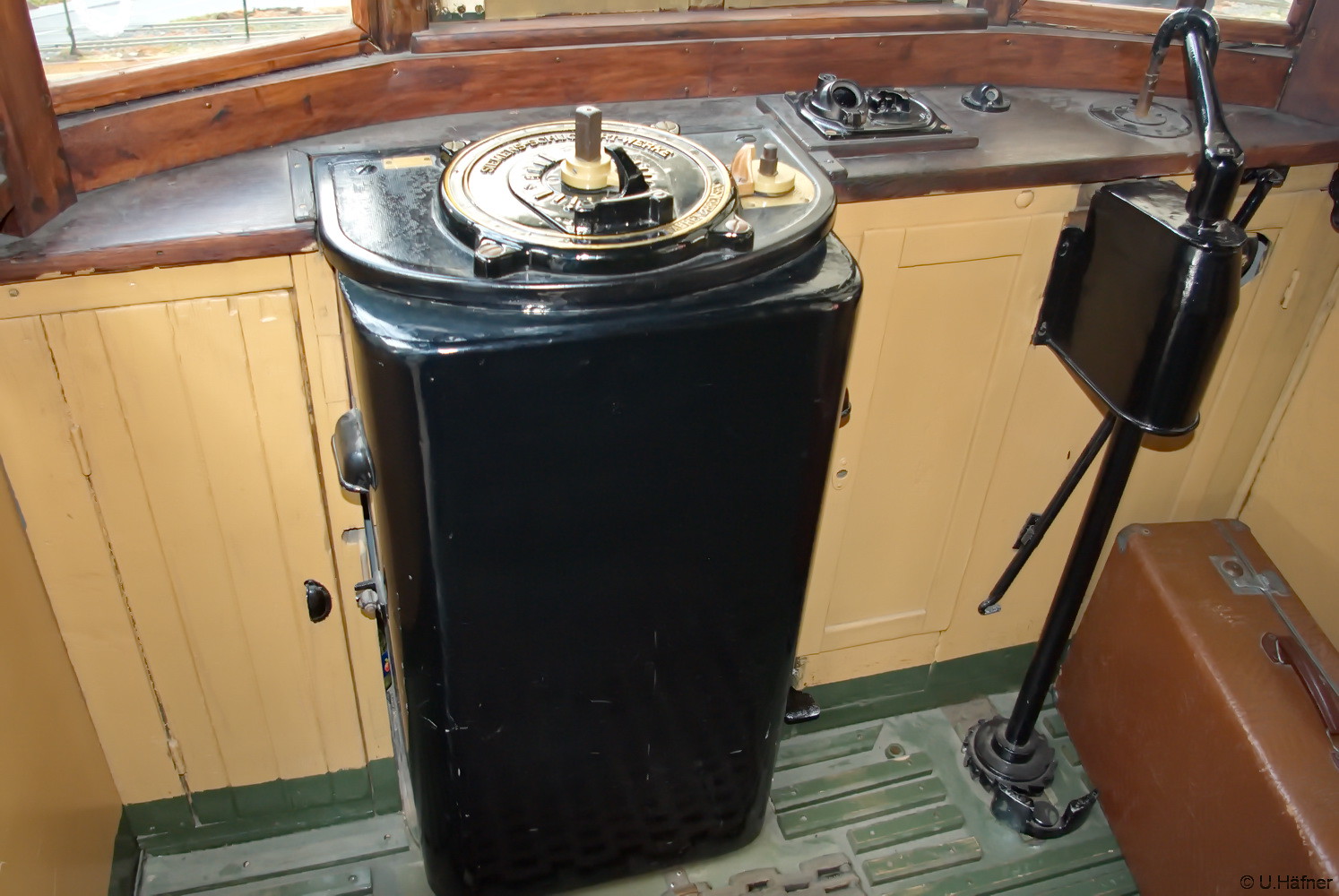 À l’intérieur, nous continuons avec le poste de conduite avec ses commandes. La manivelle de conduite et le levier de commande pour l’essuie-glace n’étaient plus présents sur l’original. En outre, tous les outils n’étaient pas en place (par exemple.B. leviers d’aiguillage), mais sur le modèle, c’est représenté. Certaines parties sont devenues claires, dont j’avais encore parlé à l’European Tram. Dans le poste de conduite, on trouve au plafond une cloche dont la dentelle est servie par une corde qui s’étend jusqu’à l’autre extrémité le long des poignées d’arrêt pour passagers.