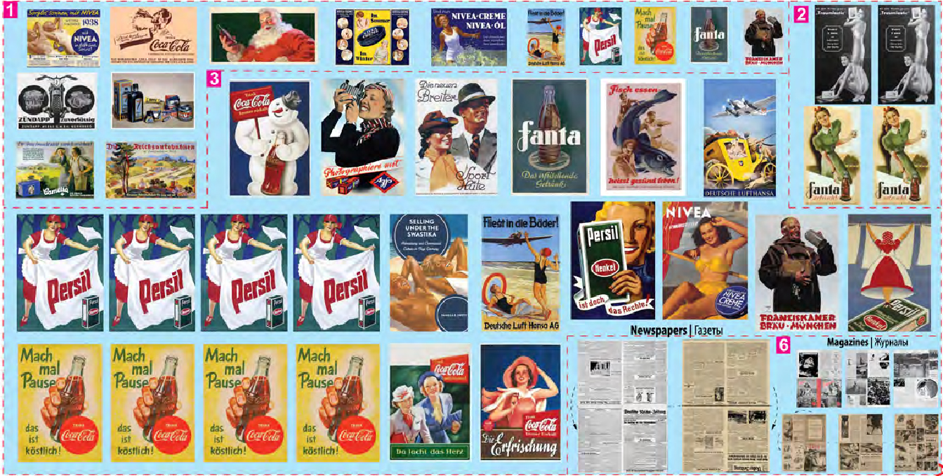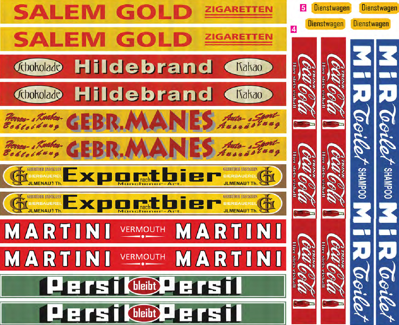 Il existe 6 suggestions de peinture très colorées en couleur brillante (mise à jour 2021 : 9 versions). Les instructions de construction comprennent également des bannières publicitaires et des affiches. La planche de décalcomanies contient également de nombreuses bannières publicitaires. Tout est très bien réussi.