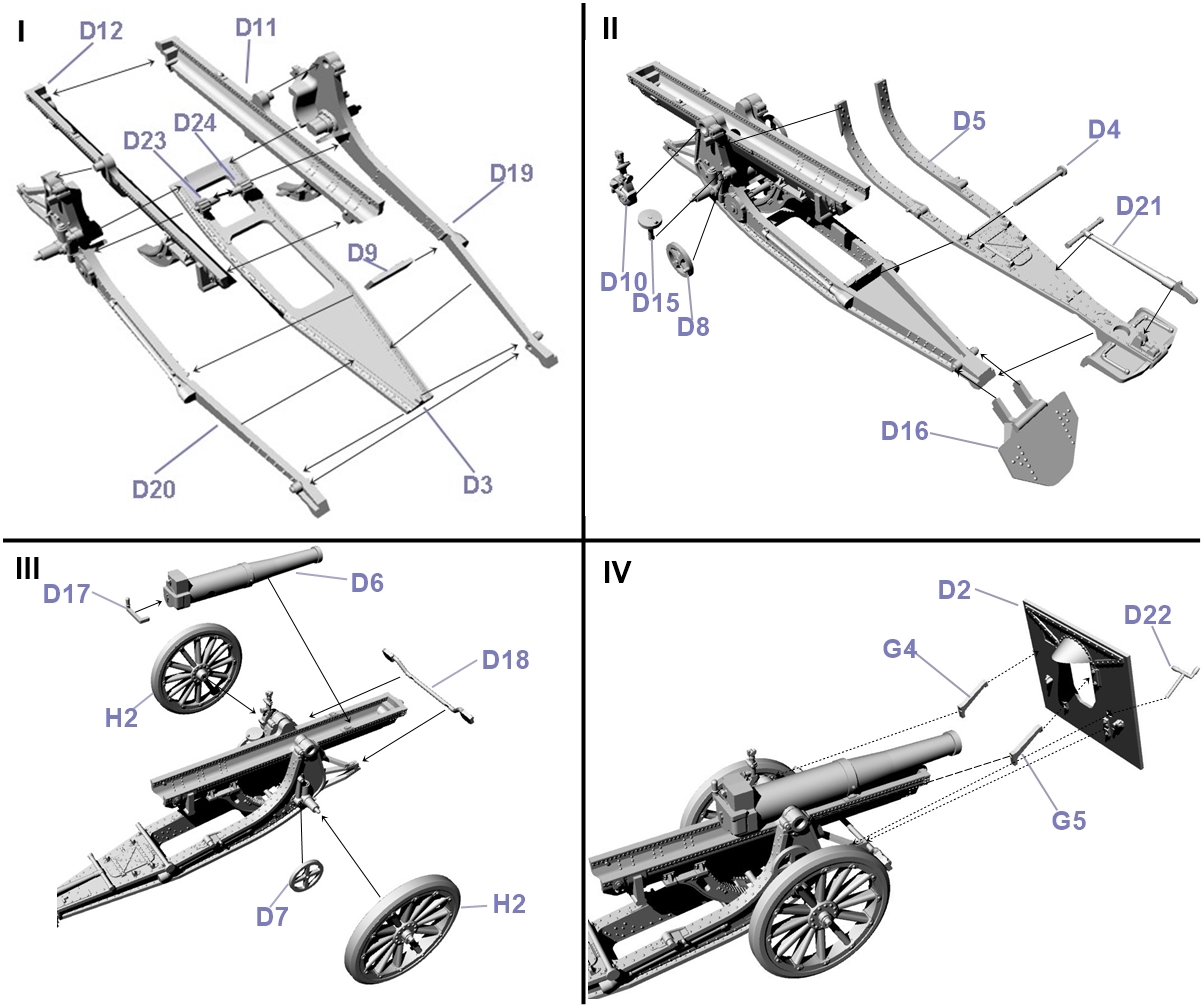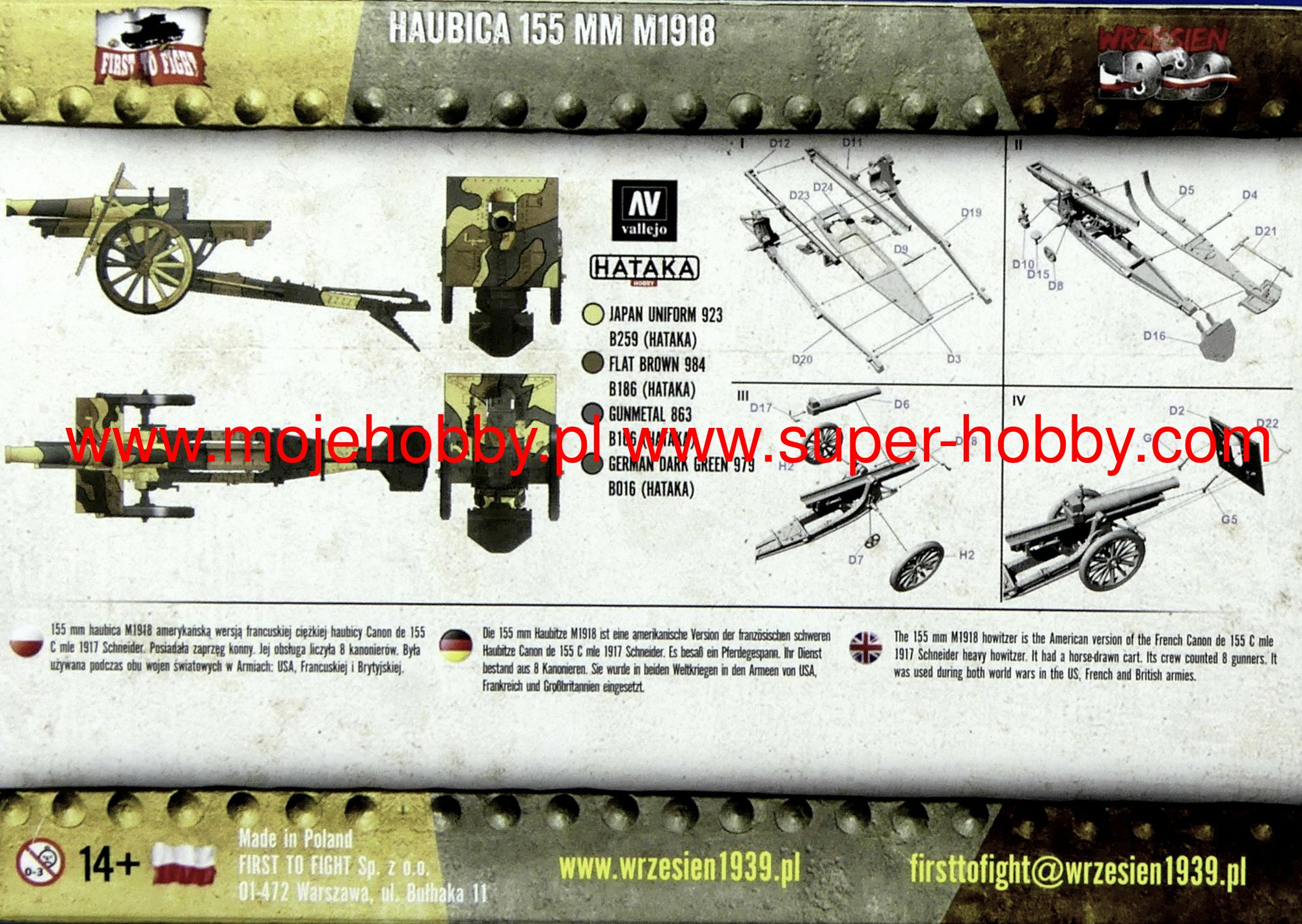 Désignation : sur la boite du kit, on lit « Haubica 155mm M1918 » | mais sur la plupart des sites Web même sur celui de la marque, le kit est désigné par « Howitzer 155mm M1918 ».