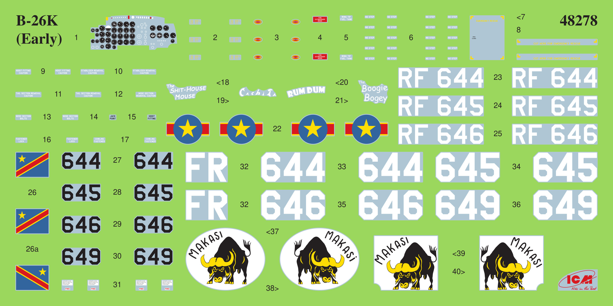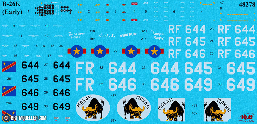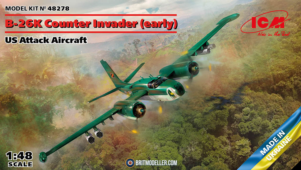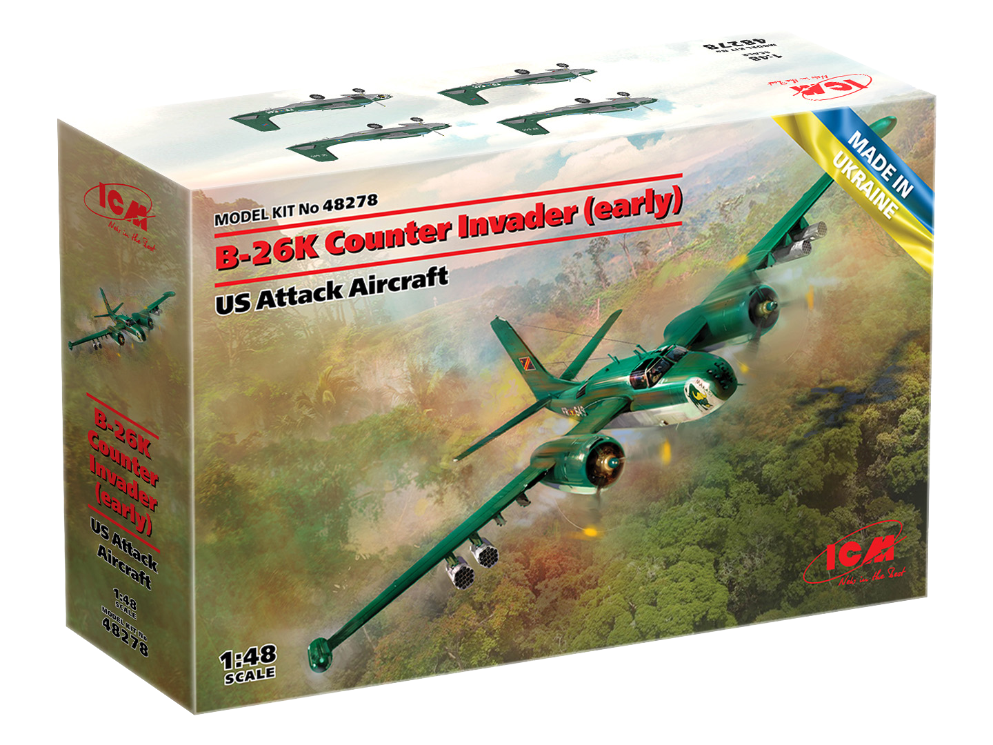 Il s'agit d'une nouvelle variante de l'outillage récent d'ICM, et il s'agit de la 3e box du Counter Invader, dans son rôle secret. Bien que vous obteniez de nombreuses pièces des boîtes Invader d'origine, cette édition comprend un nouveau fuselage et des grappes d'aile, un nouveau gouvernail, de nouvelles nacelles de moteur, une grappe de pylône et des grappes d'armes ICM précédemment publiées en tant que kit d'armement américain seul. Il arrive dans la boîte à ouverture supérieure familière avec des illustrations spectaculaires d'un Invader plongeant au-dessus de la jungle, et le couvercle intérieur captif habituel sur le plateau inférieur. A l'intérieur de la boîte se trouvent 14 grappes saines en styrène gris, une en clair, 3 feuilles de décalcomanies et le livret d'instructions. Un coup d'œil rapide sur les grappes révèle que les lignes des panneaux sont très nettes, étroites et sobres, la surface est mate et très soignée, avec de nombreux détails gravés et en relief sur les pièces, ainsi que des surfaces volantes subtilement en retrait simulant leur revêtement en tissu. Il y a un certain nombre de blocs rouges imprimés sur la carte de la grappe, qui montre combien de pièces resteront sur les grappes une fois la construction terminée, comme les ailes d'origine, les accessoires, les capots et l'une des verrières. Si vous êtes un peu maladroit et que vous prévoyez de construire de nombreux Invaders, vous pourriez bien les trouver utiles sur toute la ligne.