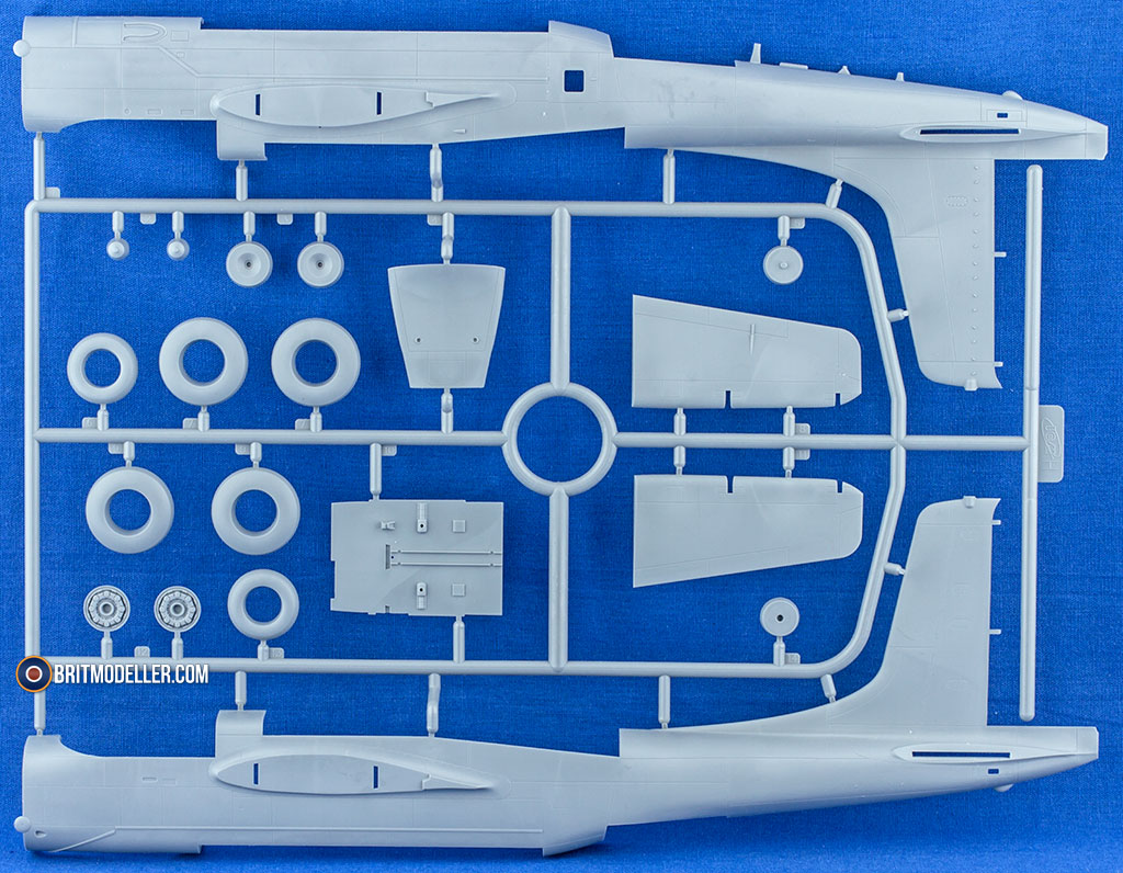 Le haut du fuselage est encore ouvert à ce stade, car il a un insert avec la section carénée à l'endroit où se trouvait la tourelle supérieure, avec un autre pour l'ancienne tourelle dorsale installée plus tard. Chacun des 3 pneus est composé de 2 moitiés avec des moyeux séparés appliqués de chaque côté, puis accrochés à leurs jambes respectives, qui ont des vérins de rétraction et des liens de ciseaux ajoutés en cours de route. Heureusement, ceux-ci peuvent être installés tard dans la construction, de sorte que les baies ouvertes peuvent être masquées plus rapidement que si elles étaient présentes. En parlant de baies, vous pouvez représenter la soute à bombes ouverte ou fermée en utilisant soit une porte monobloc pour la fermeture, soit 2 portes séparées avec des détails internes pour l'ouverture. C'est agréable à voir, car il est toujours un peu difficile de joindre 2 portes et de les aligner avec le fuselage afin qu'il y ait un minimum de lignes de jonction.