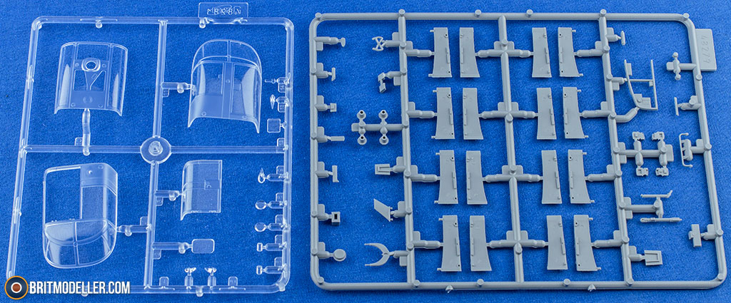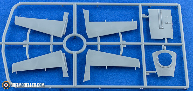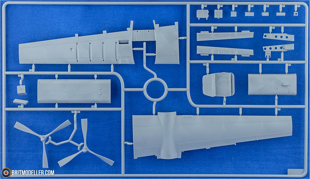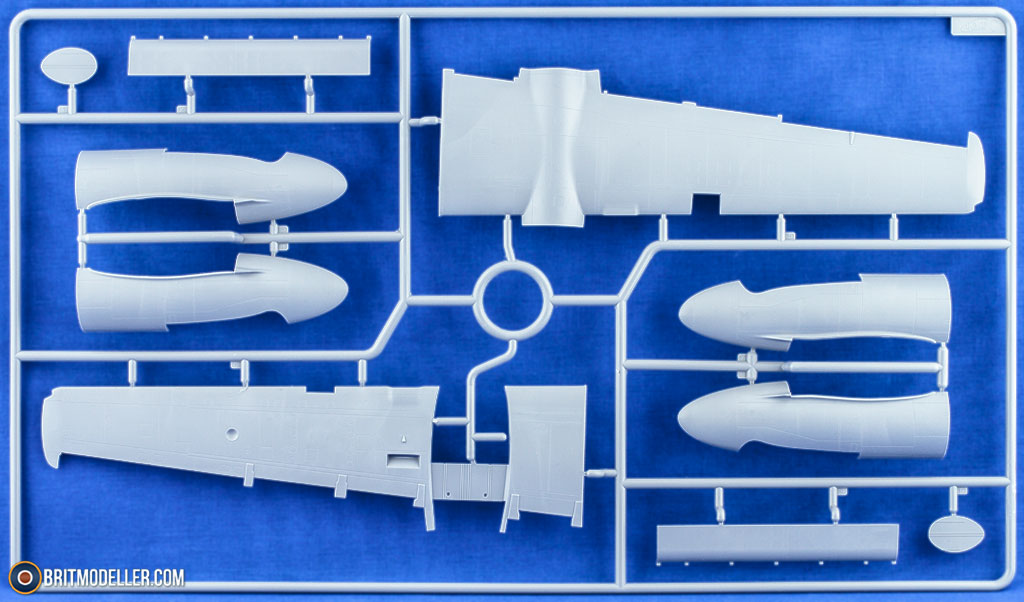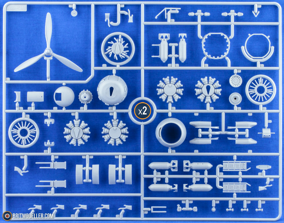 Il y a bien-sûr 2 nacelles de moteur et celles-ci se construisent à peu près de manière identique à l'exception de leurs peaux extérieures, qui sont remises pour s'adapter à leurs carénages respectifs comme vous vous en doutez. Ils sont divisés verticalement et chaque moitié a une structure interne moulée, avec des cloisons ajoutées à l'avant et à l'arrière des baies d'équipement, couplé à des inserts de lèvre de baie qui gonflent les bords et retiennent également captive leur porte de baie. Cela peut nécessiter un masquage intelligent et un peu de soin lors de la manipulation, mais cela ne devrait pas trop vous retenir, car les points d'articulation sont relativement robustes. Les 2 moitiés sont jointes, la prise d'air proéminente sur le dessus de la nacelle est constituée de 2 parties, puis est ajoutée à l'avant de la nacelle qui est à son tour collé au reste de la nacelle, avec les assemblages terminés fixés aux ailes par le dessous, encore sans leurs capots moteurs, moteurs ou hélices. Les moteurs sont ajoutés plus tard dans la construction, et les Twin Wasps sont représentés dans leur intégralité avec les 2 bancs de pistons, poussoirs, accessoires et boîtier de réduction à l'avant, ainsi que la bague collectrice et les échappements à l'arrière, ces derniers étant composés de 8 pièces chacun. Encore une fois, les moteurs sont identiques et interchangeables les uns avec les autres, et ils s'adaptent aux nacelles avec une languette en forme de larme, après quoi le capot moteur est fendu sur eux. Les volets de refroidissement sont les derniers à être ajoutés en 4 ensembles autour de l'arrière du capot.