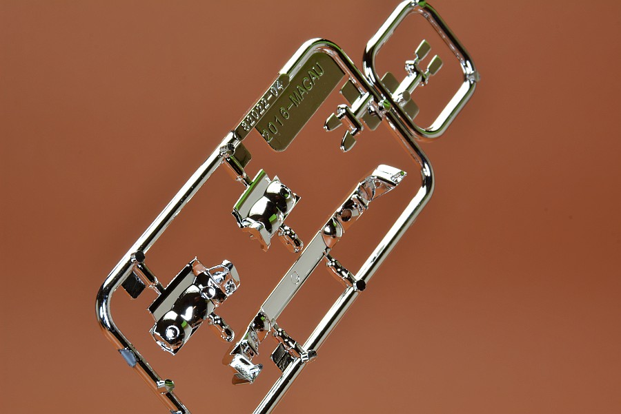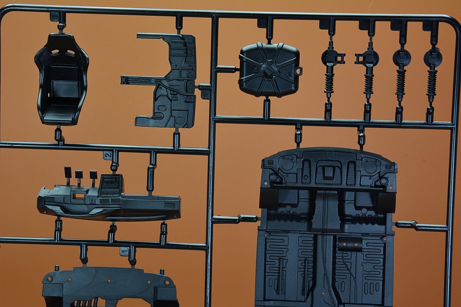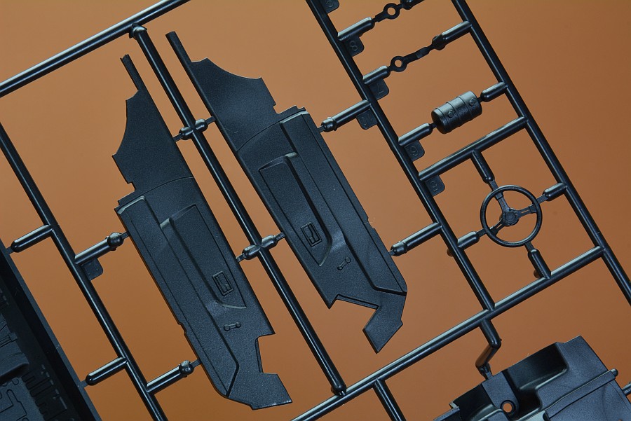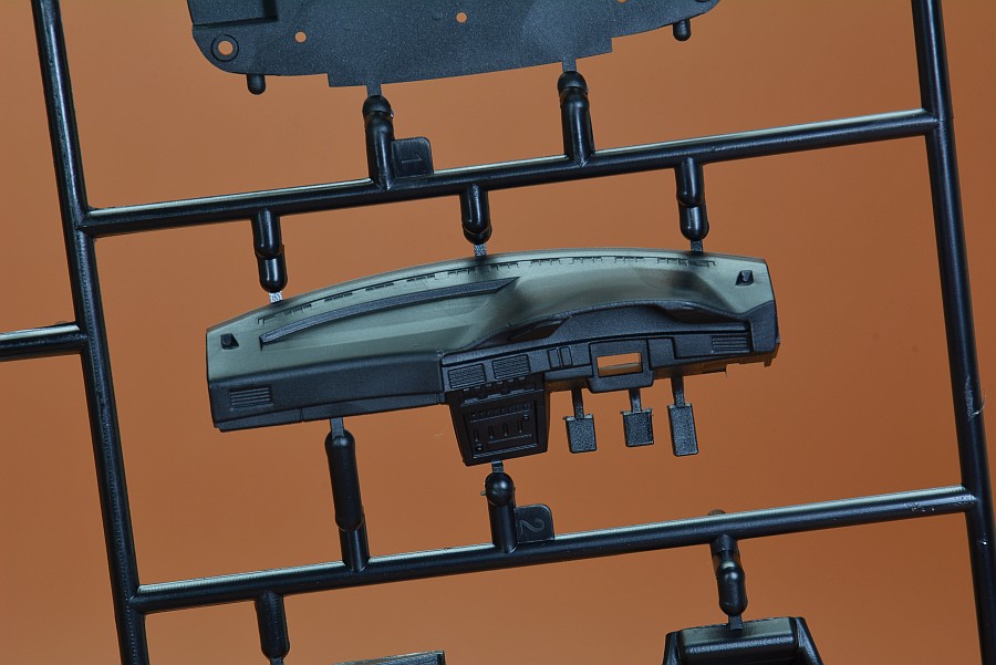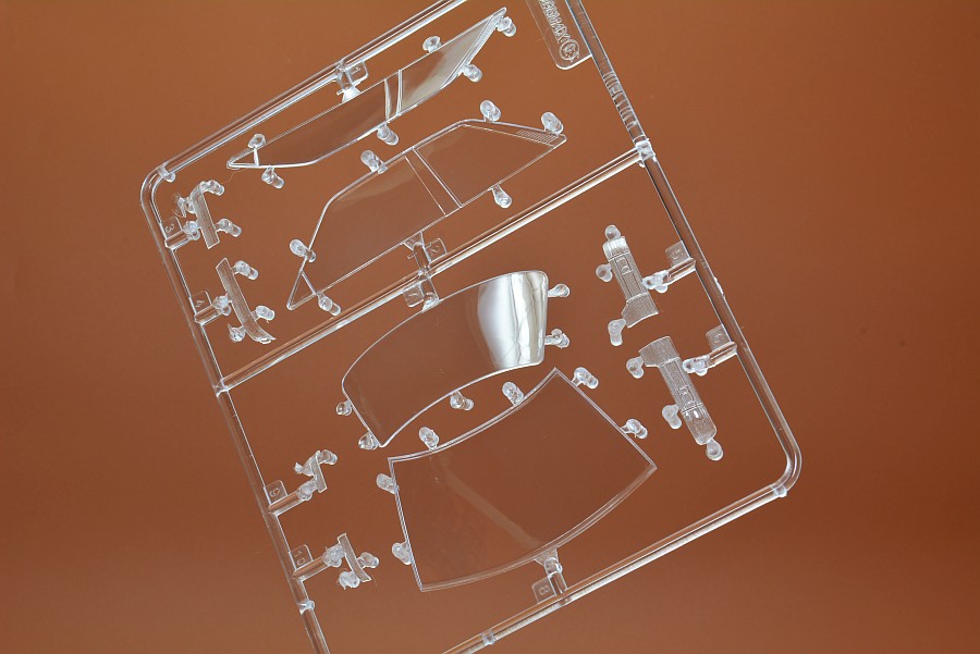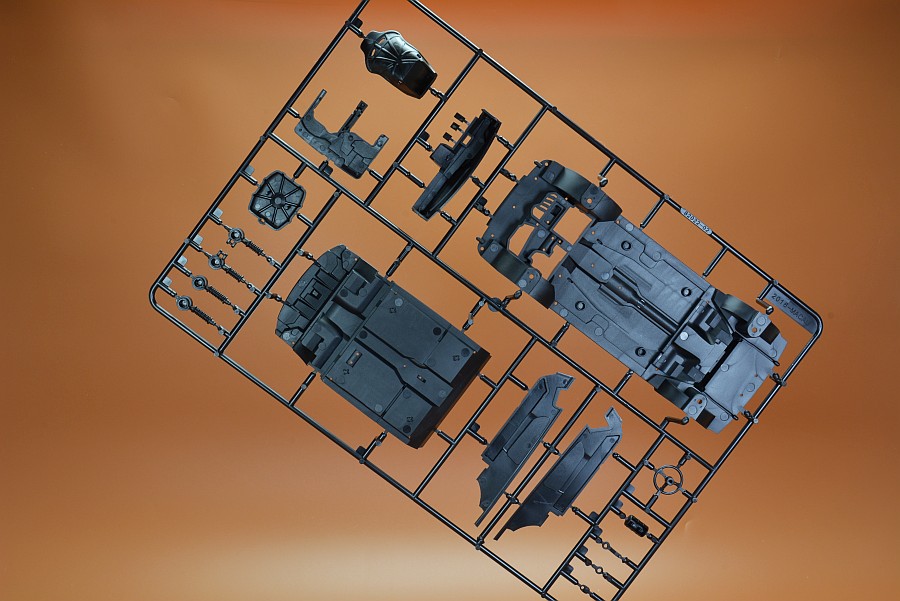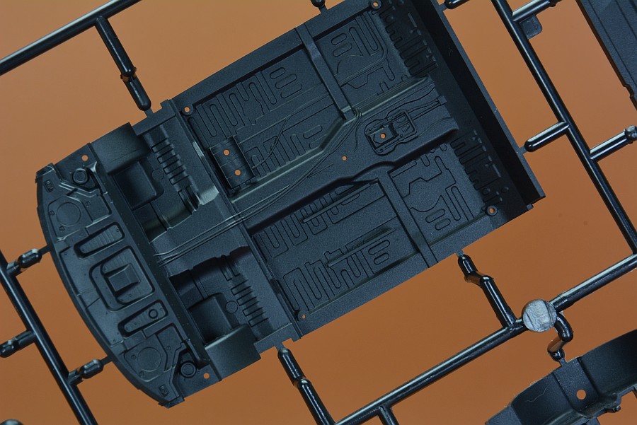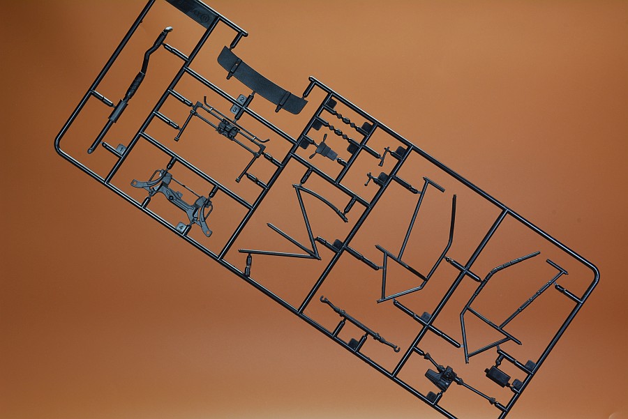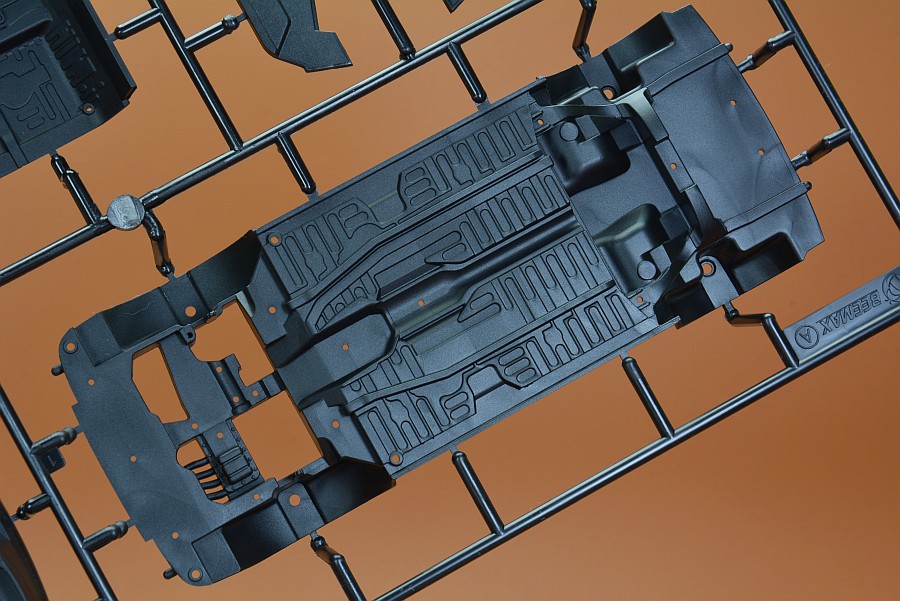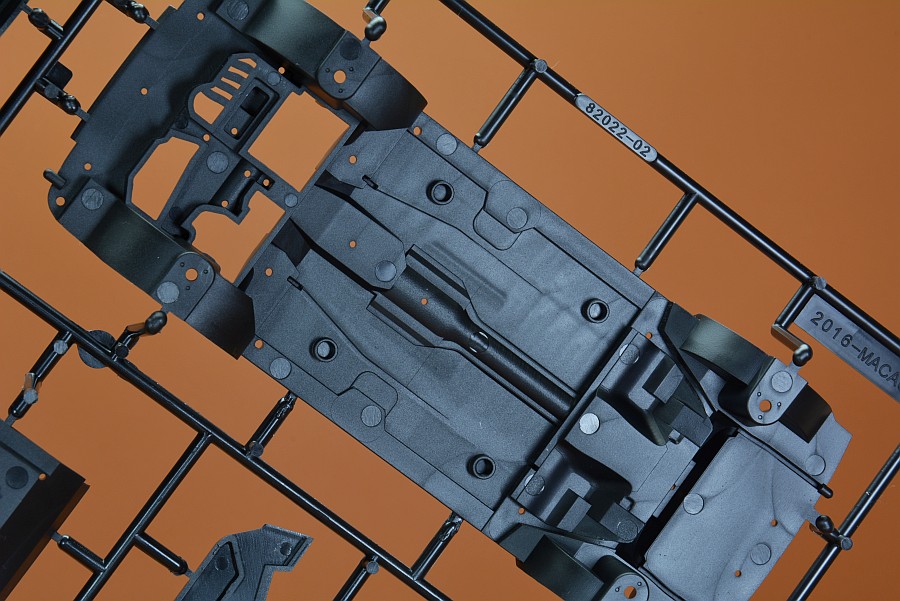 Les pièces en plastique ont été nettoyées au pistolet, seule la partie moulée avec l'arceau de sécurité présente des bavures et de légers quadrillages sur les pièces de l'essieu arrière. Cela s'enlève facilement avec une lame tranchante et du papier de verre. Il n'y a pas non plus de points de chute visibles et les positions des éjecteurs sont choisies de manière à ce que qu'ils disparaissent dans la zone invisible postérieure. Les positions internes des différents systèmes de réservoir peuvent être vues et ressenties sur le couvercle du coffre. Selon la variante du véhicule, ceux-ci doivent être découpés vous-même, le reste poncé et lissé, comme cela pourrait être le cas avec une fine couche de peinture que ces contours pouvaient devenir apparents après peinture. Il est généralement conseillé de poncer quand même les panneaux de carrosserie, car ils sont légèrement rugueux, ce qui montre que la forme n'a pas été polie. Il existe des kits de NuNu où les corps sont lisses comme du verre et certains ont cette surface légèrement rugueuse.