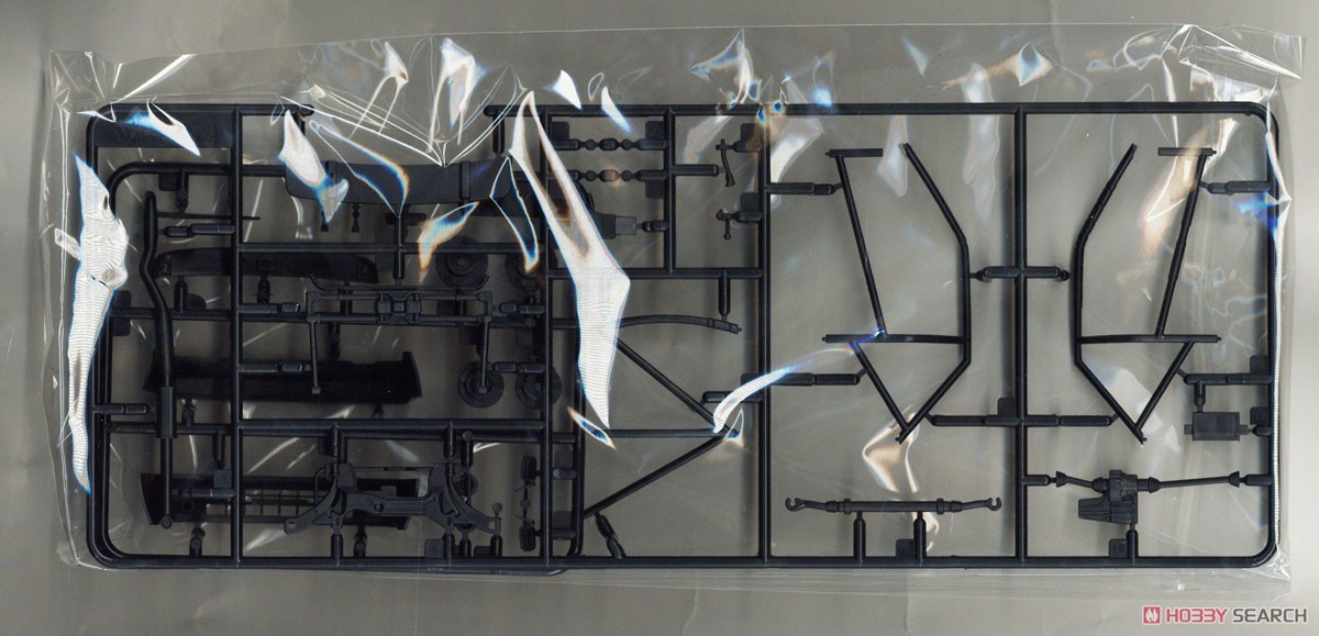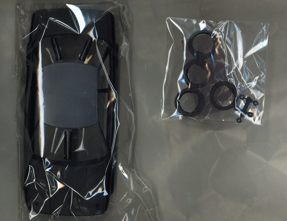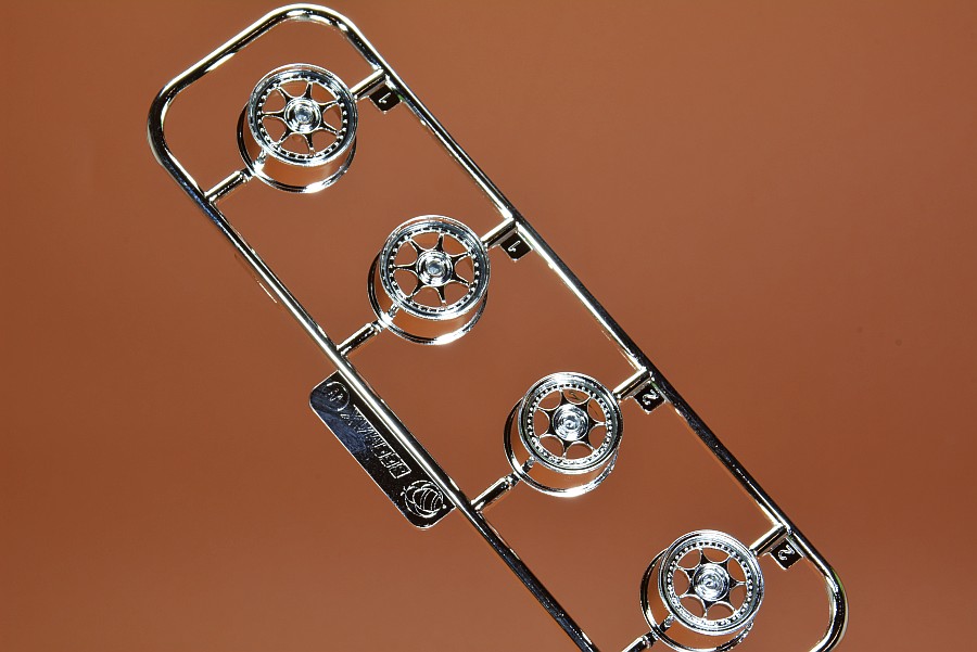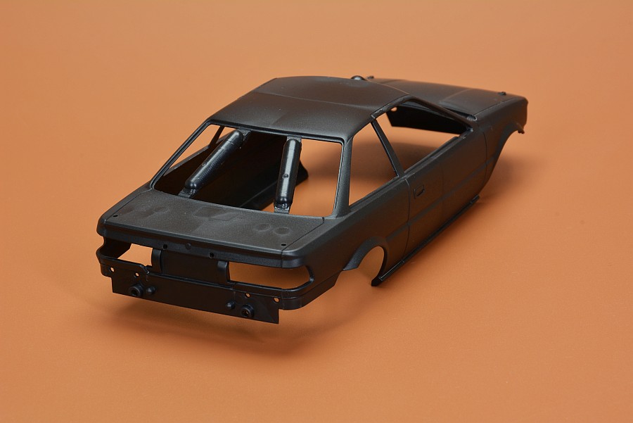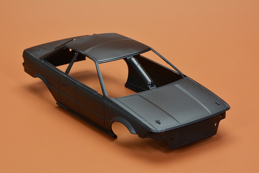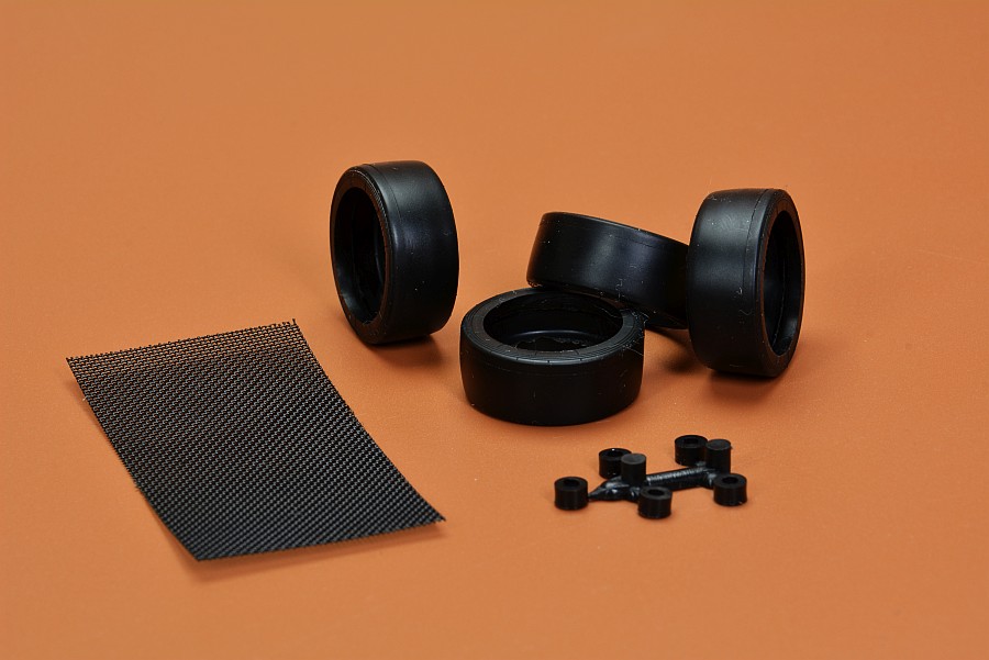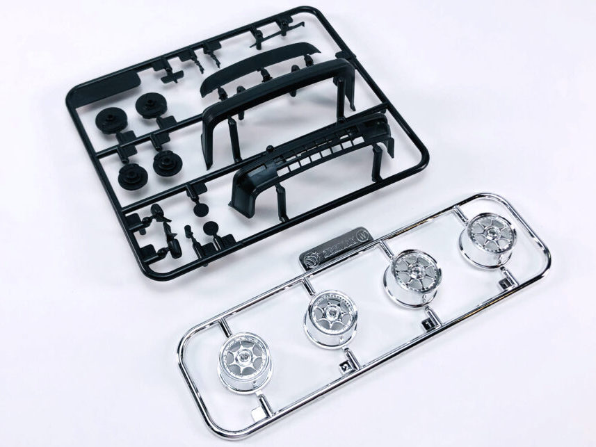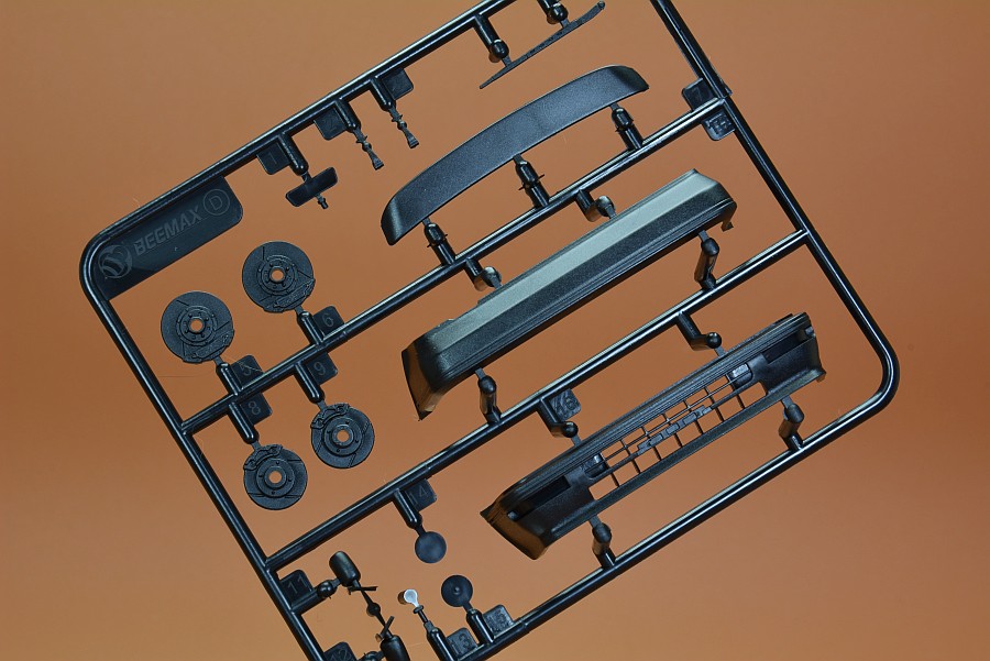 Les pièces en plastique ont été nettoyées au pistolet, seule la partie moulée avec l'arceau de sécurité présente des bavures et de légers quadrillages sur les pièces de l'essieu arrière. Cela s'enlève facilement avec une lame tranchante et du papier de verre. Il n'y a pas non plus de points de chute visibles et les positions des éjecteurs sont choisies de manière à ce que qu'ils disparaissent dans la zone invisible postérieure. Les positions internes des différents systèmes de réservoir peuvent être vues et ressenties sur le couvercle du coffre. Selon la variante du véhicule, ceux-ci doivent être découpés vous-même, le reste poncé et lissé, comme cela pourrait être le cas avec une fine couche de peinture que ces contours pouvaient devenir apparents après peinture. Il est généralement conseillé de poncer quand même les panneaux de carrosserie, car ils sont légèrement rugueux, ce qui montre que la forme n'a pas été polie. Il existe des kits de NuNu où les corps sont lisses comme du verre et certains ont cette surface légèrement rugueuse.