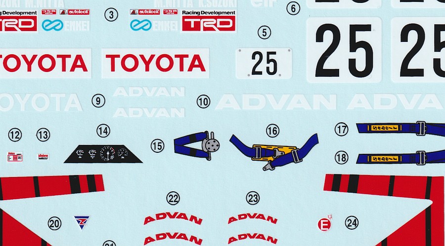 La feuille de décalcomanies au format A6 est brillante, sauf pour les encadrements de fenêtres qui sont imprimés en mat. Les éléments sont propres et nets afin que tous les lettrages soient faciles à lire. En raison de l'impression multicolore, les décalcomanies semblent parfois épaisses, mais comme je l'ai remarqué sur une autre version de la Toyota Corolla AE92, ils sont faciles à traiter et s'adaptent sans problème à la forme du véhicule avec un peu de plastifiant.