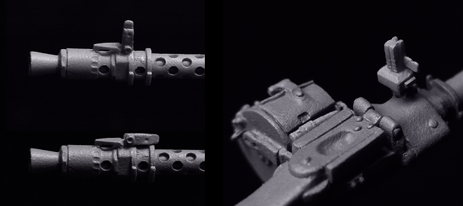 Le canon, le corps principal de l'arme et le couvercle de munitions sont fabriqués en une seule pièce. La veste de canon très détaillée (fonte creuse), la base de visée avant et la goupille de maintien du bipied sont également moulées en une seule pièce.