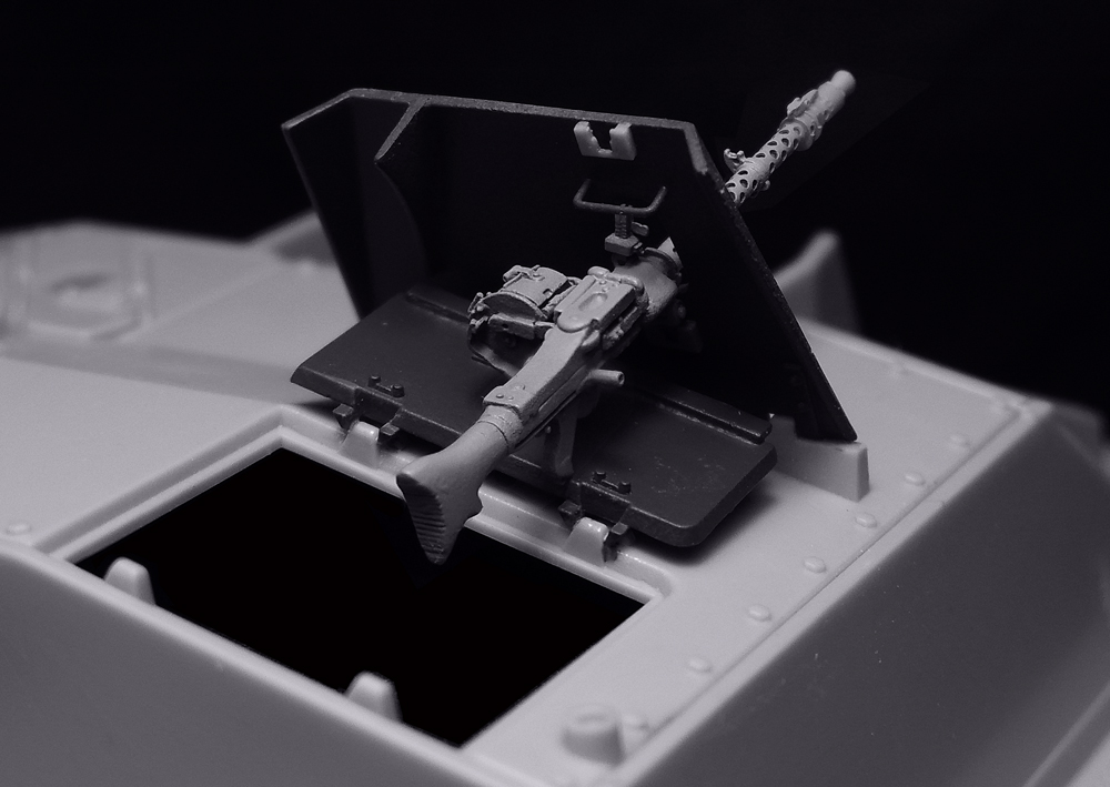 Des supports et montures supplémentaires sont fournis pour fixer la Mg34 au bouclier Stug comme indiqué ci-dessous, en remplacement de ceux du kit plastique.