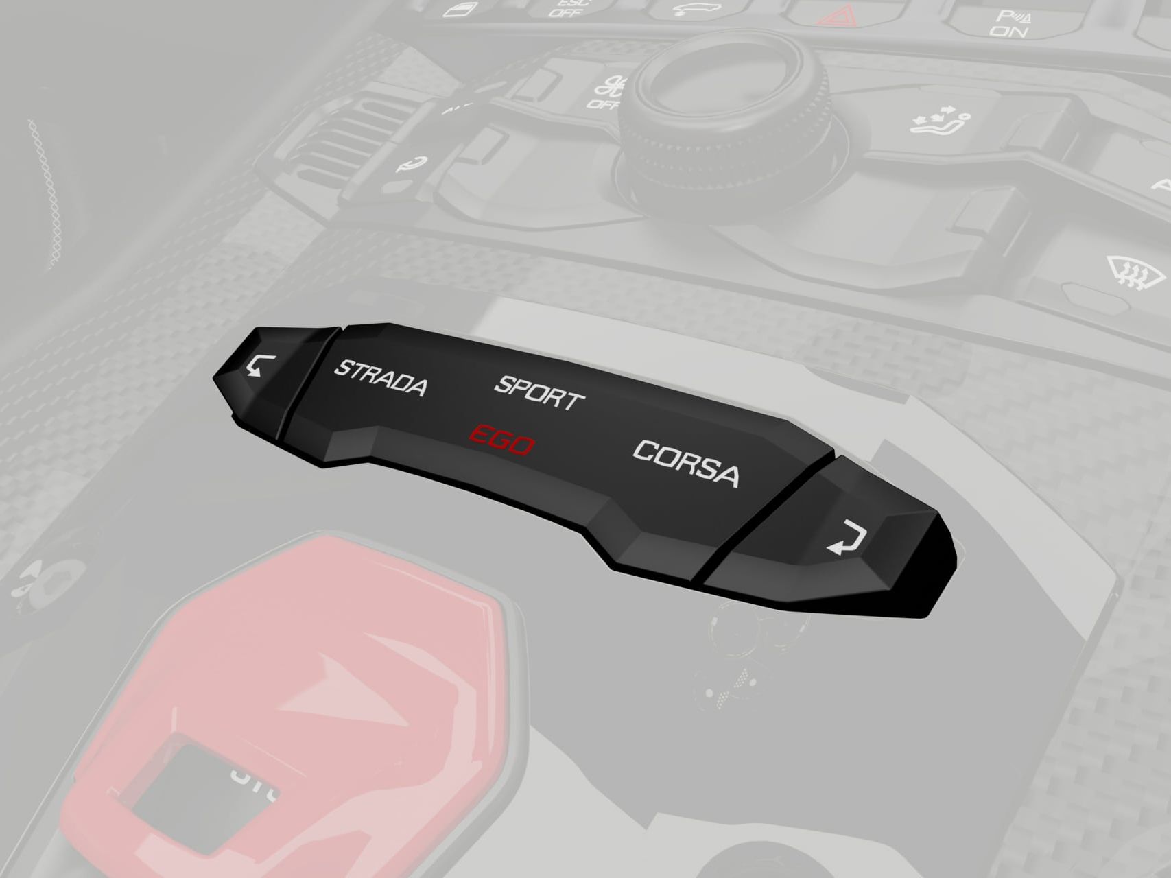 Quelle que soit la situation de conduite, la nouvelle Aventador S Roadster permet de prendre le contrôle total du véhicule grâce au sélecteur de mode dynamique. Ce dispositif effectue un réglage optimal du moteur, de la transmission, de la traction, de la direction, des suspensions et du contrôle de la stabilité en fonction du mode choisi : STRADA, SPORT et CORSA. Mais c'est l'ajout d'un quatrième mode qui rend l'Aventador S Roadster unique en son genre : le mode EGO. Cette nouvelle option, qui permet de personnaliser chaque réglage, donne vie à une expérience de conduite plus personnelle que jamais.