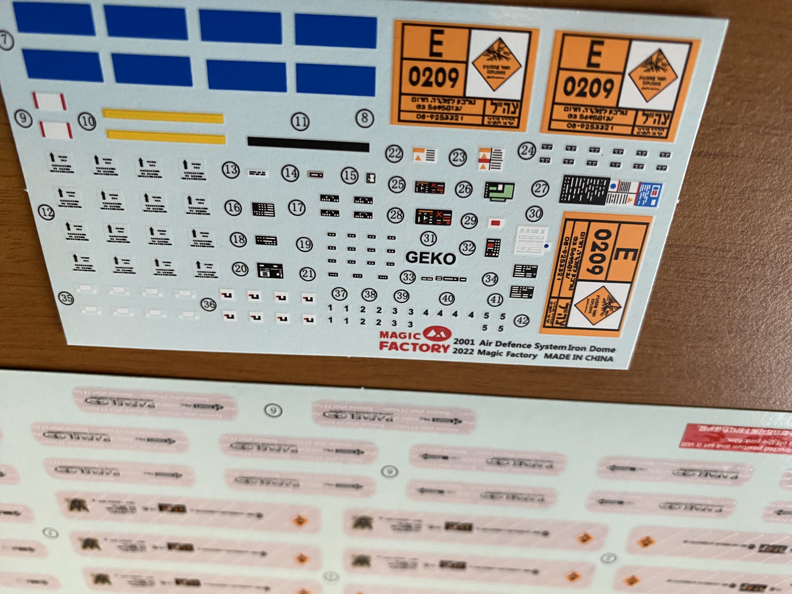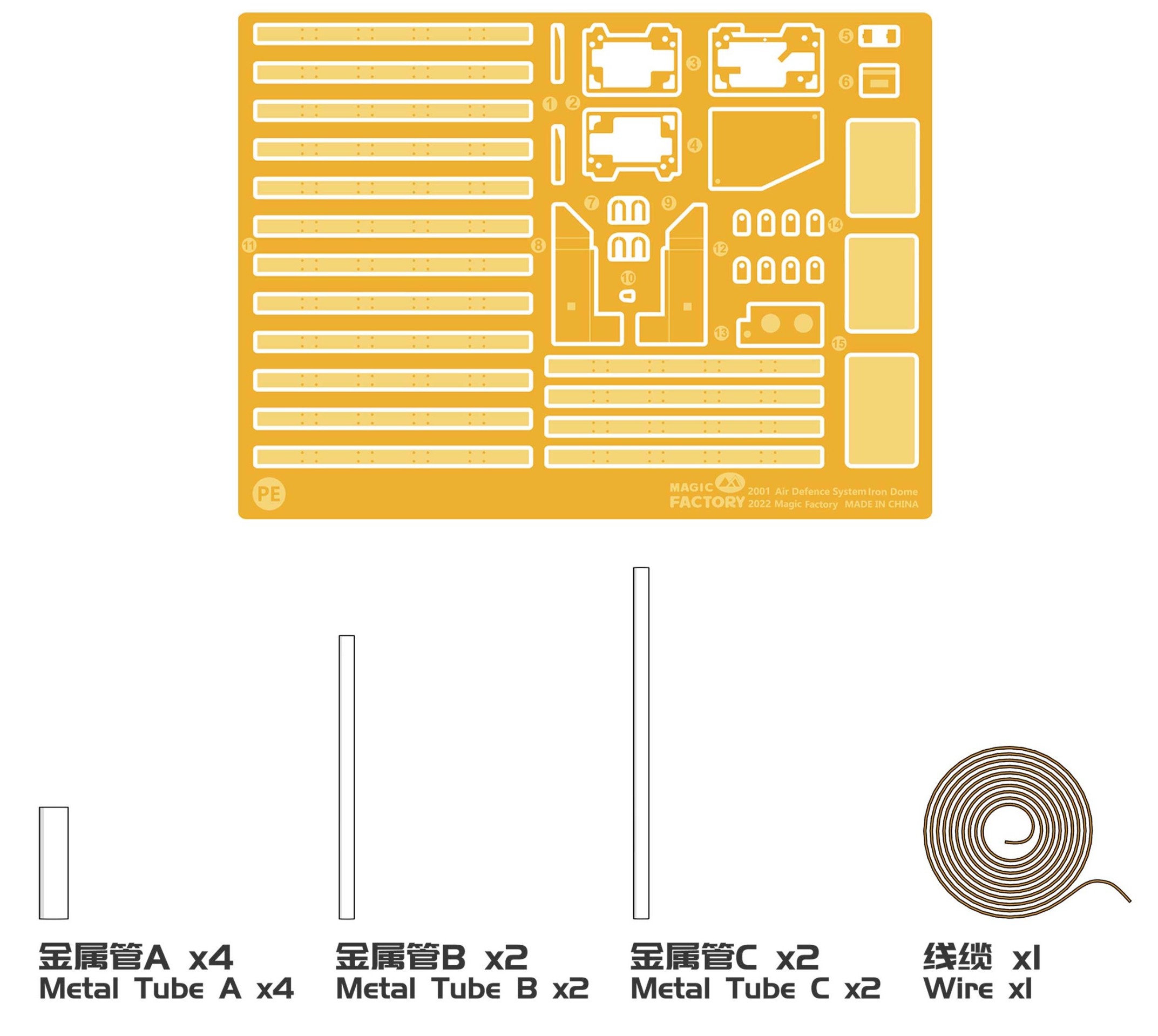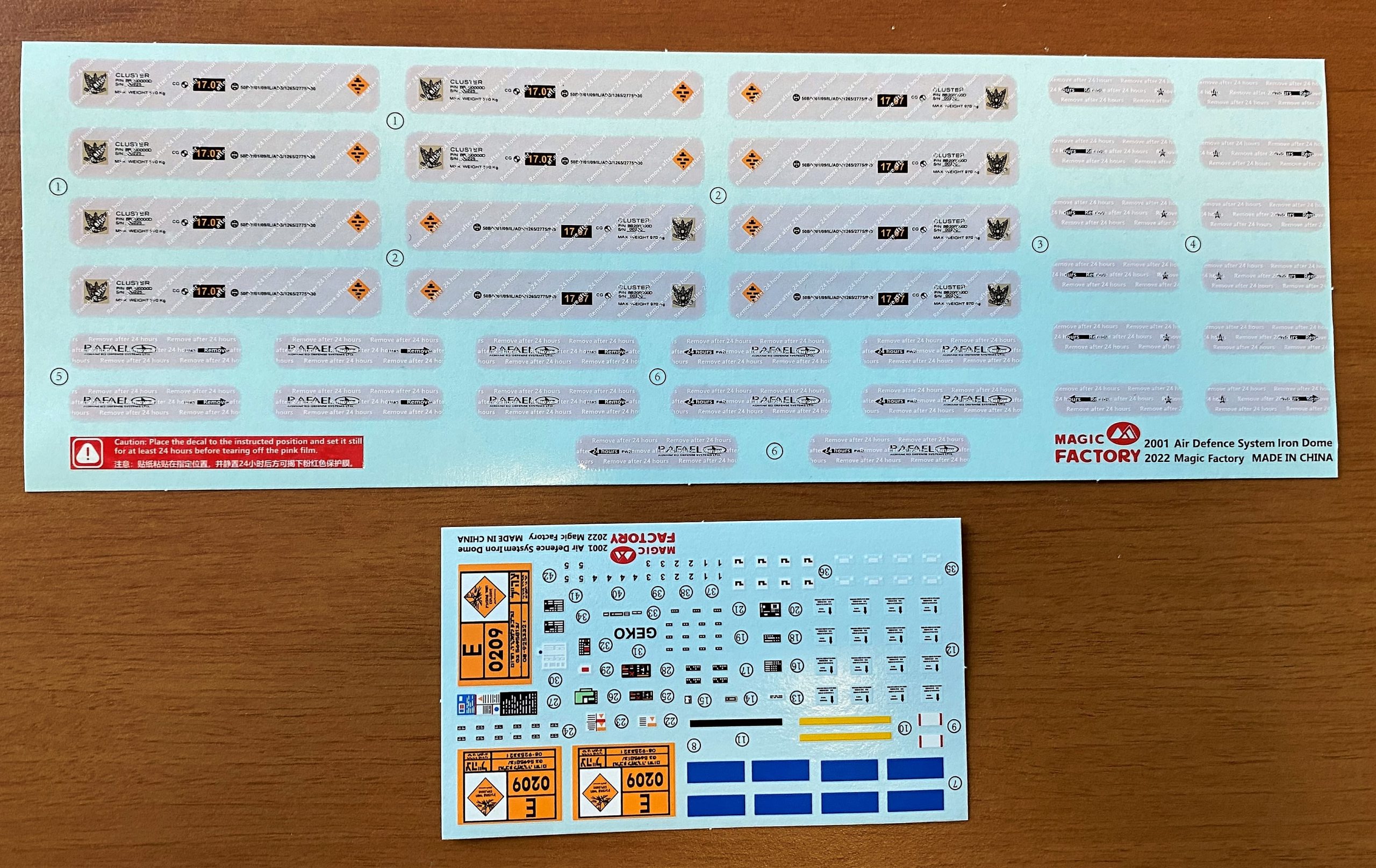La société chinoise Magic Factory est sur le marché depuis 2021. La boîte s'ouvre par le haut. Le nouveau kit se compose de 5 grappes différentes, une feuille de pièces photogravées, des tubes métalliques, une petite bobine de fil, 2 feuilles de décalcomanies et 2 figurines de soldats israéliens.