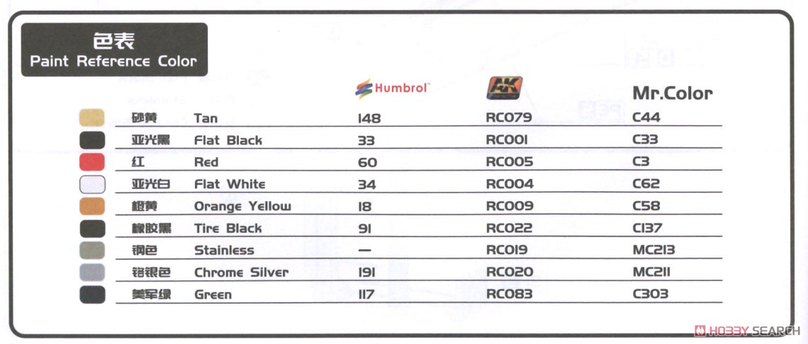 Les couleurs de Humbrol, AK et Mr. Color sont données.