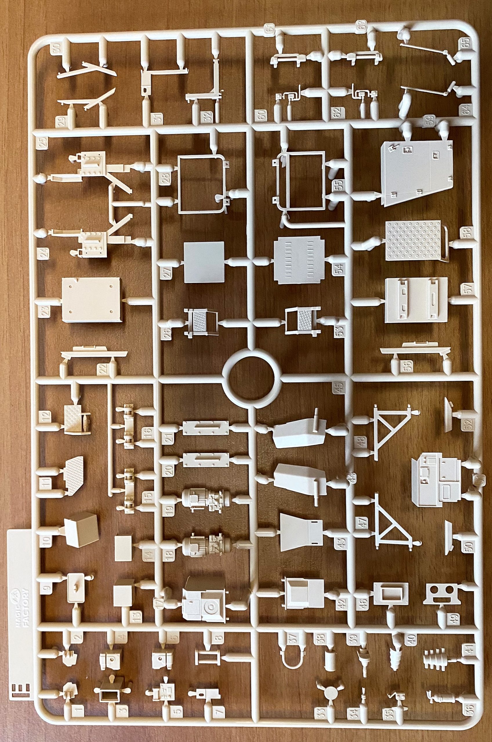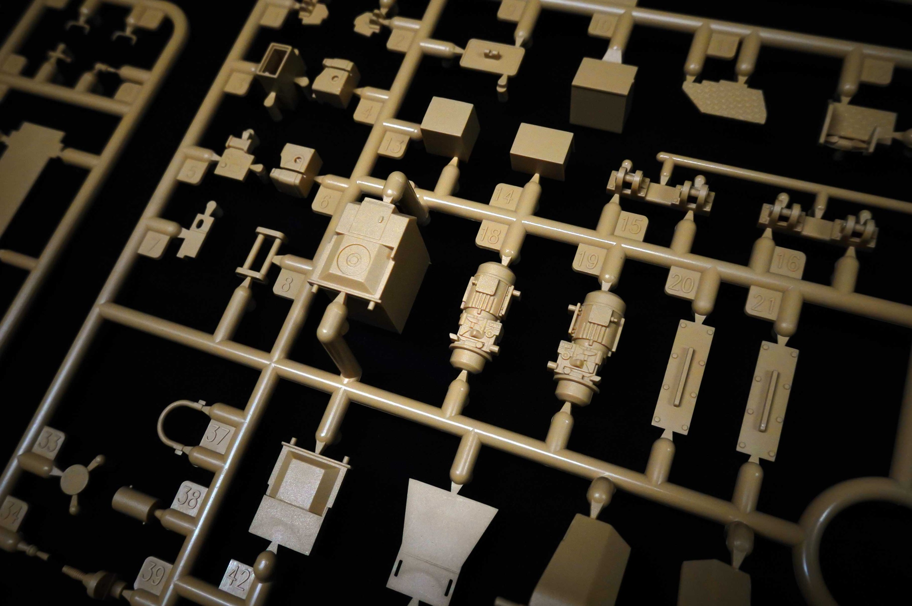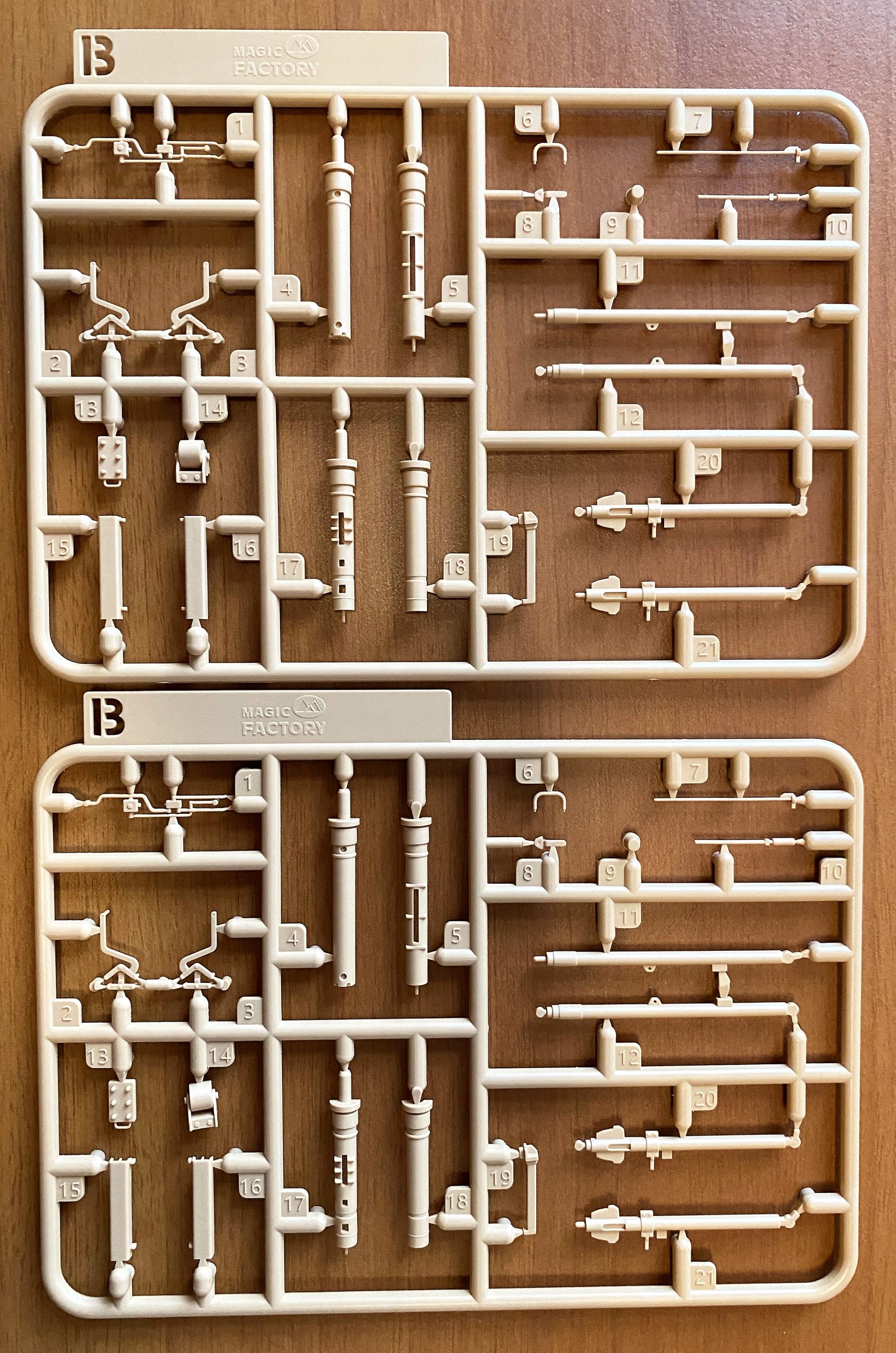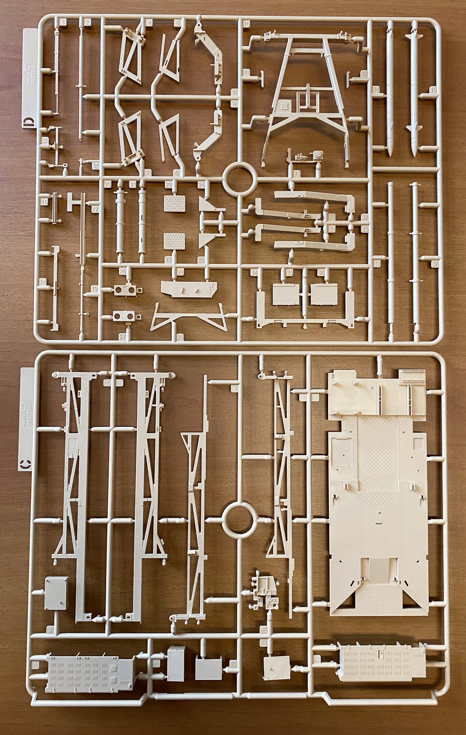 Les composants des 9 grappes sont impeccables. Moulés à partir de plastique marron clair, ils rappellent les pièces en plastique Bandai. La question de savoir si cela s'applique également à la précision de l'ajustement ne peut être évaluée que pendant la construction. Le modèle peut être affiché en mode lancement et transport. Cependant, aucun changement ultérieur n'est prévu.