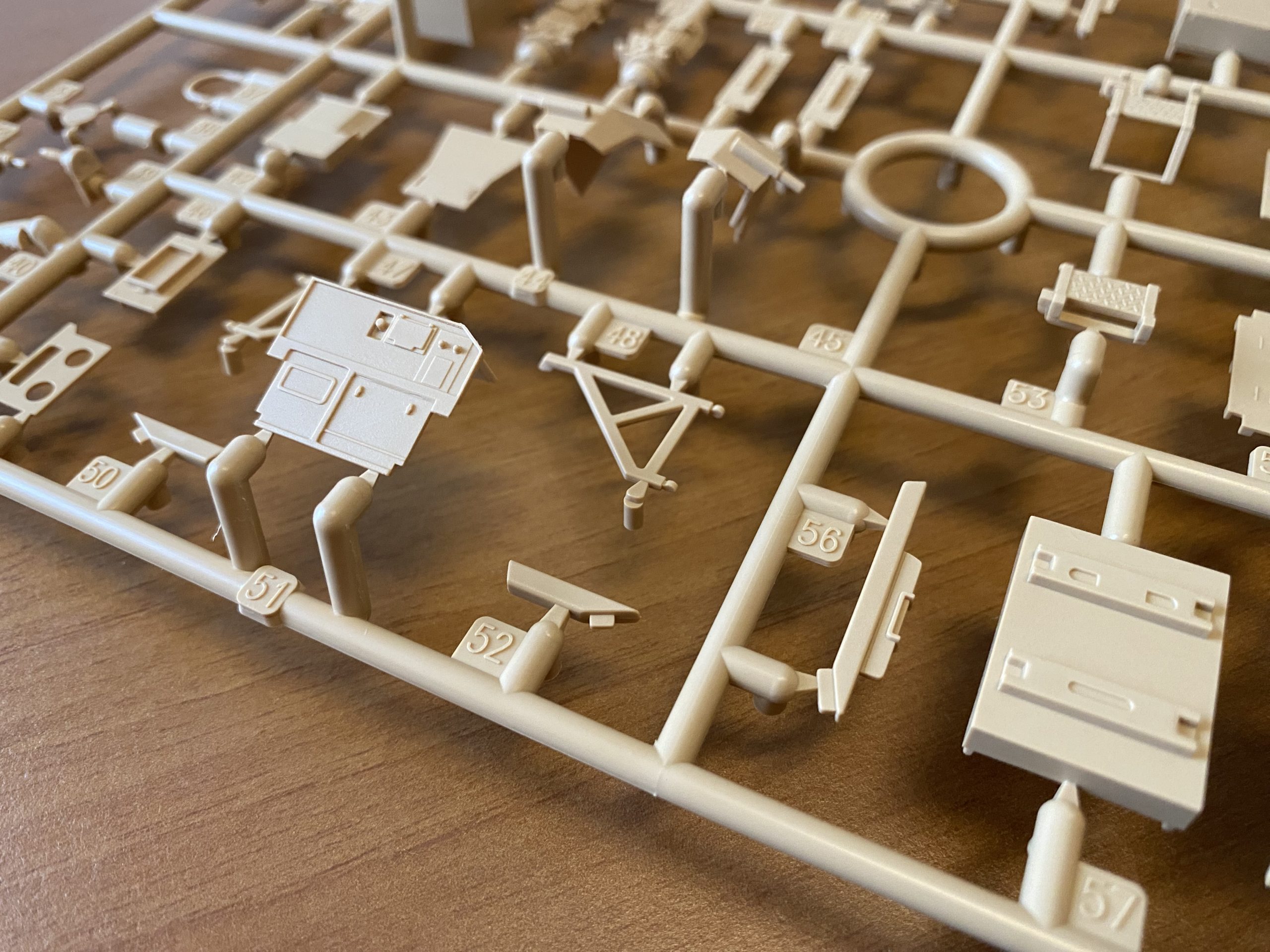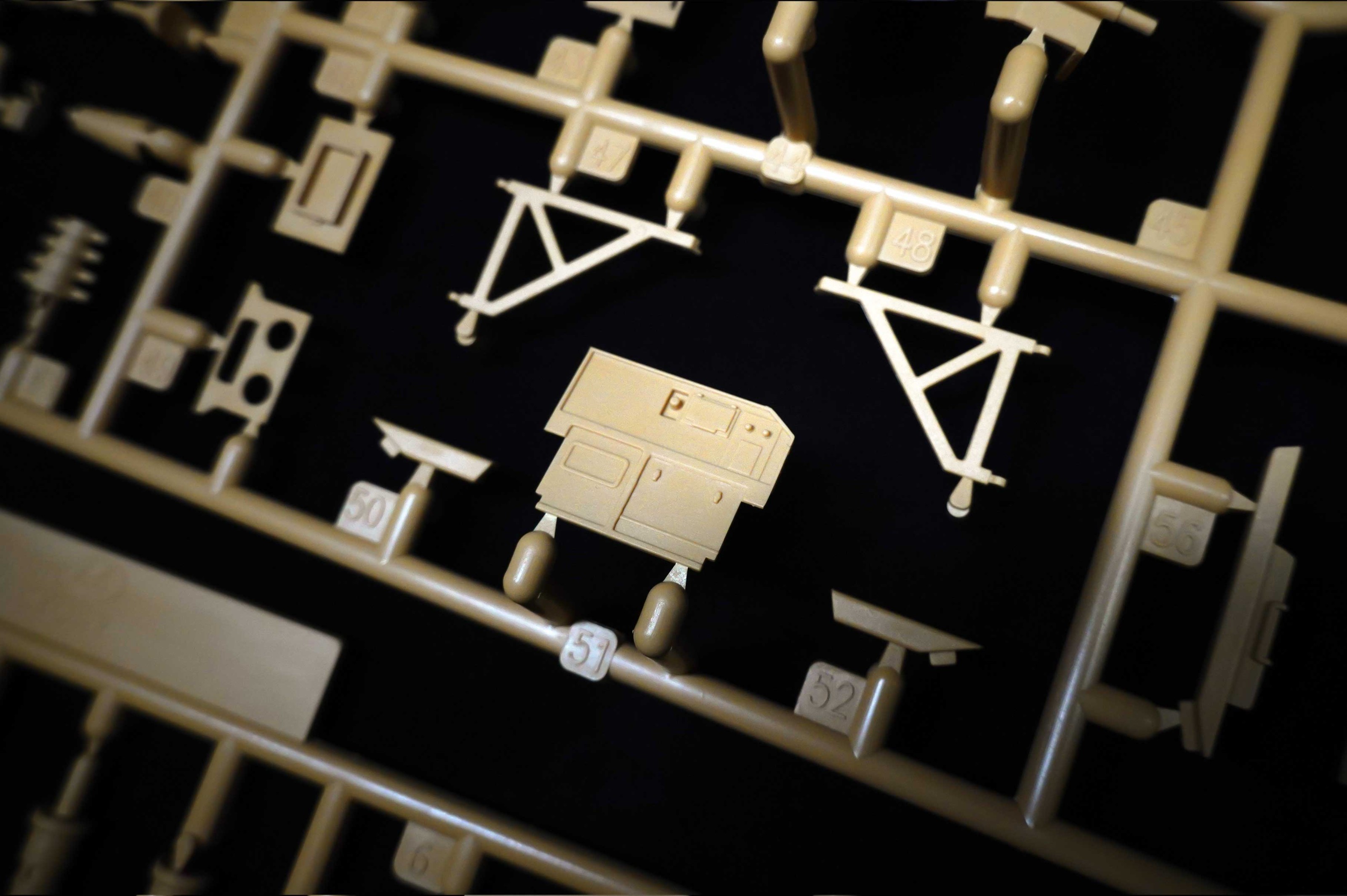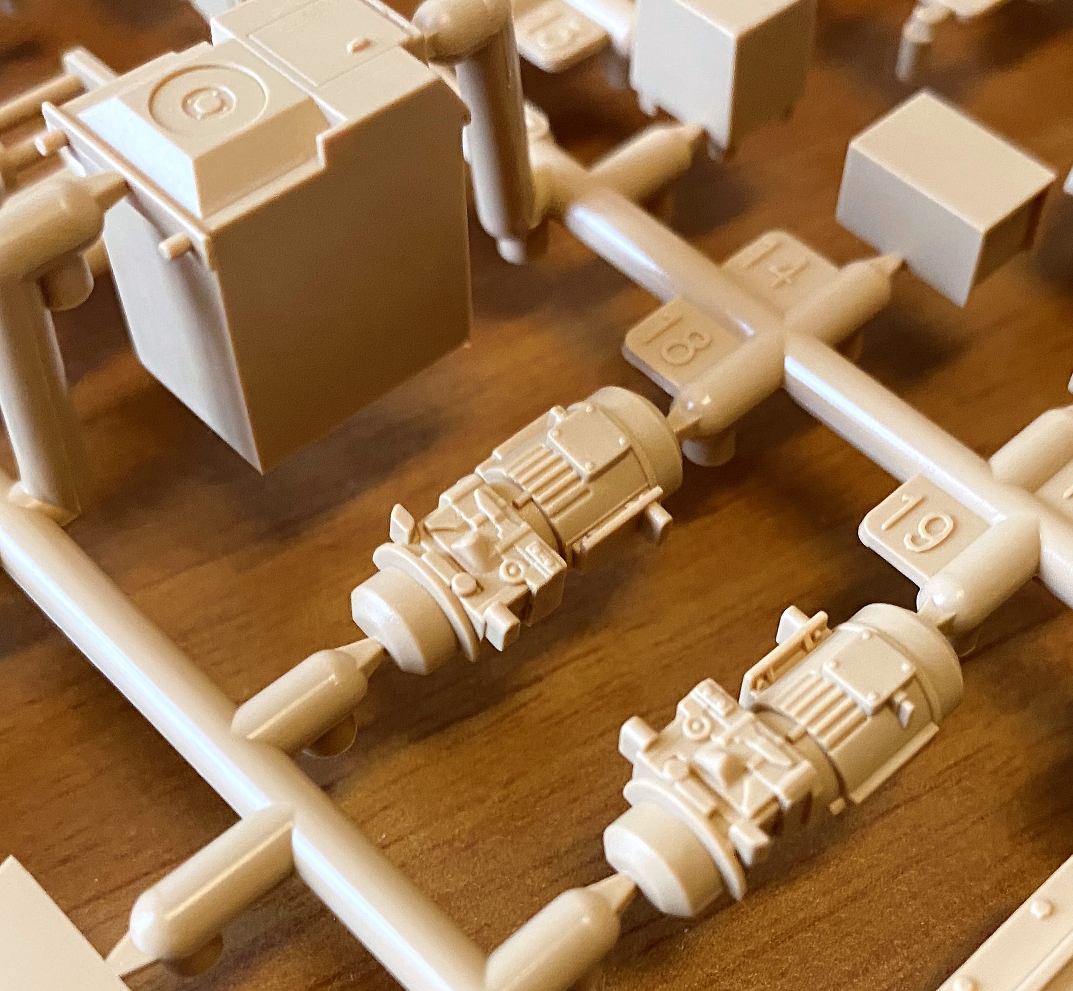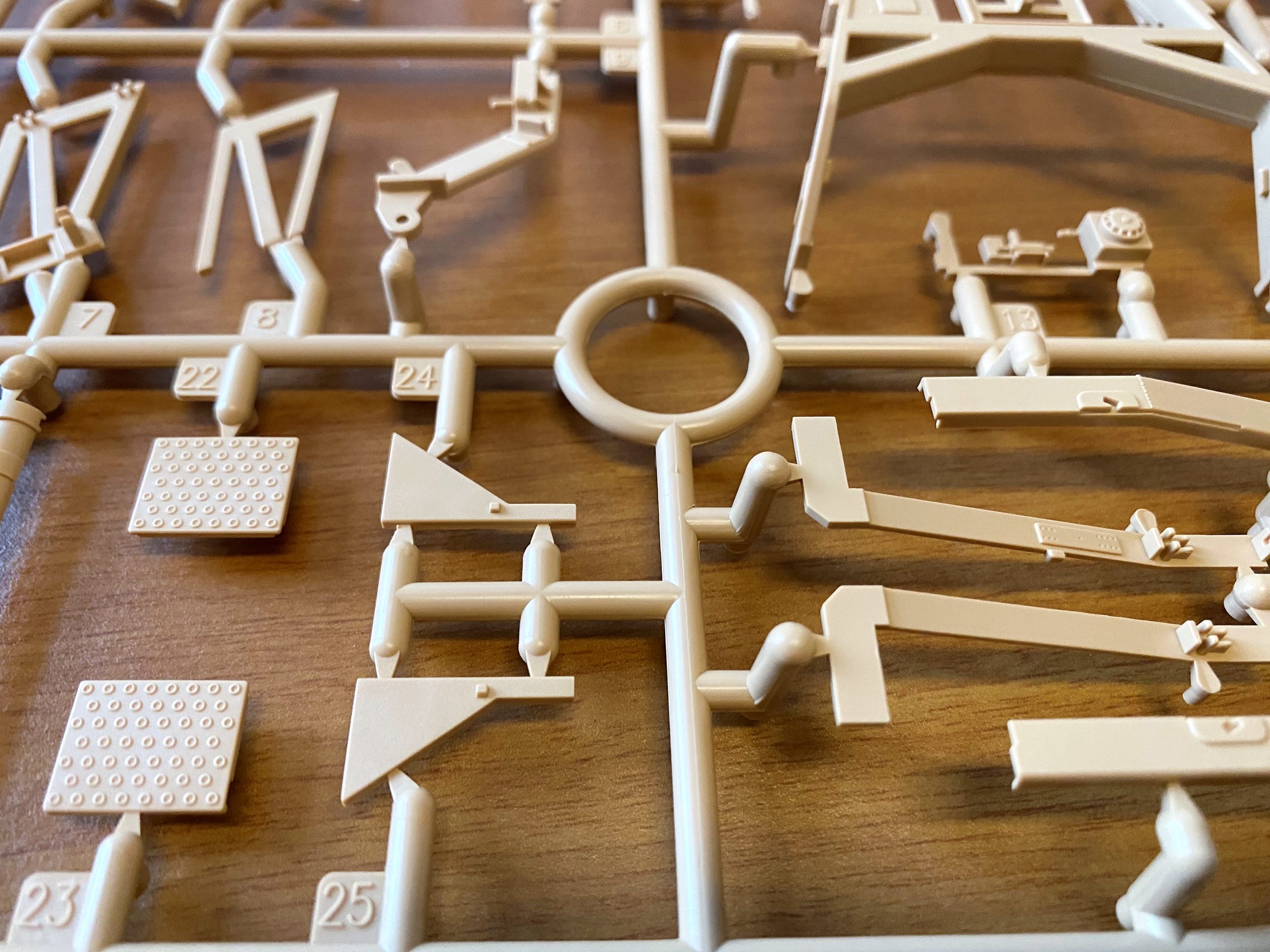 Les composants des 9 grappes sont impeccables. Moulés à partir de plastique marron clair, ils rappellent les pièces en plastique Bandai. La question de savoir si cela s'applique également à la précision de l'ajustement ne peut être évaluée que pendant la construction. Le modèle peut être affiché en mode lancement et transport. Cependant, aucun changement ultérieur n'est prévu.