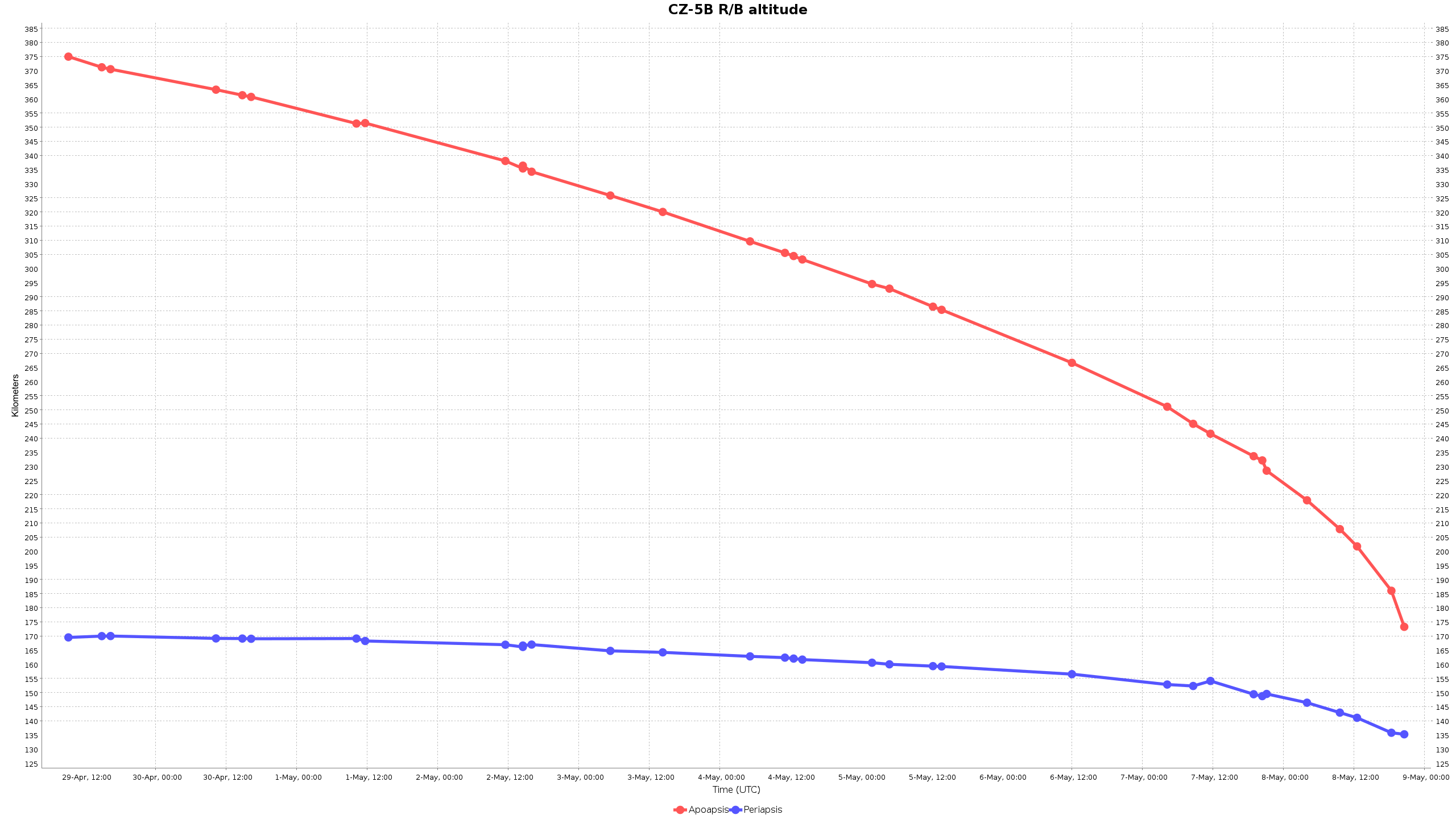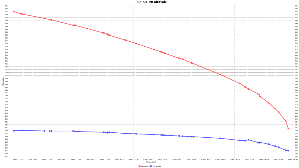 Lors du lancement, la Longue Marche 5B insère également son étage central dans une orbite elliptique de 151 par 317km avec une inclinaison de 41 degrés. L'étage vide possède alors une masse d'environ 20 tonnes, pour une longueur de 31,7m et un diamètre de 5m. Le 11 mai 2020 à 15h33 UTC, l'étage rentre dans l'atmosphère au-dessus de l'océan Atlantique, ne provoquant aucun dégât. 15 minutes auparavant, il survolait la ville de New York à seulement 170km d'altitude. Un accident potentiel a donc été évité. Certains rapports indiquent toutefois que des débris sont tombés en Côte d'Ivoire. Il s'agit du plus gros objet à effectuer une rentrée incontrôlée depuis la désintégration de la station spatiale soviétique Saliout 7 en 1991.
