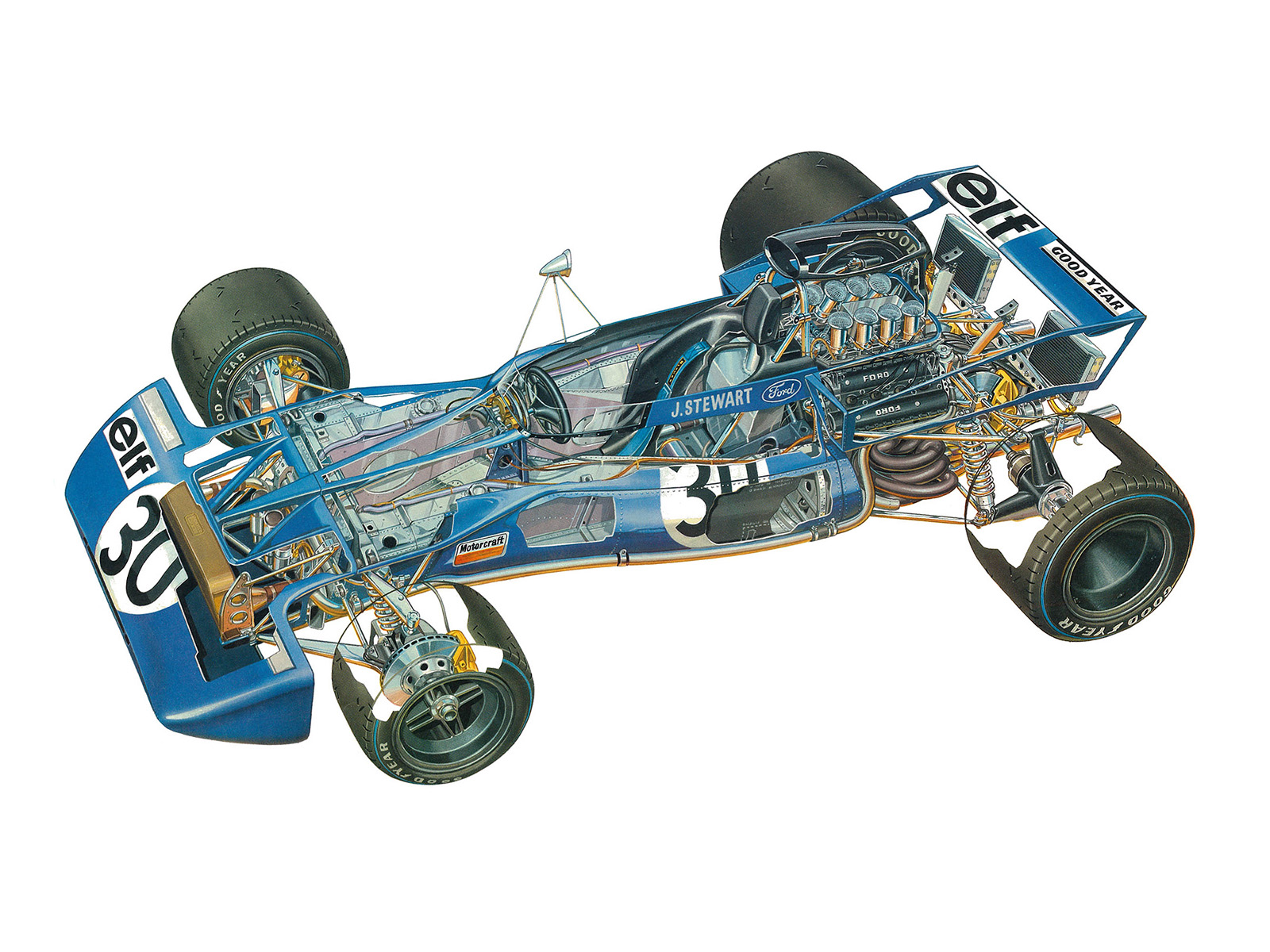 L’équipe Tyrrell a fait sa révérence en Formule 1 en 1968 en utilisant la Matra Ford et a rapidement obtenu d’excellents résultats, avec un championnat des pilotes pour Jackie Stewart la saison suivante. À partir de la 11e course de 1970 au Canada, l’équipe a lancé la 001 conçue en interne, qui a ouvert la voie aux voitures 003 et 002 pilotées en 1971 par Stewart et François Cévert respectivement. Alors qu’un aileron avant et un nez intégrés uniques avec radiateur juste en dessous ont attiré l’attention, la 003 utilisait une configuration par ailleurs orthodoxe et fiable. Stewart a remporté 6 victoires en 11 courses, y compris le GP de Monaco, plus que suffisant pour les titres pilotes et constructeurs de cette saison.