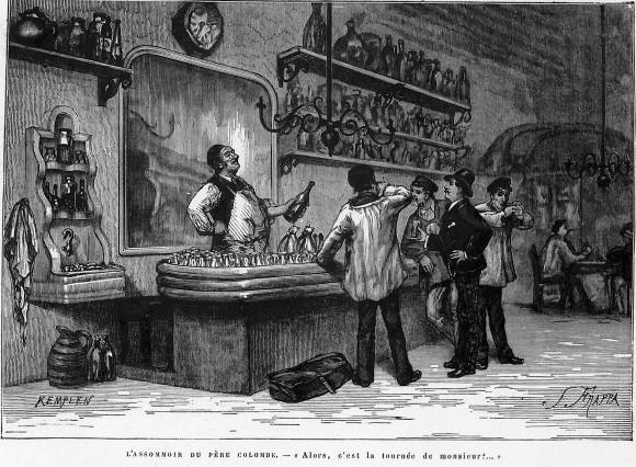 Au départ (au XIXe siècle) le bistrot est un débit de boisson uniquement. On l’appelle aussi assommoir comme dans le roman d’Émile Zola, un lieu populaire où les buveurs assomment leurs soucis à coup de vin, (souvent de mauvaise facture), de prune, d'absinthe ou de nectars éthyliques diverses et variés.
