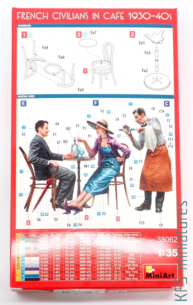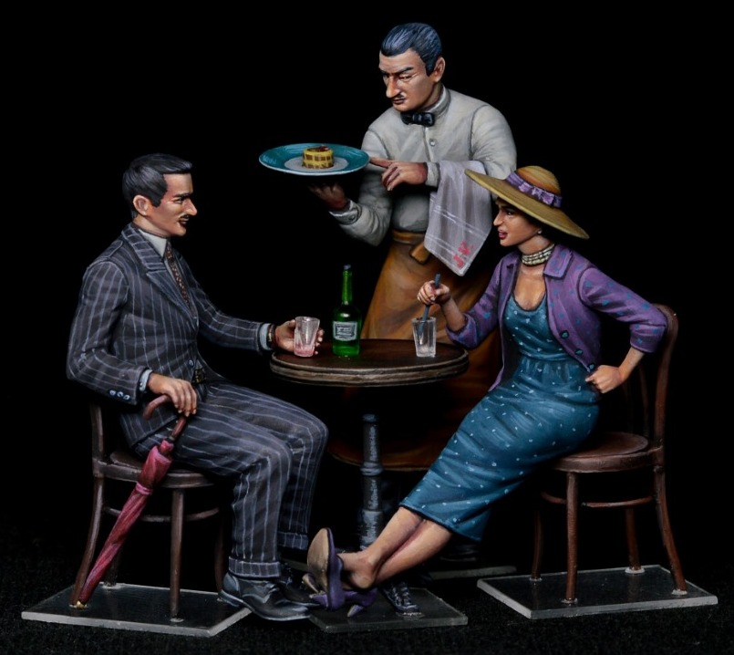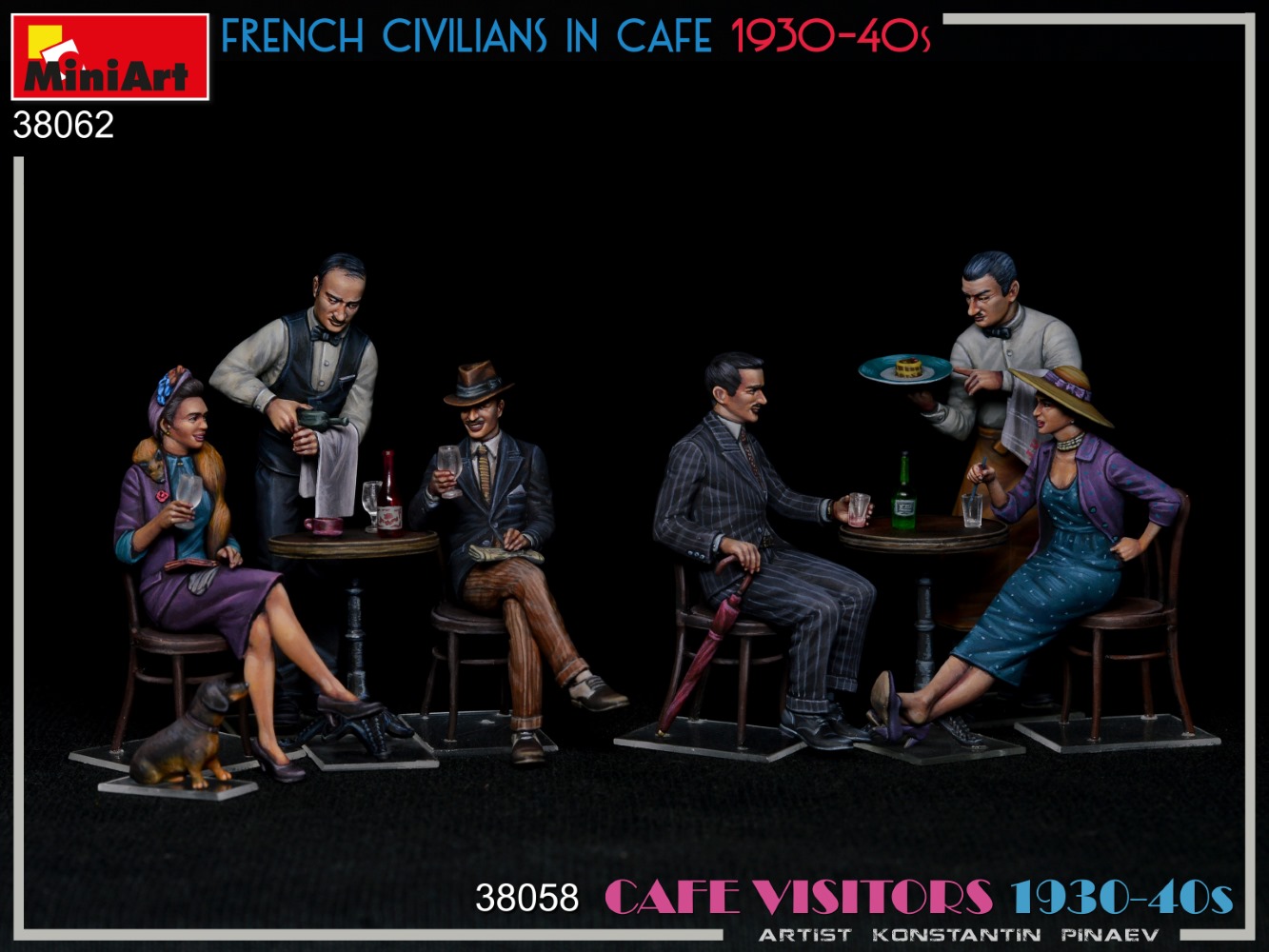 Le kit contient des modèles de 3 personnages, des meubles de café et des accessoires au 1/35 en 49 pièces.