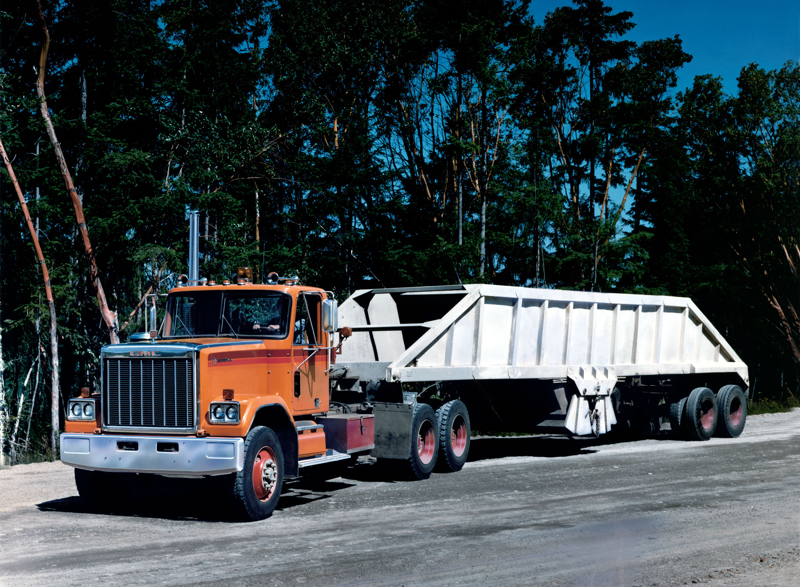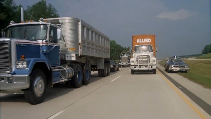 un Chevrolet Bison 1977 tractant une remorque à benne basculante Ravens. Les corvens sont toujours produits aujourd’hui, bien que la société appartienne maintenant à Kruz. Les remorques en aluminium Ravens se distinguent par leur finition tourbillonnante unique.