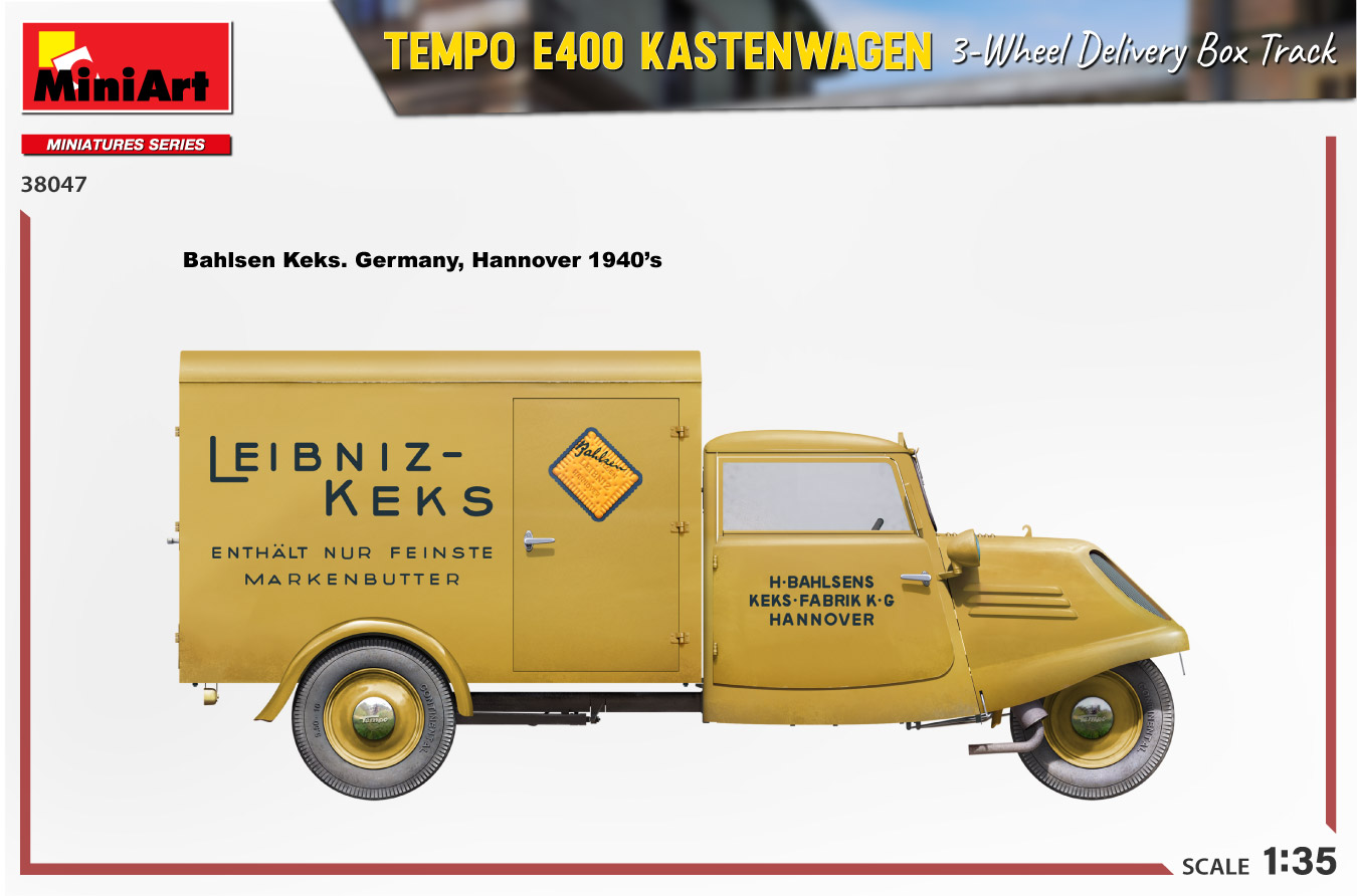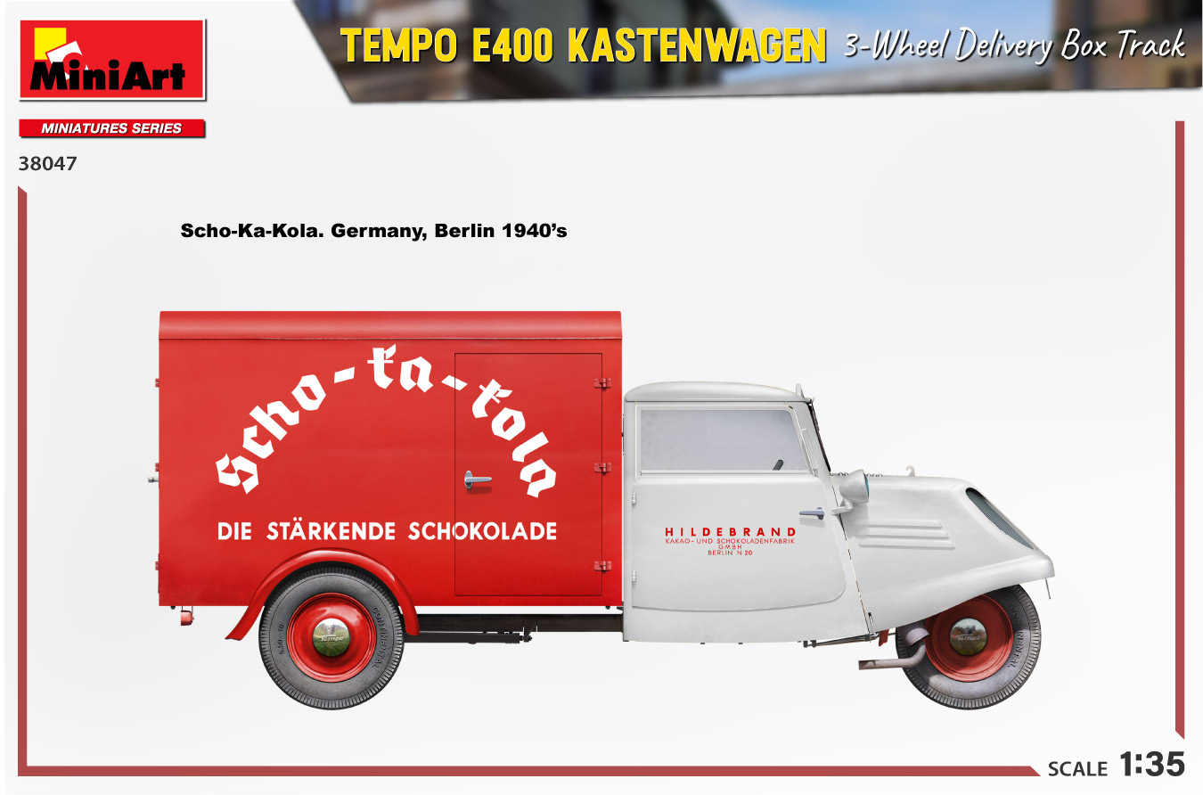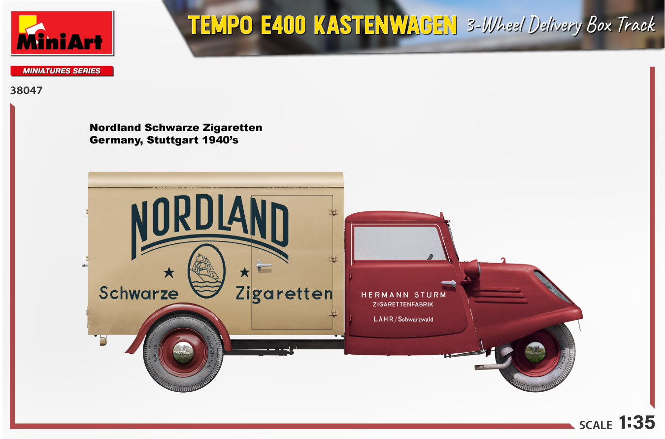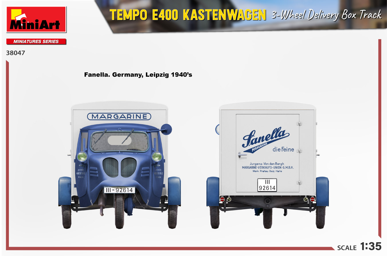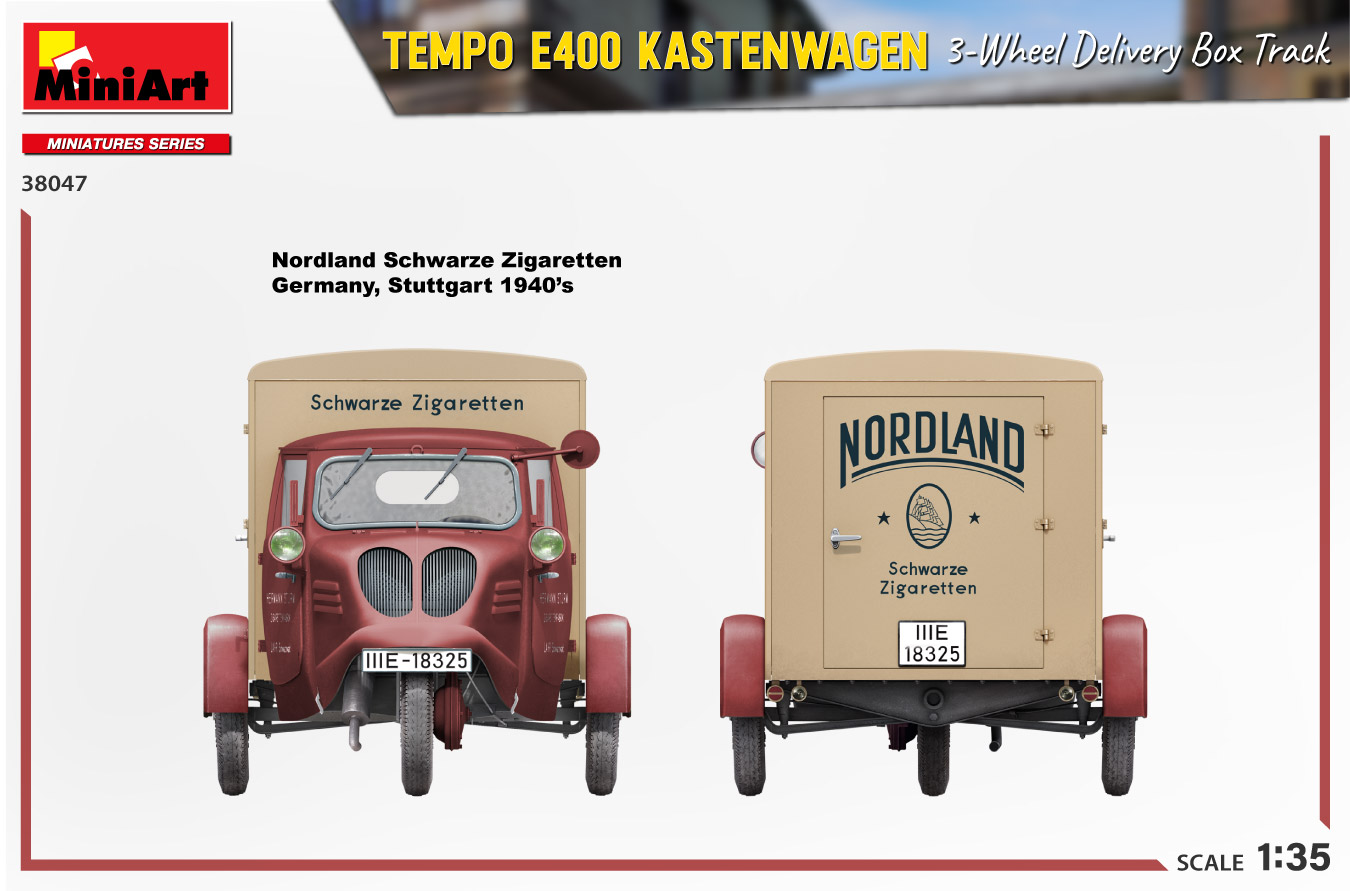 MiniArt nous apporte un kit de maquette à l’échelle 1/35 du camion de livraison à trois roues Tempo E400 Kastenwagen ! Les portes peuvent être construites ouvertes ou fermées; Des pièces transparentes et des pièces photogravées sont incluses, tout comme des décalcomanies pour quatre versions.