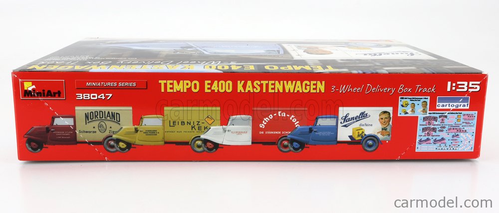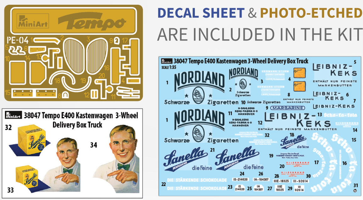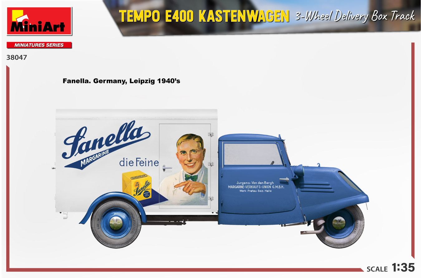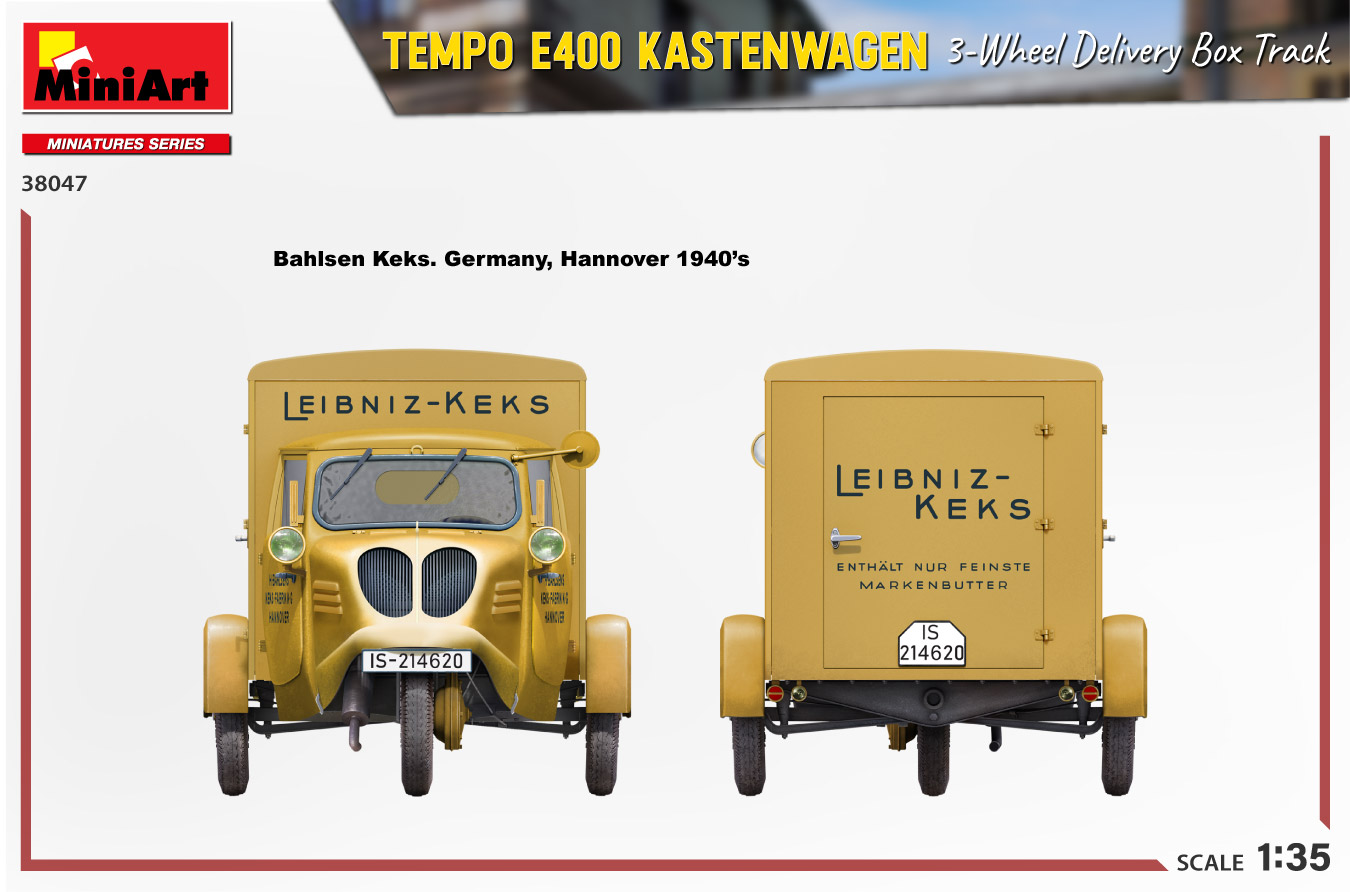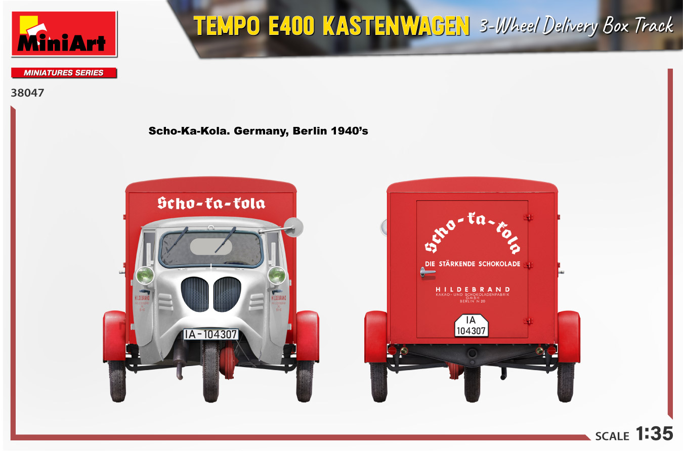 MiniArt nous apporte un kit de maquette à l’échelle 1/35 du camion de livraison à trois roues Tempo E400 Kastenwagen ! Les portes peuvent être construites ouvertes ou fermées; Des pièces transparentes et des pièces photogravées sont incluses, tout comme des décalcomanies pour quatre versions.