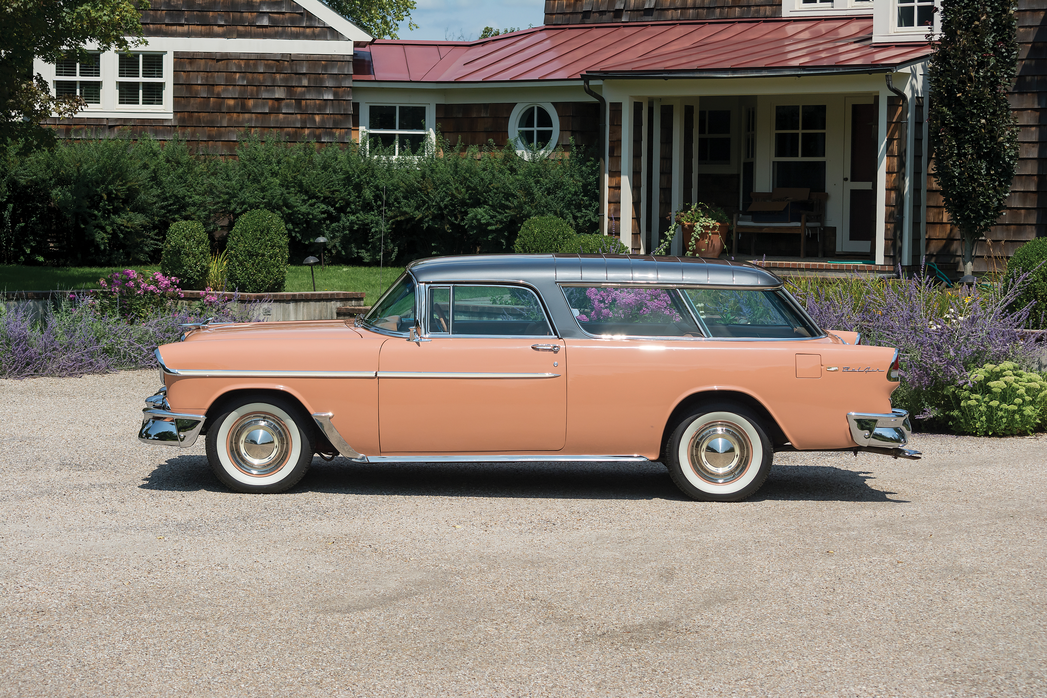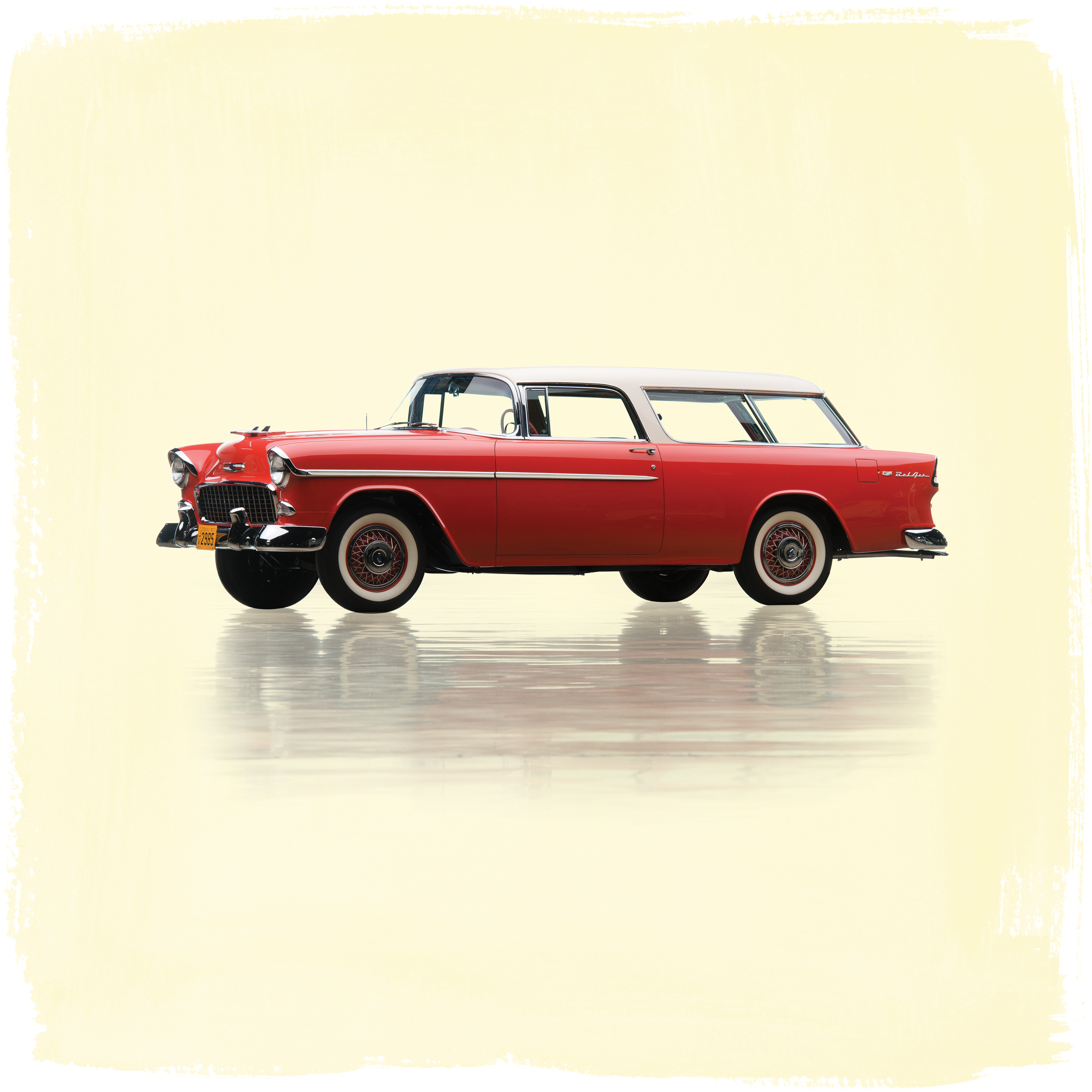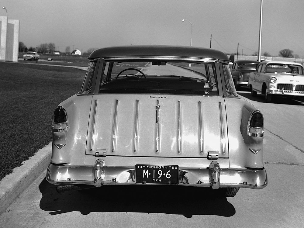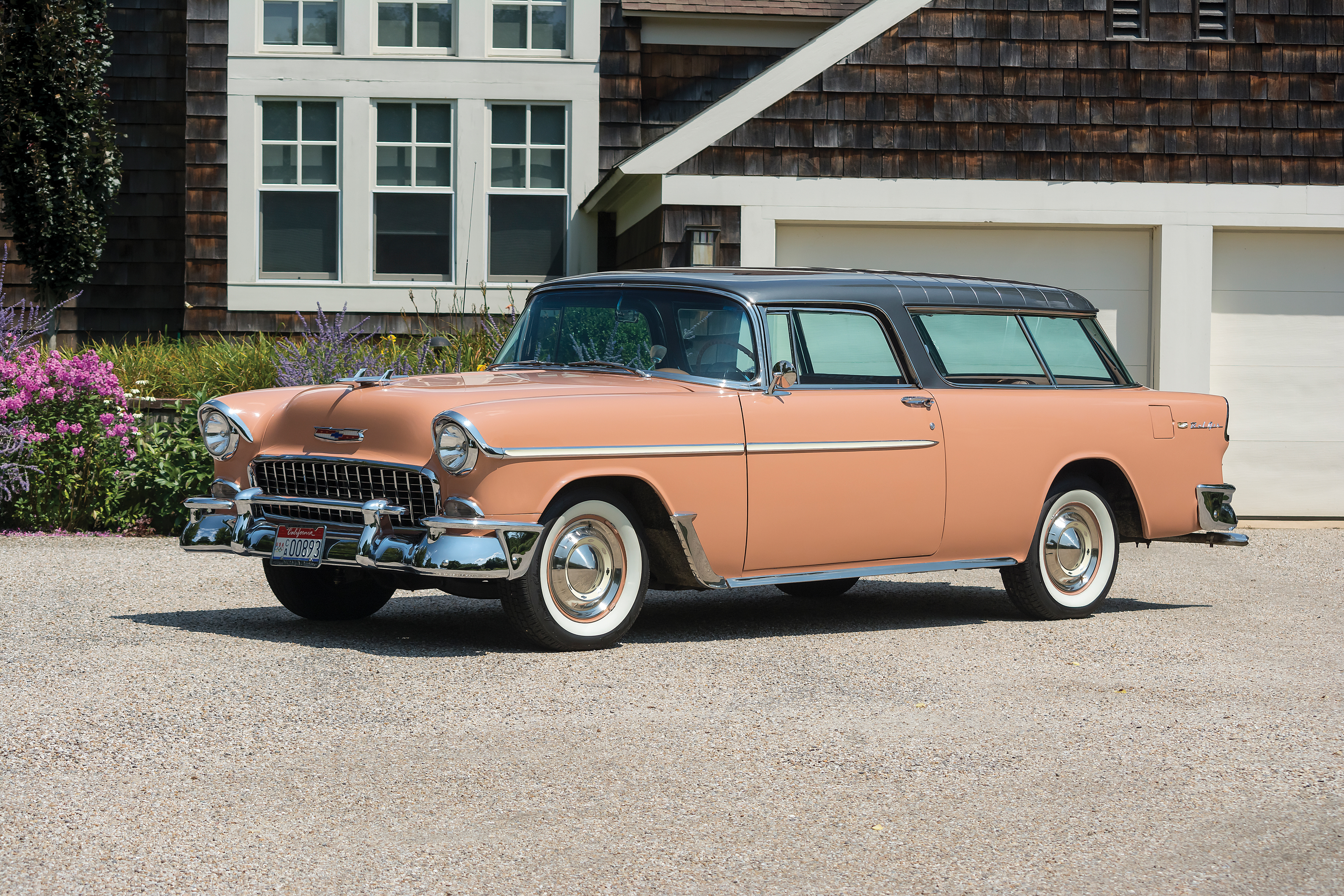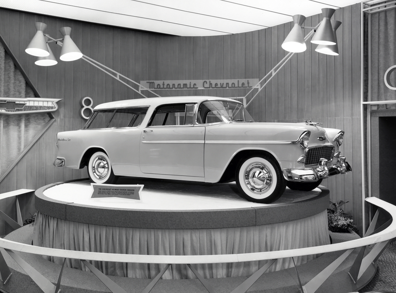 Les Chevrolet ont reçu un tout nouveau style. Annoncée comme « The Hot One », la nouvelle Chevrolet carrée était nette, propre et complètement moderne, et sa popularité était partagée avec les Chevrolet Tri-Five de cette génération. Les Nomad, comme les Bel Air, étaient chargés de tapis intérieur, de lances chromées sur les ailes avant, de moulures de vitres chromées et d'enjoliveurs complets. Pour 1955, les Chevrolet ont acquis une option de moteur V8. Le nouveau V8 de 4,3 litres était doté d'une soupape en tête moderne, à haute compression et à course courte qui était si bonne qu'elle est restée en production sous diverses formes pendant de nombreuses décennies. Le V8 de base avait un carburateur à 2 cylindres et était évalué à 162ch (121kW), et l'option « Power Pack » comprenait un carburateur à 4 cylindres et d'autres améliorations produisant 180ch (134kW). Plus tard dans l'année, une option « Super Power Pack » a ajouté une compression élevée et 15ch supplémentaires (11kW). Il avait de la place pour 6 passagers.