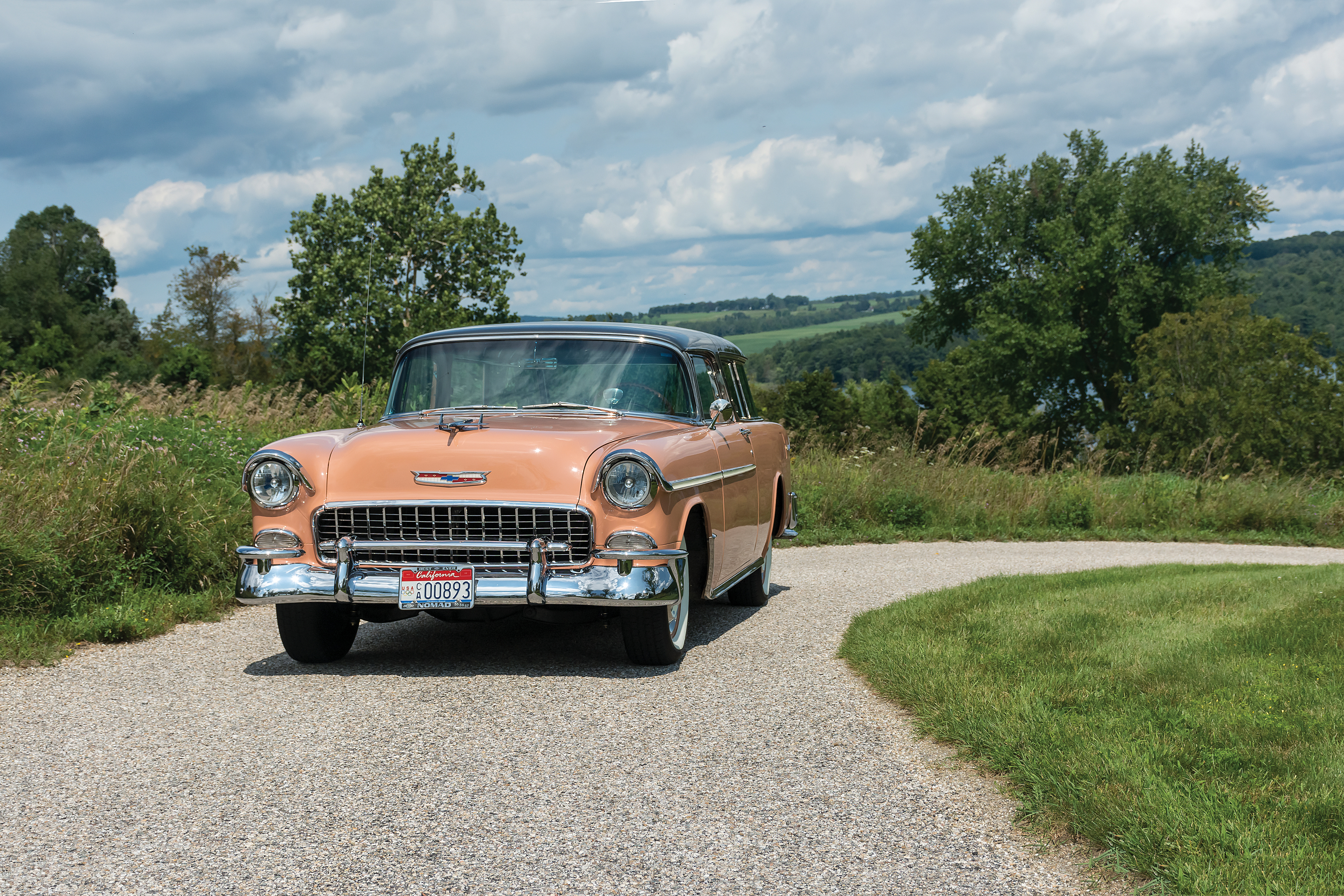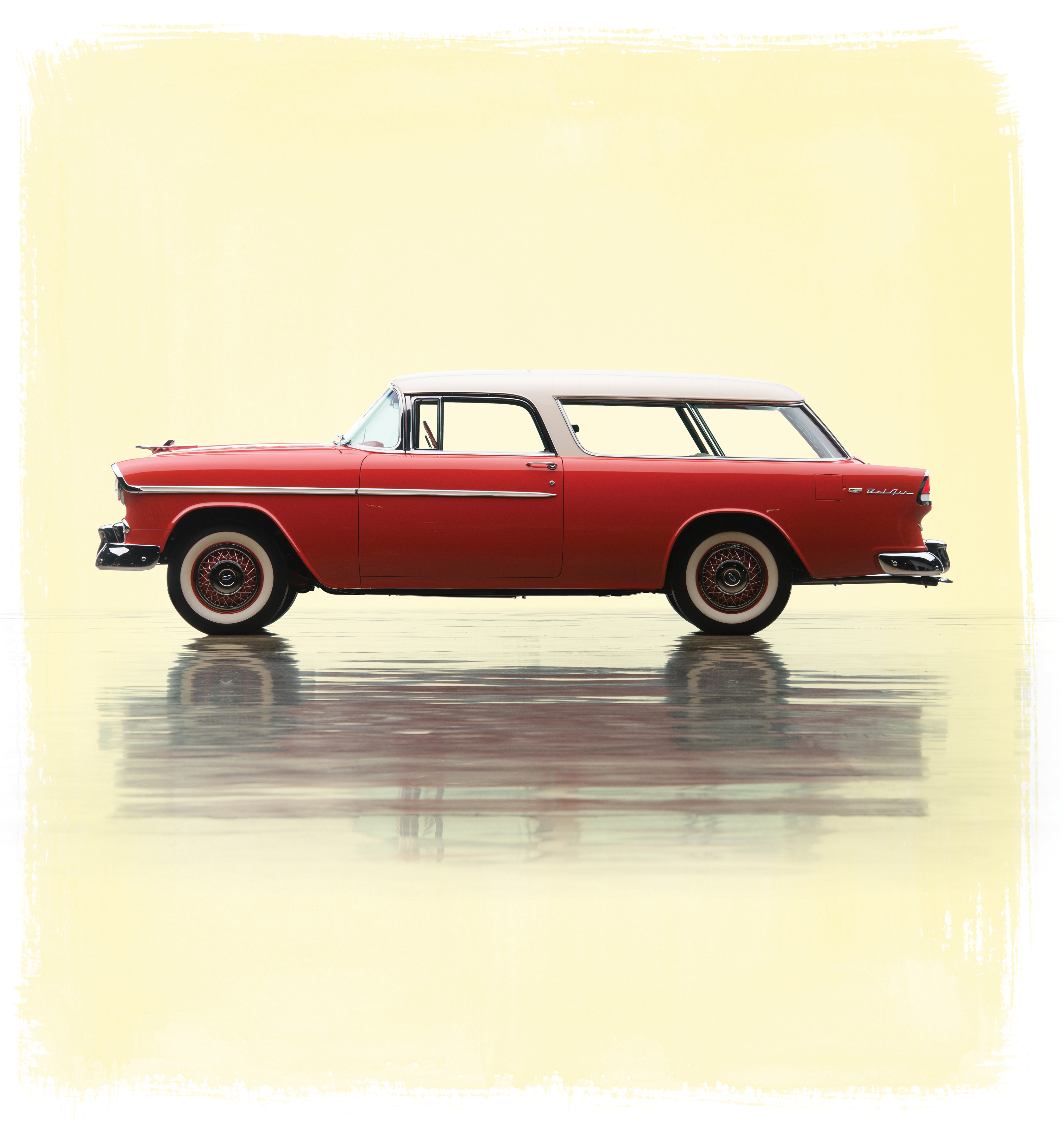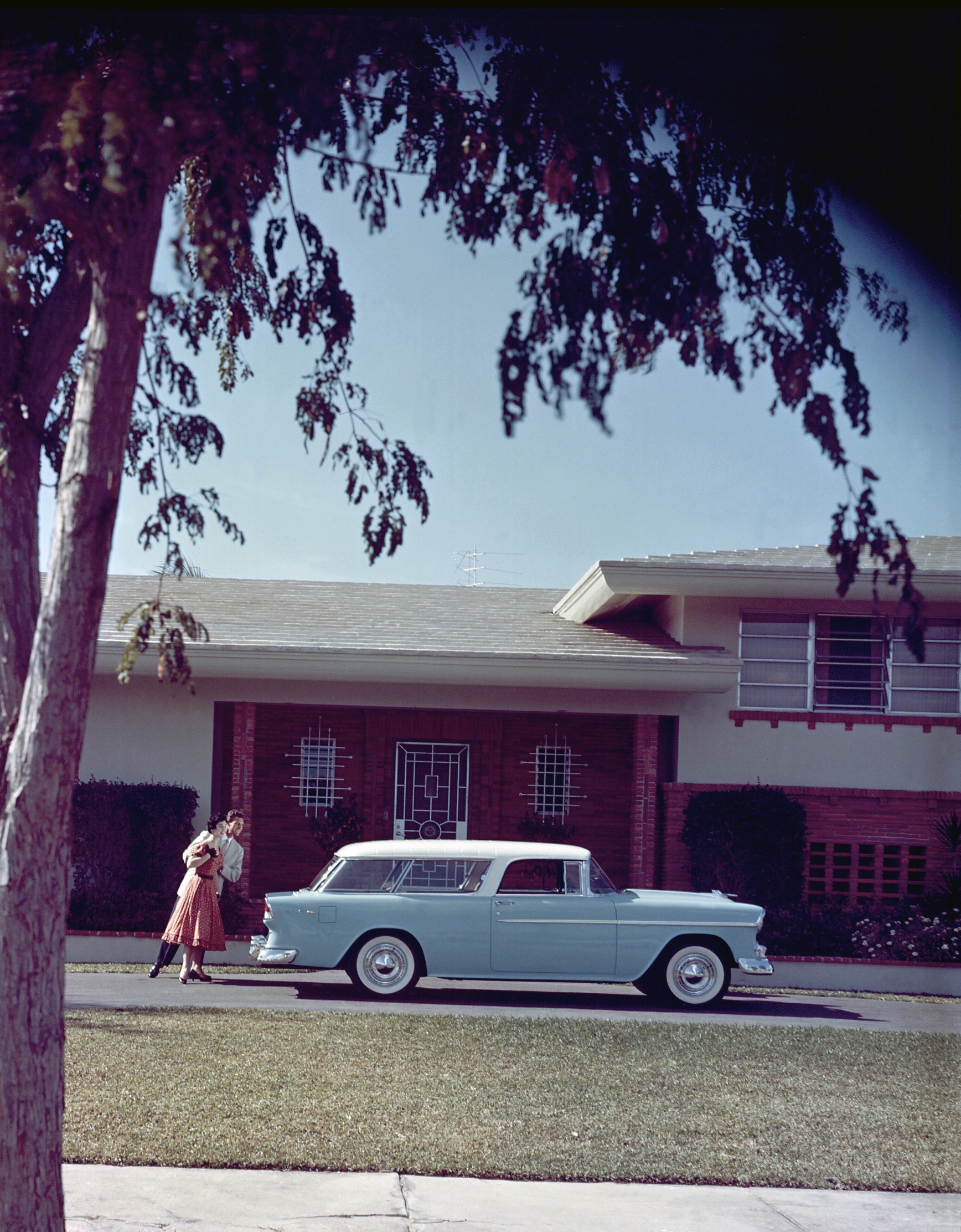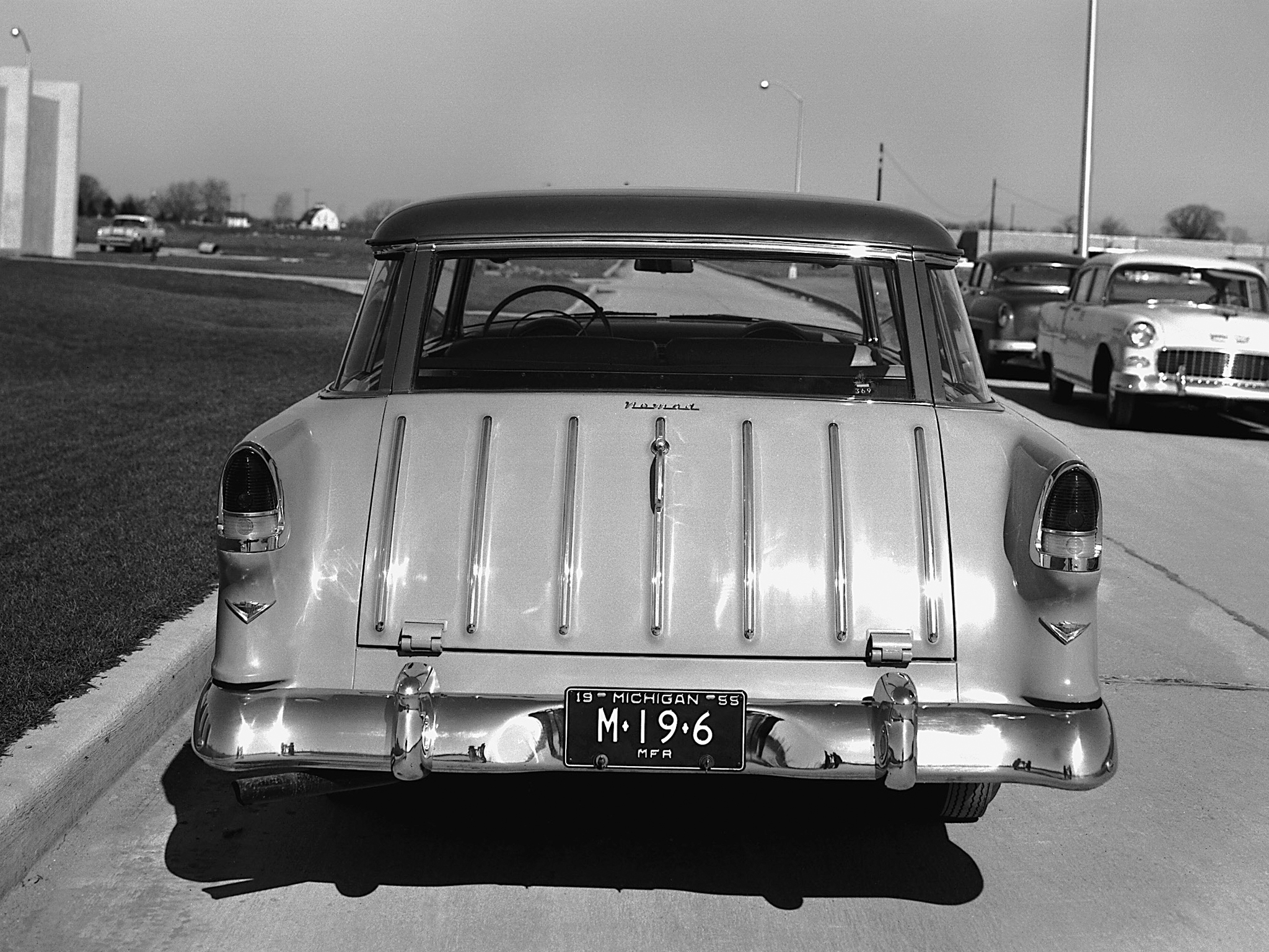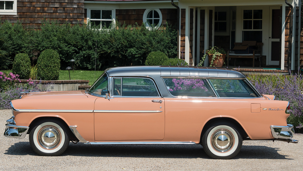 Les Chevrolet ont reçu un tout nouveau style. Annoncée comme « The Hot One », la nouvelle Chevrolet carrée était nette, propre et complètement moderne, et sa popularité était partagée avec les Chevrolet Tri-Five de cette génération. Les Nomad, comme les Bel Air, étaient chargés de tapis intérieur, de lances chromées sur les ailes avant, de moulures de vitres chromées et d'enjoliveurs complets. Pour 1955, les Chevrolet ont acquis une option de moteur V8. Le nouveau V8 de 4,3 litres était doté d'une soupape en tête moderne, à haute compression et à course courte qui était si bonne qu'elle est restée en production sous diverses formes pendant de nombreuses décennies. Le V8 de base avait un carburateur à 2 cylindres et était évalué à 162ch (121kW), et l'option « Power Pack » comprenait un carburateur à 4 cylindres et d'autres améliorations produisant 180ch (134kW). Plus tard dans l'année, une option « Super Power Pack » a ajouté une compression élevée et 15ch supplémentaires (11kW). Il avait de la place pour 6 passagers.
