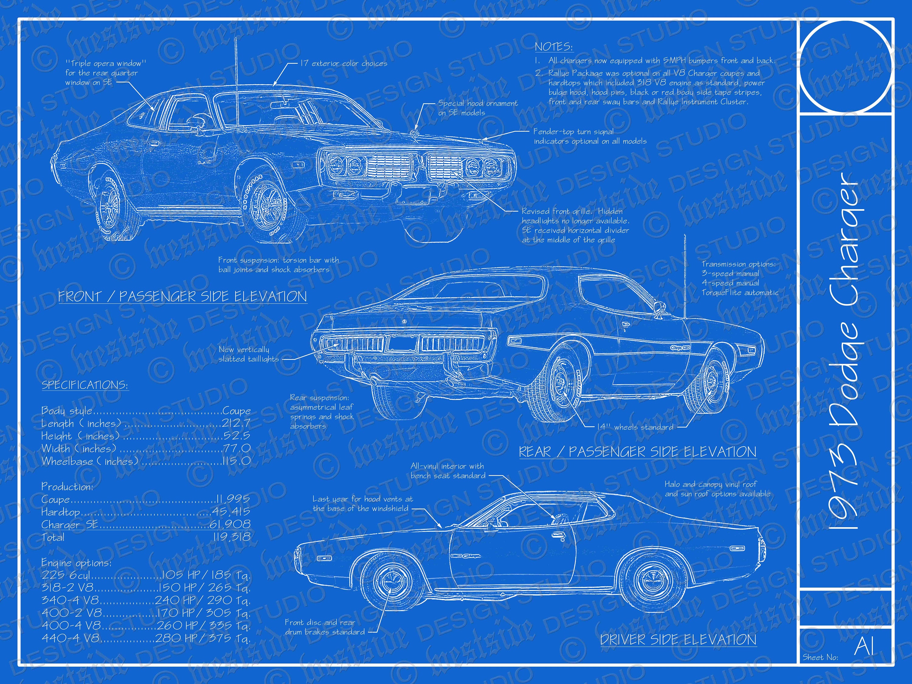 Pour 1973, les Charger recevaient une nouvelle carrosserie (bien que, à première vue, seul le toit arrière « C-Pillars » soit différent), ils étaient en fait plus longs, plus larges et légèrement plus hauts que ceux de 1971-1972. Les feux arrière à lattes verticales et les grilles étaient également nouveaux. Les phares cachés ont été abandonnés, même en option. La 318 était toujours standard, avec les modèles 340 (disponible uniquement sur la Rallye), 360 (2 corps uniquement), 400 (faible puissance 2 corps/échappement simple et haute perforance 4 corps/double échappement) et 440 restant en option. Les modèles SE avaient un nouveau traitement de toit comportant une « triple fenêtre opera » entourée d'un toit en vinyle. Tous les autres modèles ont eu un nouveau traitement de fenêtre, supprimant la fenêtre de style AMC Gremlin au profit d’une conception plus conventionnelle. Les ventes totales cette année ont été d’environ 108'000 unités, ce qui représente le record pour la génération 1971-1974, bien que plus de 60% des voitures soient équipées de moteurs non hautes performances. Les Charger de 1973 et tous les produits Chrysler étaient équipés de pare-chocs de 8km/h à l'avant et à l'arrière.