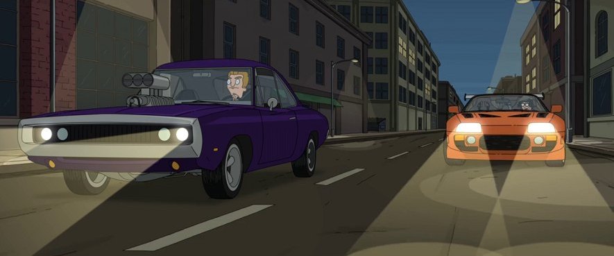 une Dodge Charger R/T 1970 dans l'épisode 6 de la saison 1 (Festival de glands (Vegetable Funfest)).
