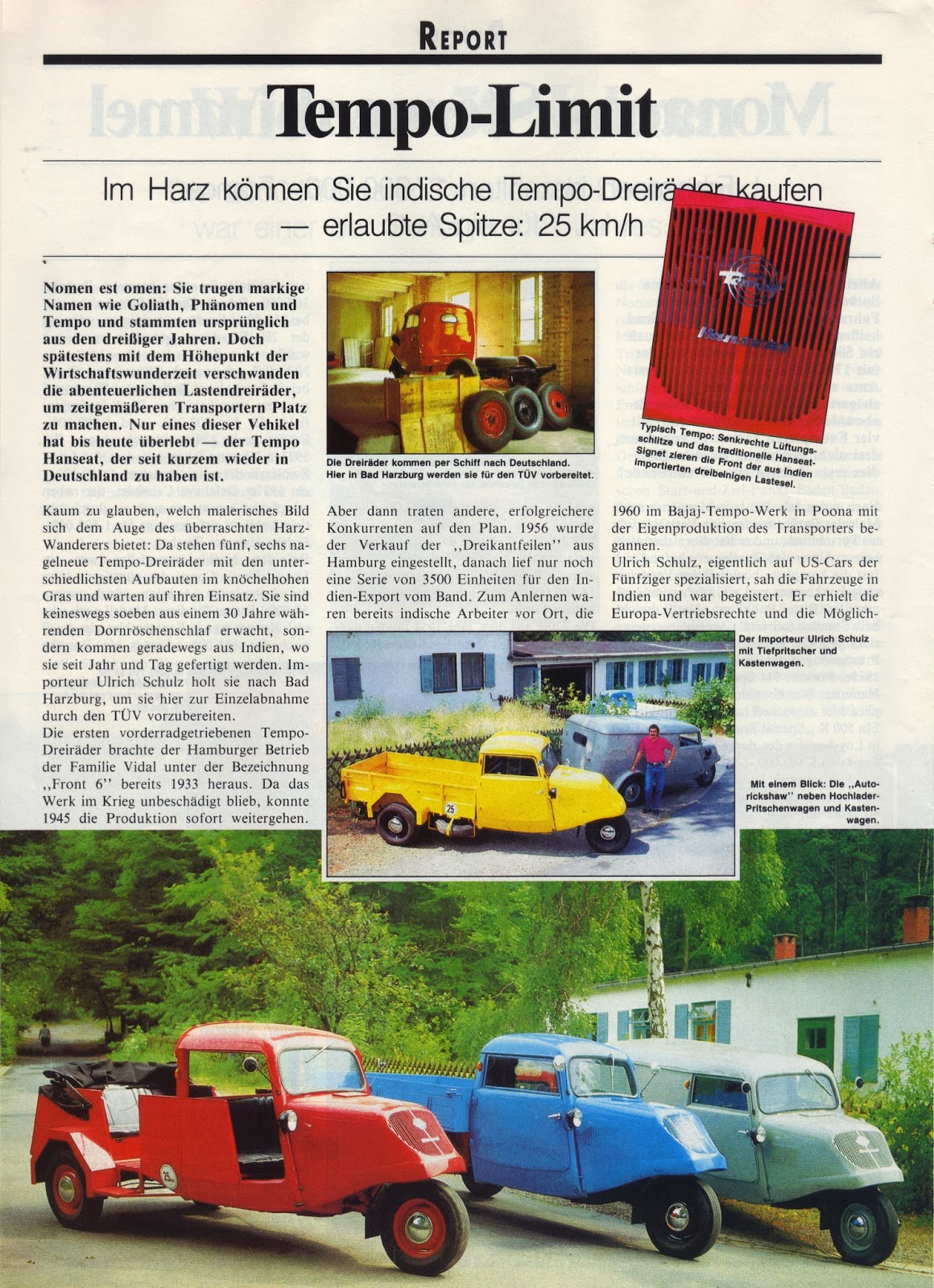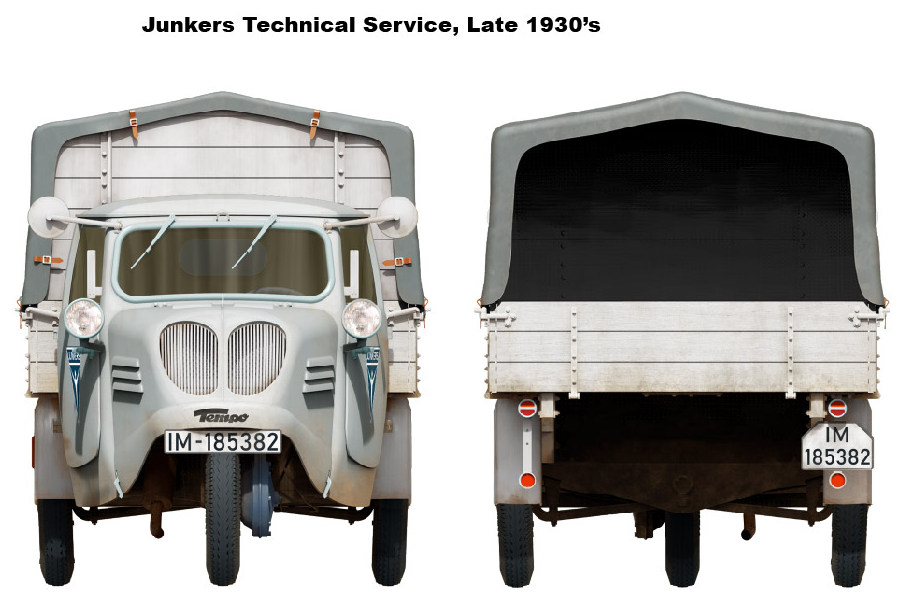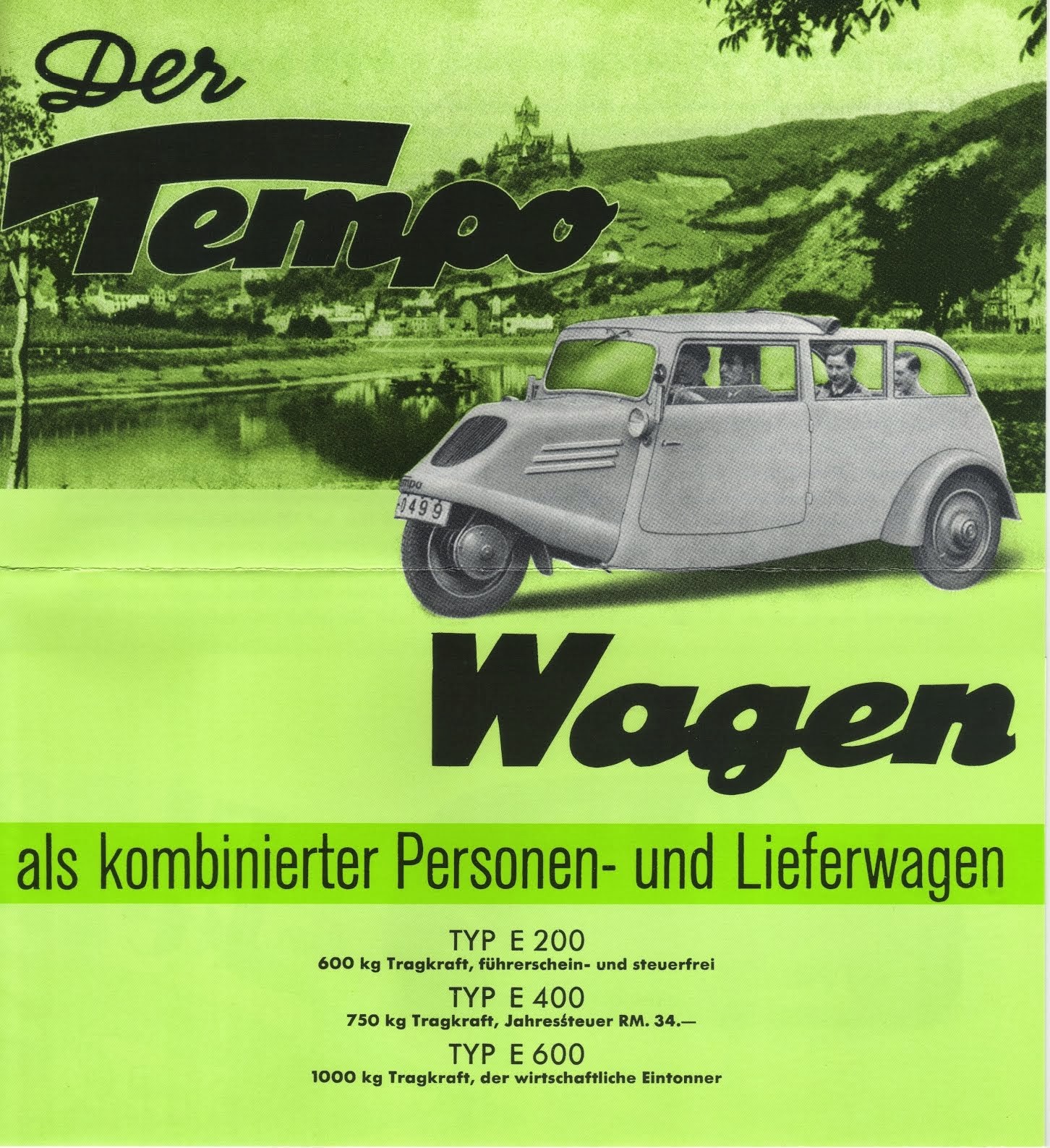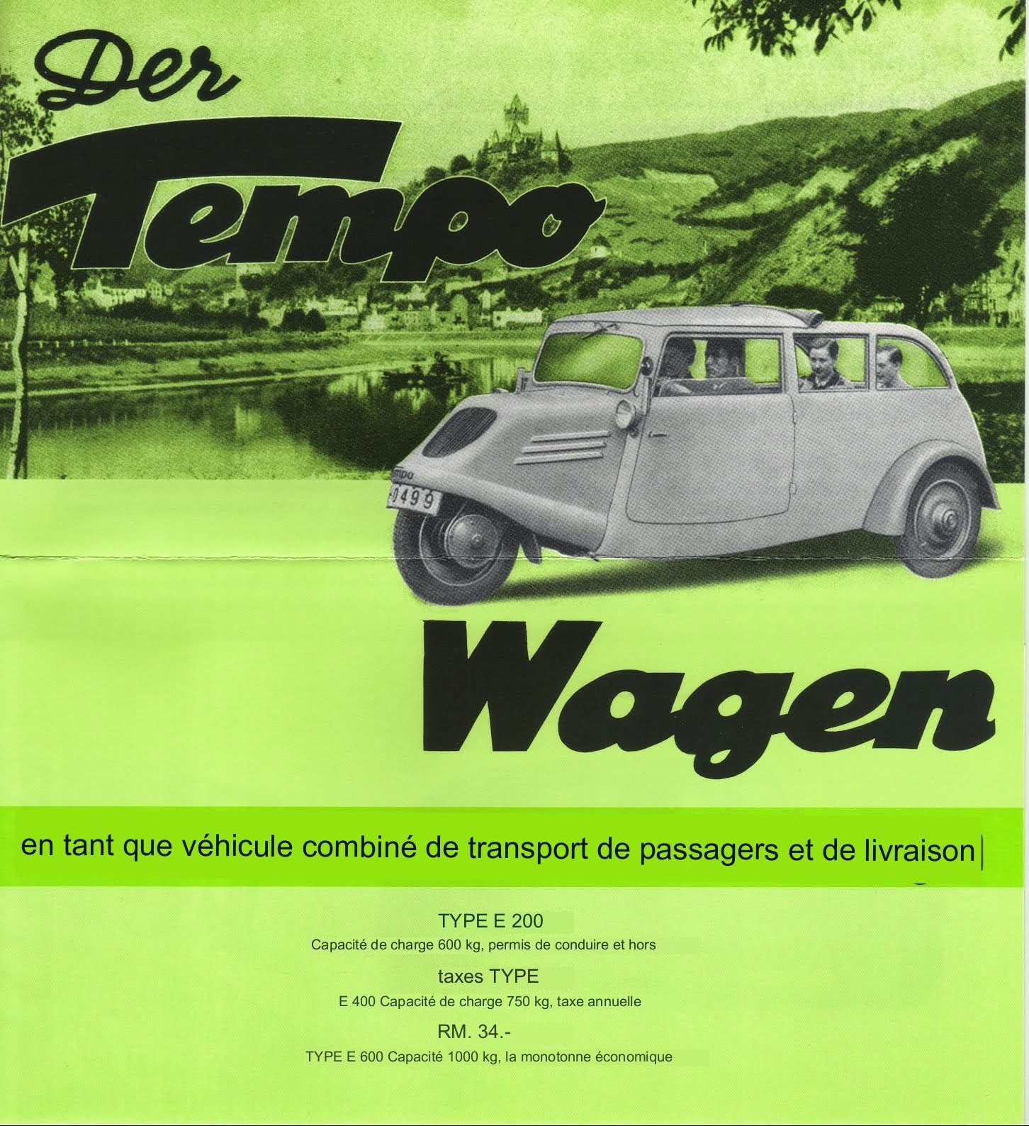 Les premiers tricycles Tempo T1 ont été créés à partir d'un mélange de moto et d'un plateau, qui se trouvait devant le conducteur. Dans le développement ultérieur, le poste de conduite a été déplacé à l'avant. Les tricycles Tempo étaient équipés de moteurs Otto monocylindre ou bicylindre à 2 temps. En 1938, le Tempo A de 400cm3 développait 12ch. Le moteur entraînait la roue avant par l'intermédiaire d'une chaîne.