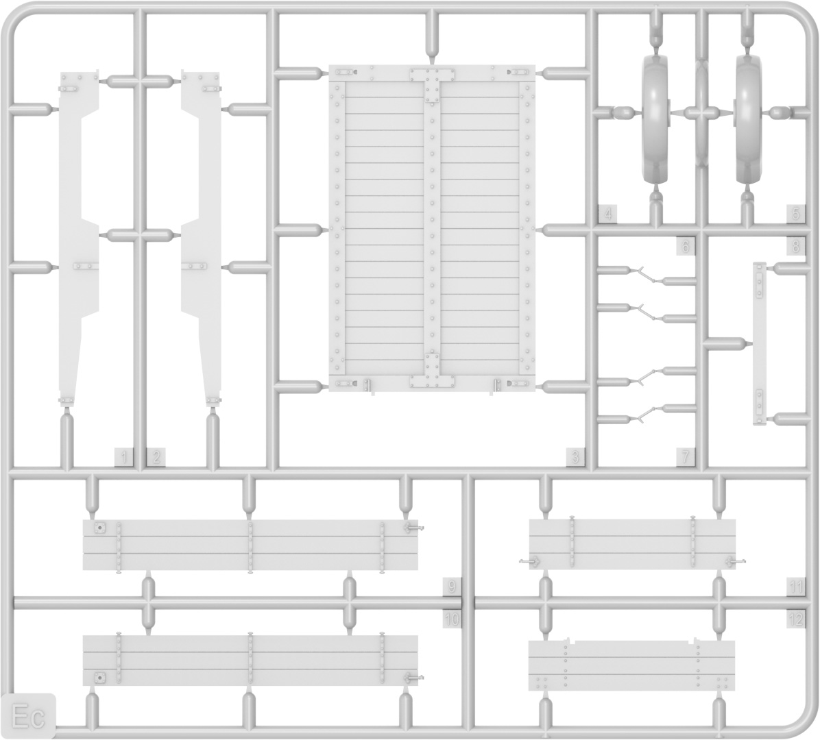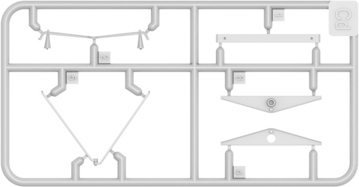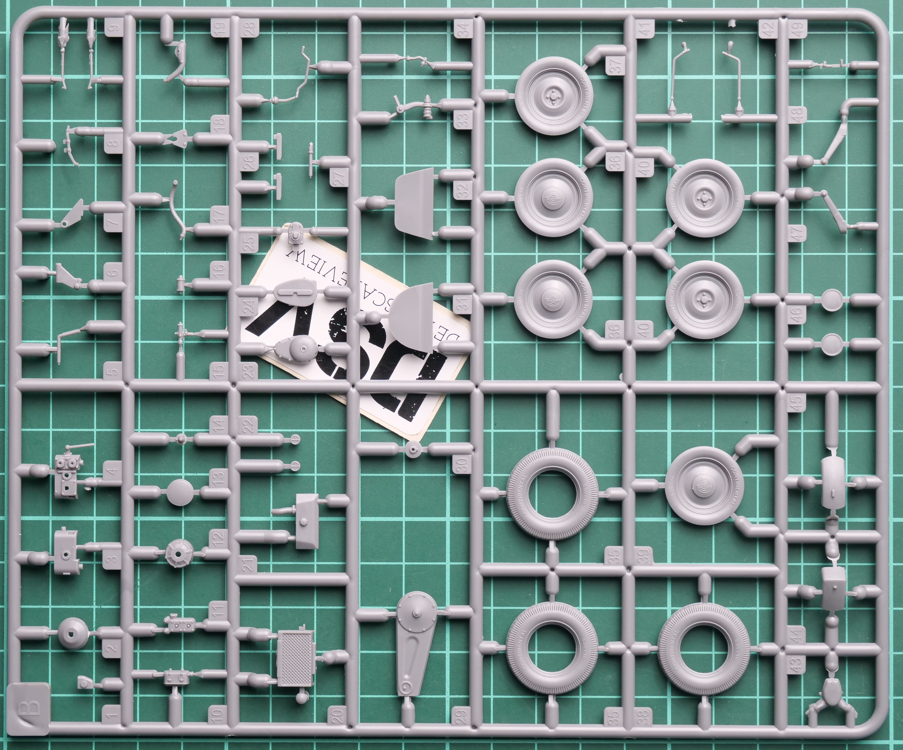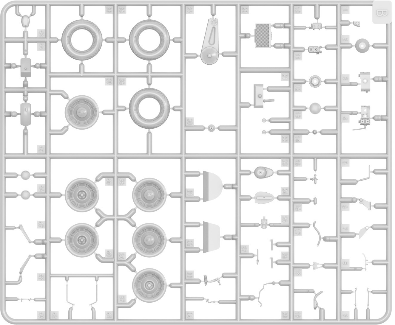 La première grappe est dédiée au mélange de différentes pièces - vous trouverez ici des roues et des mèches de moteur. Notez que les roues sont moulées ensemble avec les parois des pneus, il sera donc nécessaire de découper quelques gabarits de peinture.