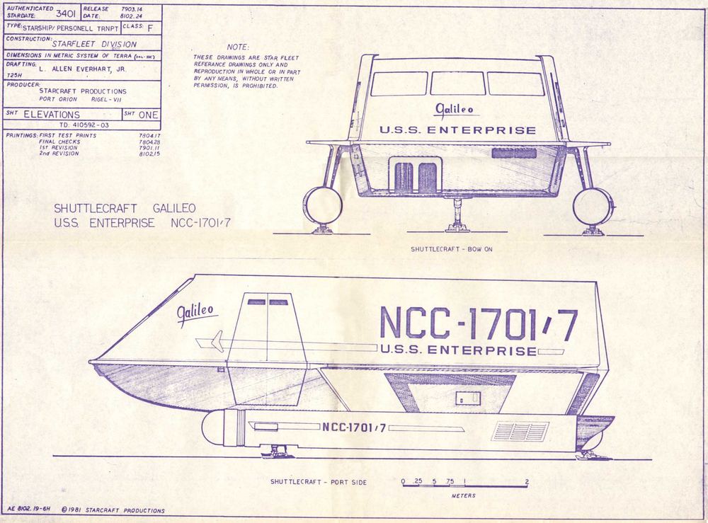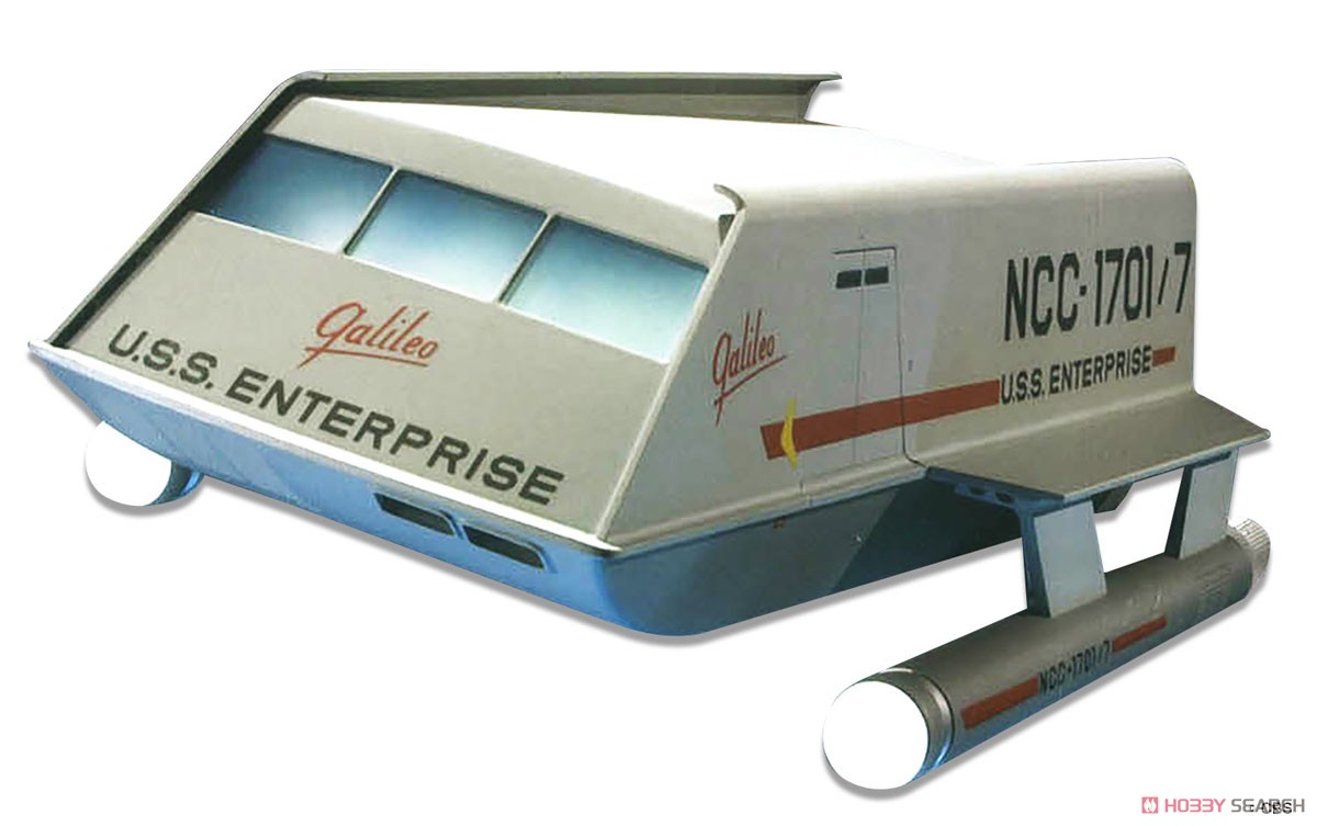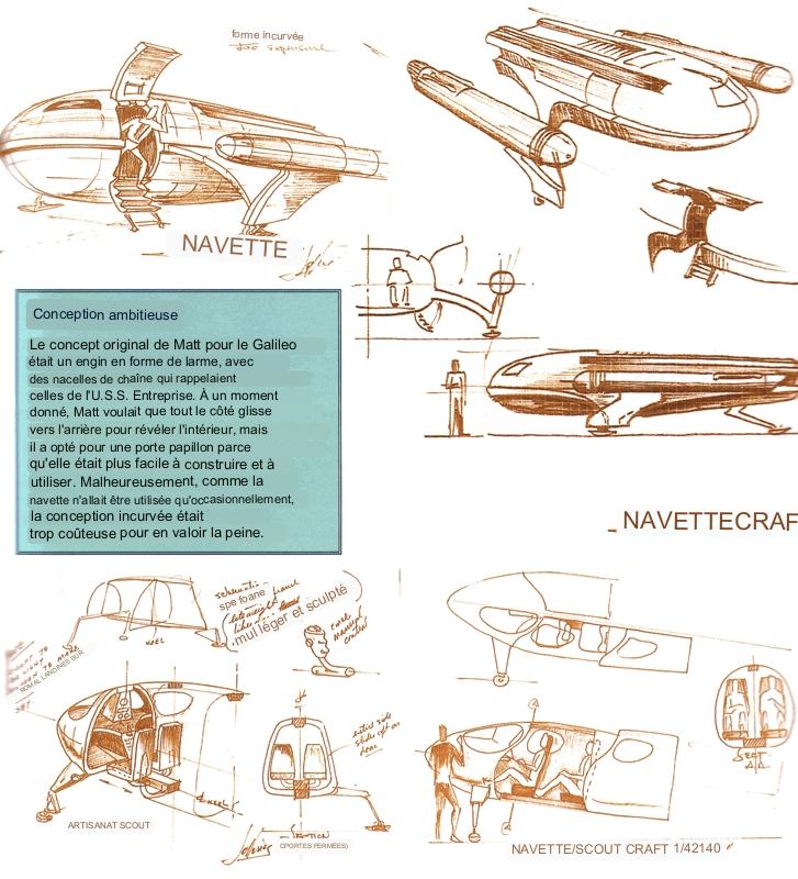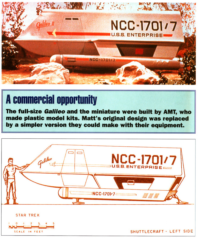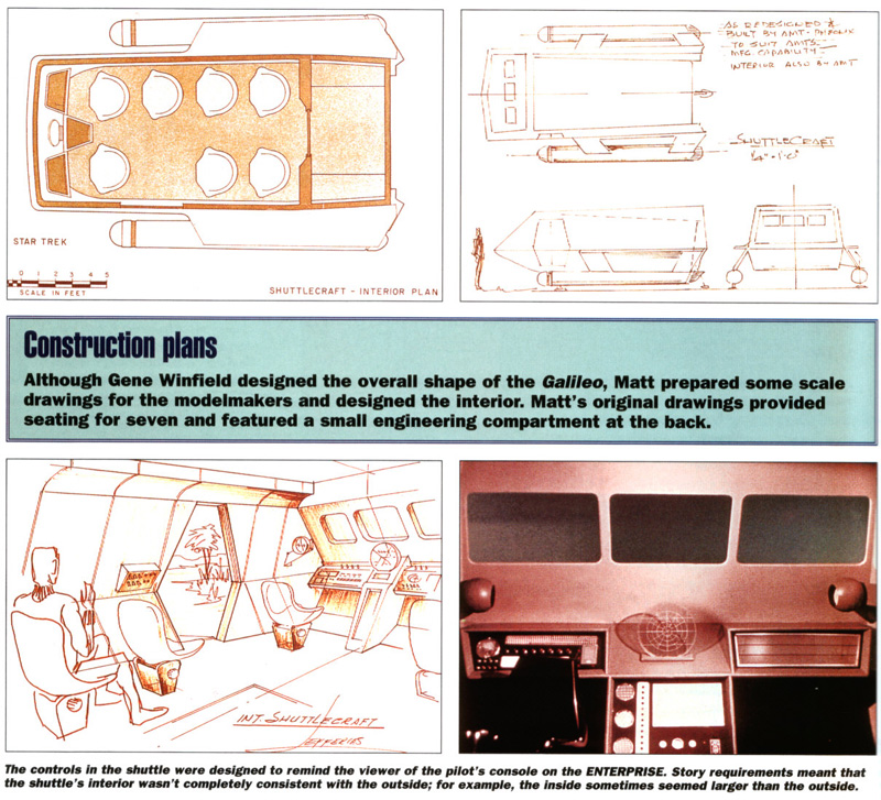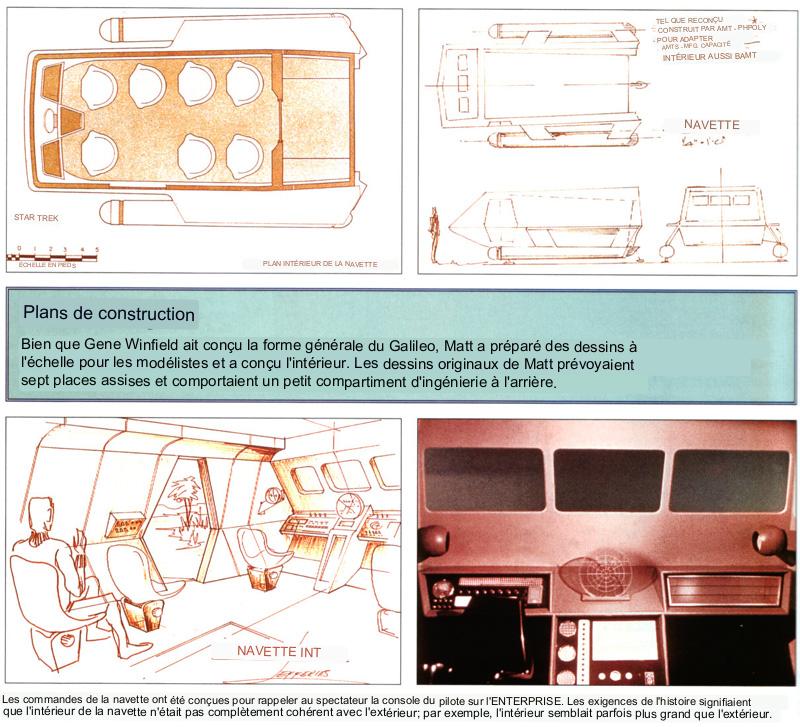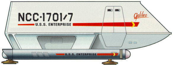 La navette du USS Enterprise NCC-1701, le Galileo, n’a pas été conçue en même temps que le reste du navire. La raison est simple : les navettes ne sont pas construites tant qu’un scénario n’en appelle pas, car elles sont tout simplement trop chères. On n’a donc pas demandé à Jefferies de produire l’un de ces petits vaisseaux à courte portée avant que « Galilée ne répond plus » (s1e16, The Galileo Seven) ne soit écrit. « L’Enterprise n’a jamais été censé reposer sur la surface d’une planète », dit-il, « nous avions donc besoin d’autre chose que la salle des transporteurs. Je pense, en y regardant plus tard, que cela aurait probablement dû être une navette comme un bus urbain, parce que plusieurs fois un script est apparu qui appelait plus de gens que nous n’avions de places pour ! ».