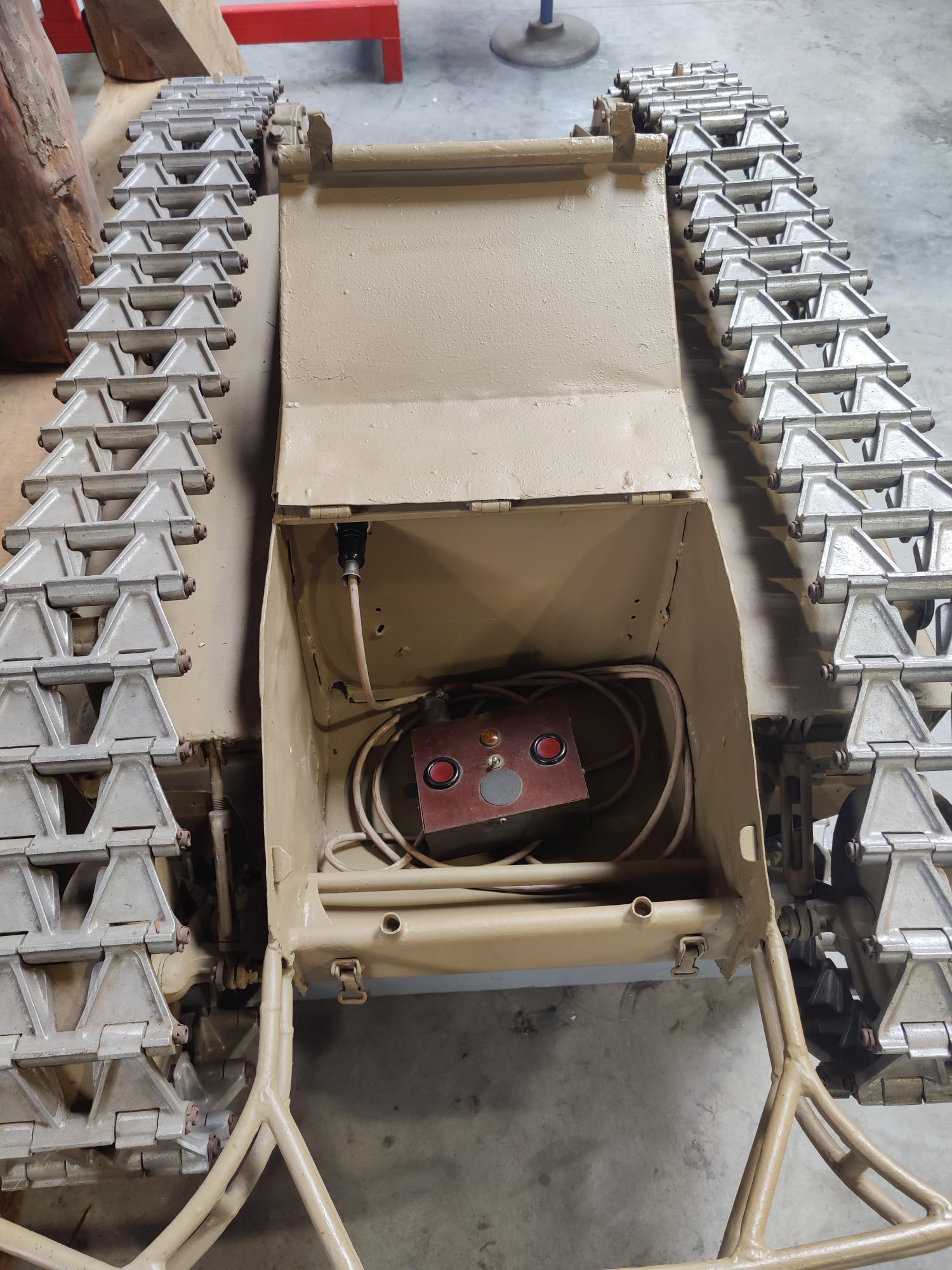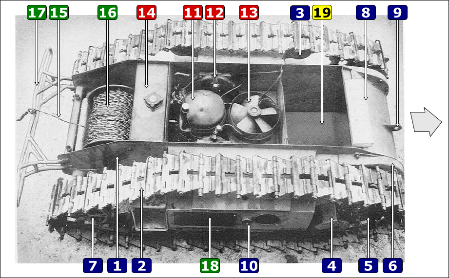Cette photo représente l'intérieur d'un Goliath Sd. Kfz. 303 (à moteur thermique). La flèche indique le sens de déplacement de l'engin.