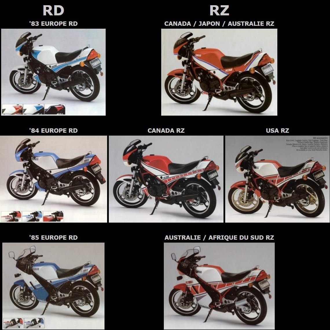 Dans de nombreux pays, ces moto étaient connues sous le nom de RD, mais en Amérique du Nord et en Australie, elles étaient appelées RZ. En Australie, en Angleterre, au Canada et aux États-Unis, la série Yamaha RD (RD60, RD125, RD200, RD250, RD350, RD400) dont descendent les dernières RZ/RD, a été lancée pour la première fois dans les années 1970 en tant que 2 temps refroidis par air. En 1980, les motos ont été redessinées en utilisant des idées que Yamaha a acquises lors des Grands Prix à 2 temps et des expériences de course de production. Elles ont également été refroidies par liquide et ont été ajoutées à leur nom pour désigner cela, par exemple : RD350LC - certaines personnes les appelaient les « Elsie » (LC en anglais). Le LC est le lien entre les anciennes RD refroidies par air et la série RZ équipée d’une soupape de puissance (YPVS) plus récente. Les cylindrées les plus couramment vendues en Australie étaient de 250cm³ (capacité maximale autorisée pour les nouveaux motocyclistes sur route) et de 350cm³.