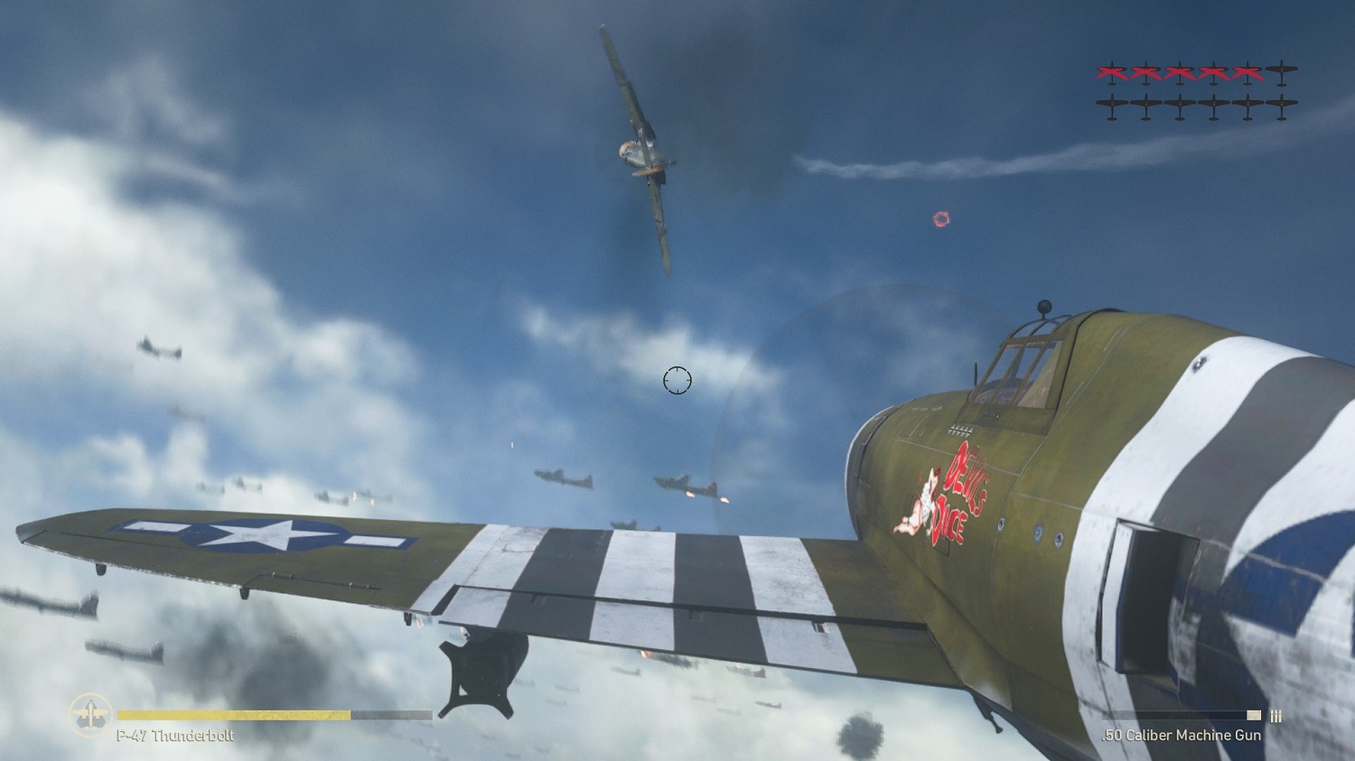 Parmi les autres attributs positifs, citons la robustesse du P-47 ; son moteur à pistons radiaux avait une tolérance élevée aux dommages par rapport aux moteurs refroidis par liquide, tandis que sa grande taille signifiait qu’il pouvait subir une grande quantité de dommages tout en étant capable de ramener son pilote à la base. Avec 8 mitrailleuses de 12,7 mm, le P-47 avait plus de puissance de feu que les autres chasseurs américains monomoteurs. Les pilotes de P-47 ont revendiqué 20 chasseurs à réaction Messerschmitt Me 262 de la Luftwaffe et 4 bombardiers à réaction Arado Ar 234 en combat aérien.