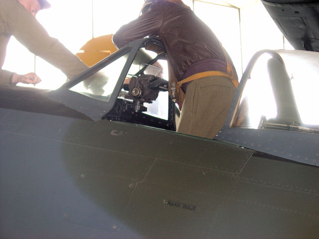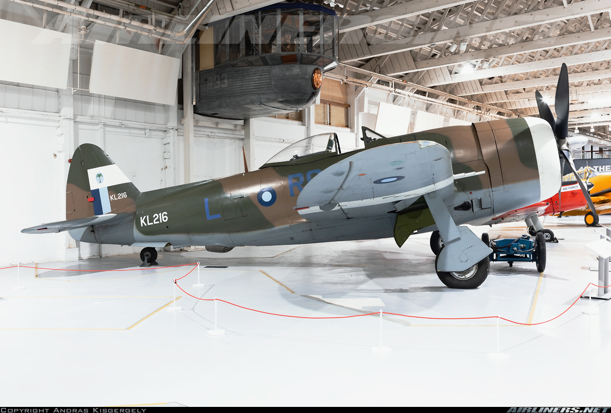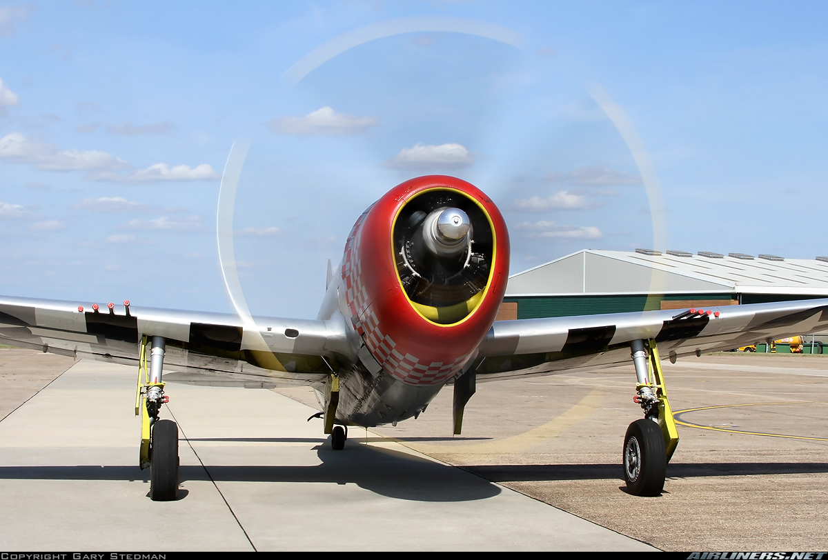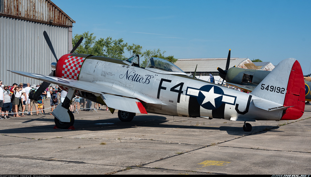 un Republic P-47D Thunderbolt. Sur le tarmac, il y a un P-47D immatriculé G-THUN, c/n 399-55731 construit en 1945, porté sous le numéro de série 45-49192 pendant son service militaire. En état de navigabilité et entretenu par The Fighter Collection à l’aérodrome de Duxford (---/EGSU).