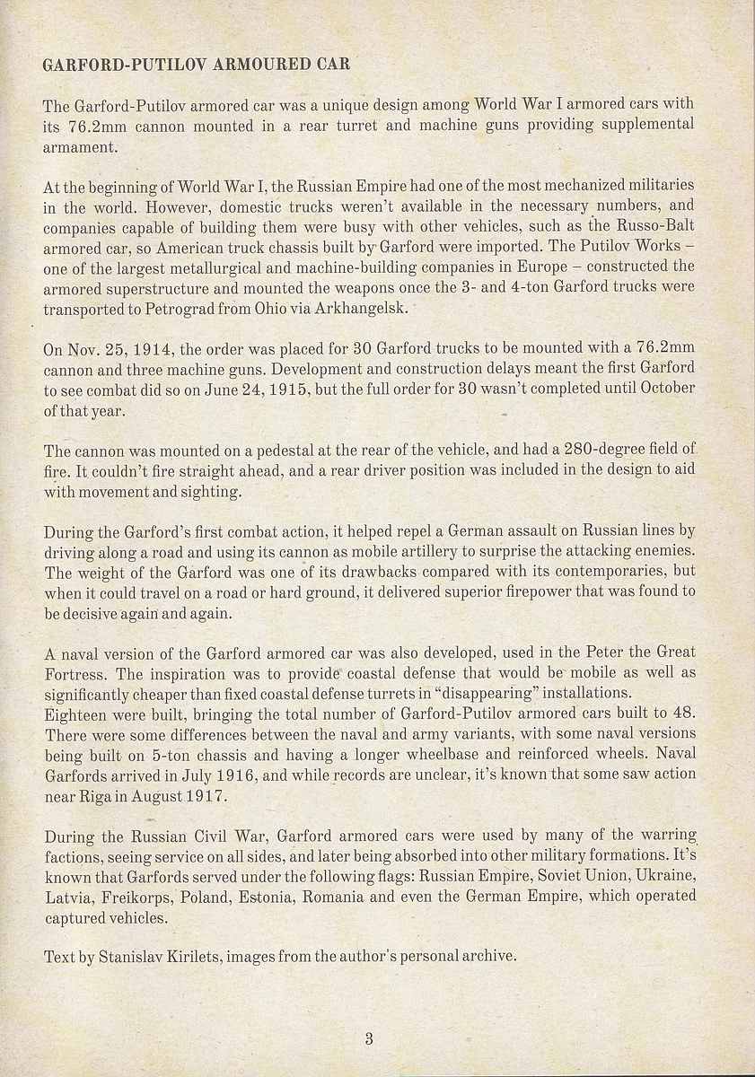 À partir de 1915, les véhicules blindés Garford-Putilov ont été utilisés par des unités de l’armée impériale russe sur pratiquement toutes les parties du front russo-allemand pendant la Première Guerre mondiale. Malgré la vitesse et les caractéristiques de contrôle quelque peu faibles, en particulier en tout-terrain et sur sol meuble, les Garford étaient populaires parmi les troupes, principalement en raison de leur puissant canon de 76 mm. Les extraits suivants sont tirés de rapports de commandants de pelotons de mitrailleuses mobiles qui ont combattu au front en 1915.
