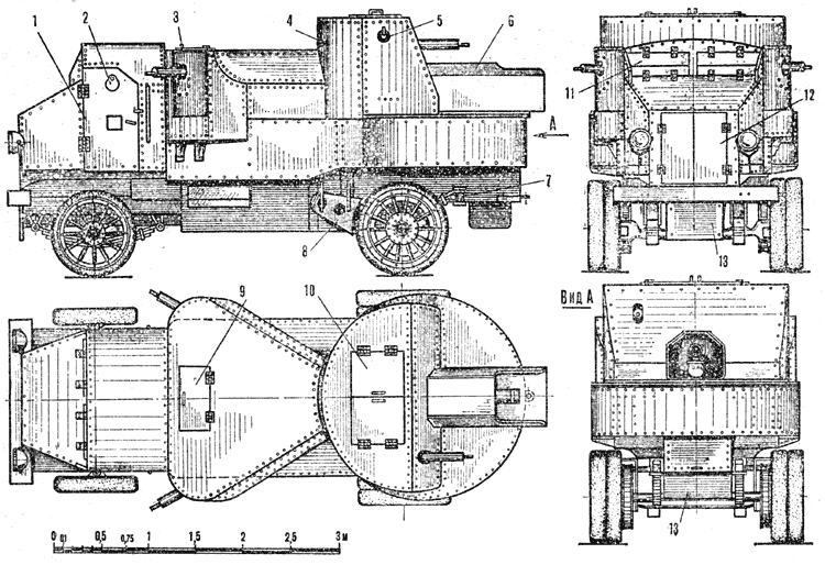 L’usine garantissait la protection contre les balles de fusil perforantes à partir de 150 pas et contre les balles ordinaires à 75 pas. Les batailles ultérieures montreront que le blindage était également capable de résister aux tirs à des distances plus courtes. Les feuilles de blindage étaient rivetées sur le cadre métallique lui-même fixé au châssis. La majorité des feuilles de blindage étaient verticales, bien que quelques éléments de la carrosserie aient une légère inclinaison. La partie fonctionnelle et technique du véhicule blindé a été divisée en 3 sections. Le compartiment de commande se trouvait dans la section avant. Le moteur était recouvert d’un capot blindé et la partie avant avait des portes blindées battantes pour accéder au radiateur. Les sièges du conducteur et du commandant étaient situés respectivement à gauche et à droite, au-dessus du moteur et du réservoir de carburant. C’était extrêmement dangereux mais cela permettait de raccourcir la longueur totale du véhicule. Pour l’observation, le conducteur et le commandant avaient des trappes d’observation rectangulaires dans la plaque de blindage avant qui étaient couvertes par des volets de blindage rabattables avec des fentes réglables. Il y avait des trappes d’observation rondes dans les portes blindées situées à gauche et à droite de la carrosserie. Enfin, il y avait une autre trappe dans le toit du compartiment de contrôle qui était utilisée en conduisant sur la route et en dehors du combat.