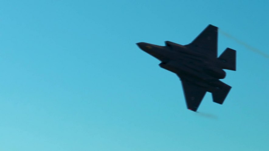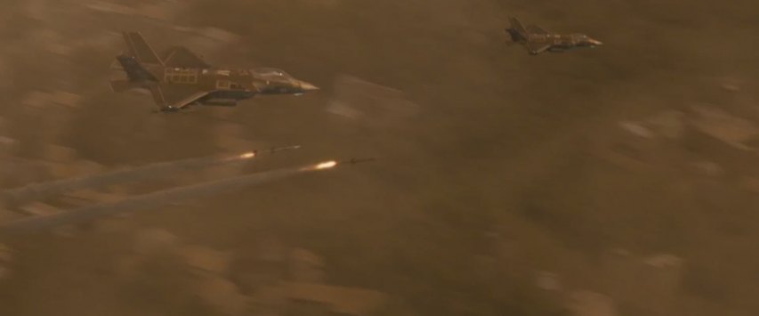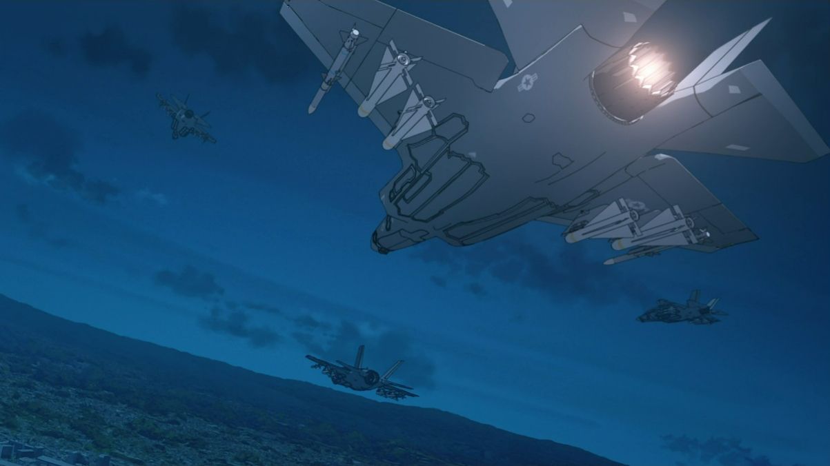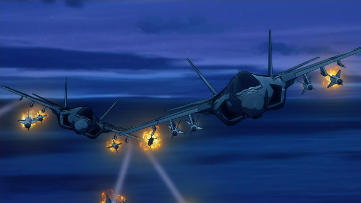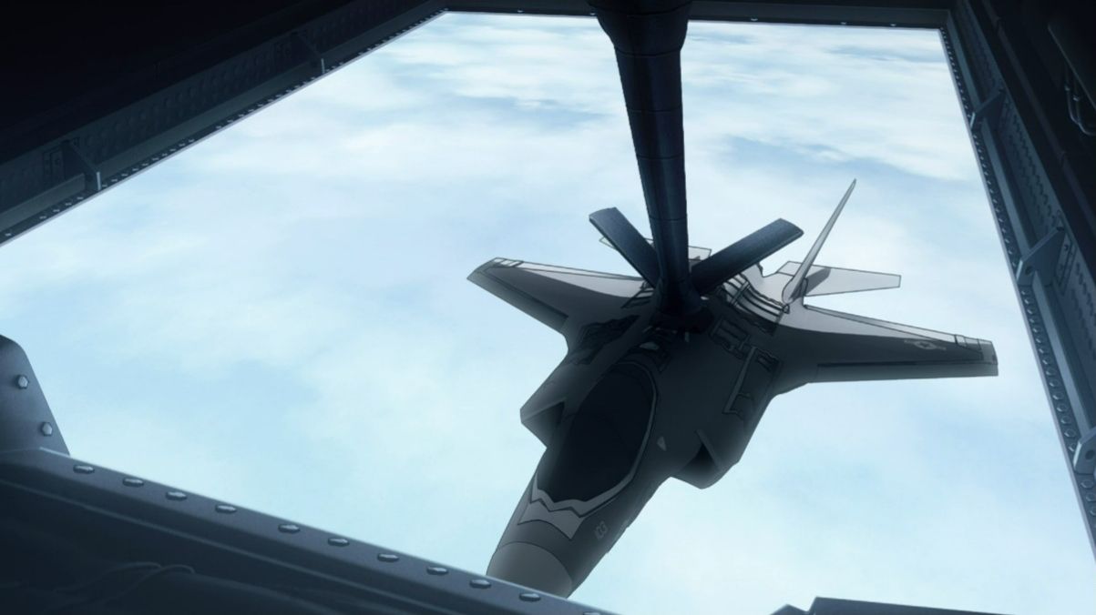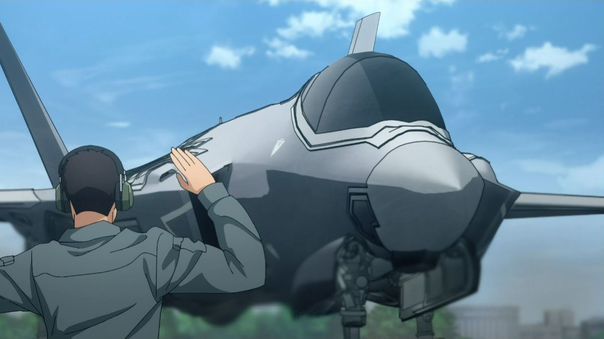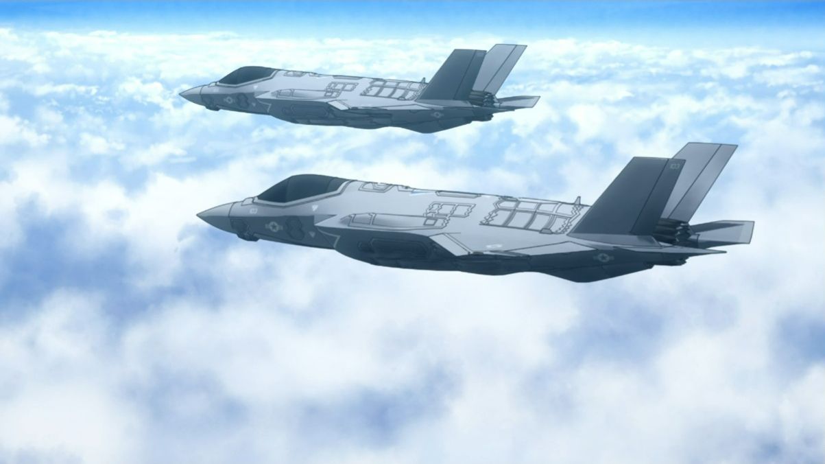 un Lockheed Martin F-35 Lightning II. Le principal avion de combat militaire apparaît dans la plupart des épisodes. Quelques exemples d'épisodes dans les photos suivantes comme l'épisode 6 (Everything Will Be Okay. For I... I Am Bravern! (絶対に大丈夫だ。なぜなら……私がブレイバーンだからだ!)).